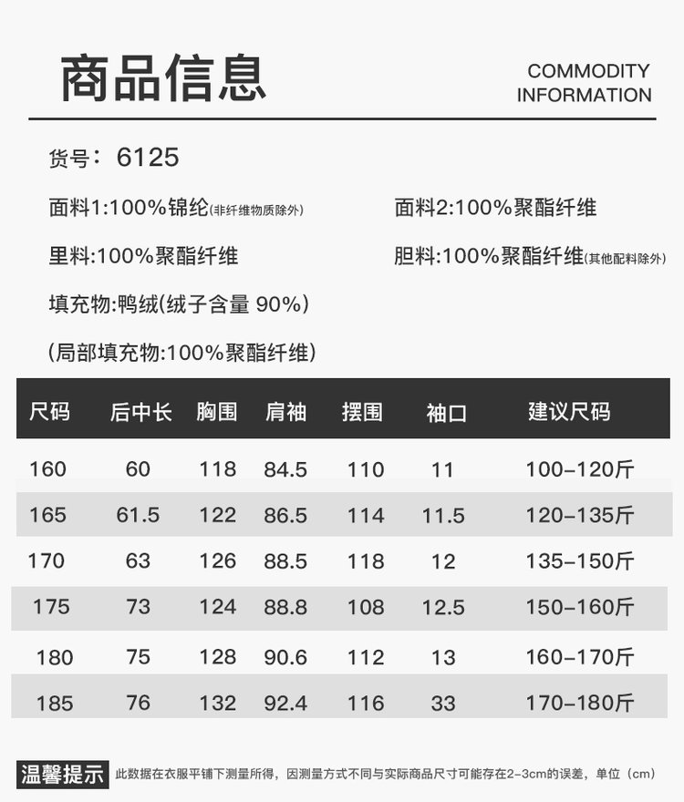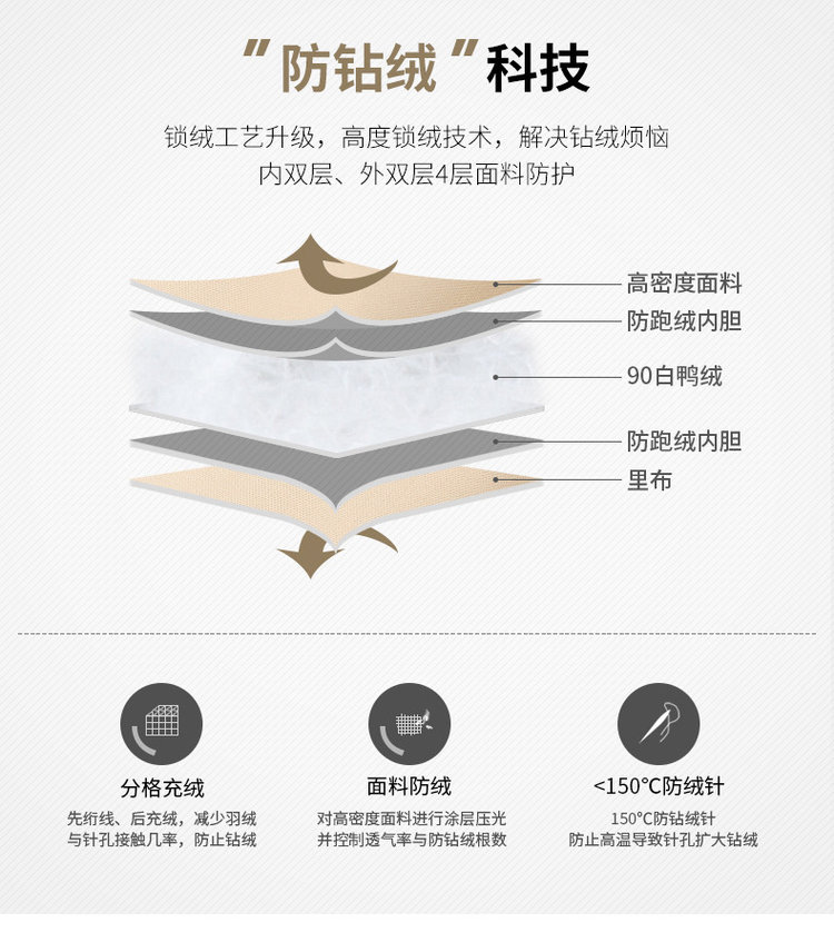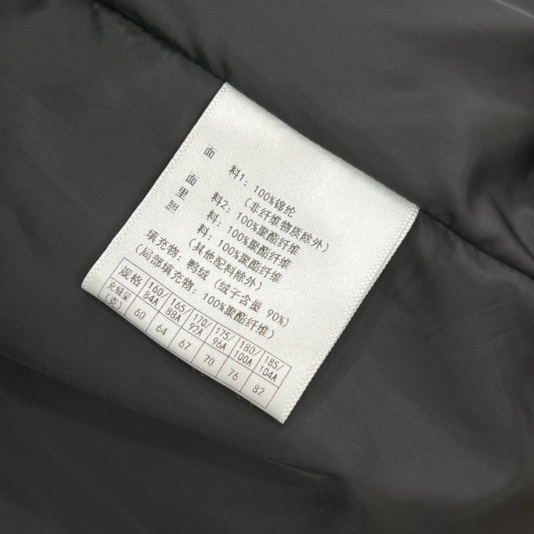 【材质面料】面料1:100%锦纶(非纤维物质除外)面料2:100%聚酯纤维里料:100%聚酯纤维胆料:100%聚酯纤维(其他配料除外)填充物:鸭绒(绒子含量 90%)(局部填充物:100%聚酯纤维)