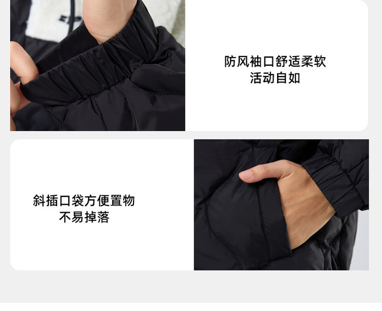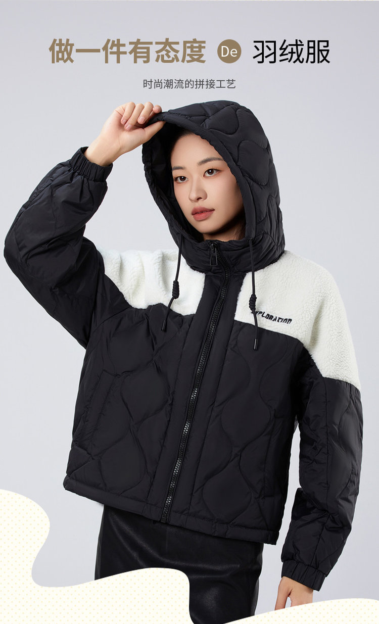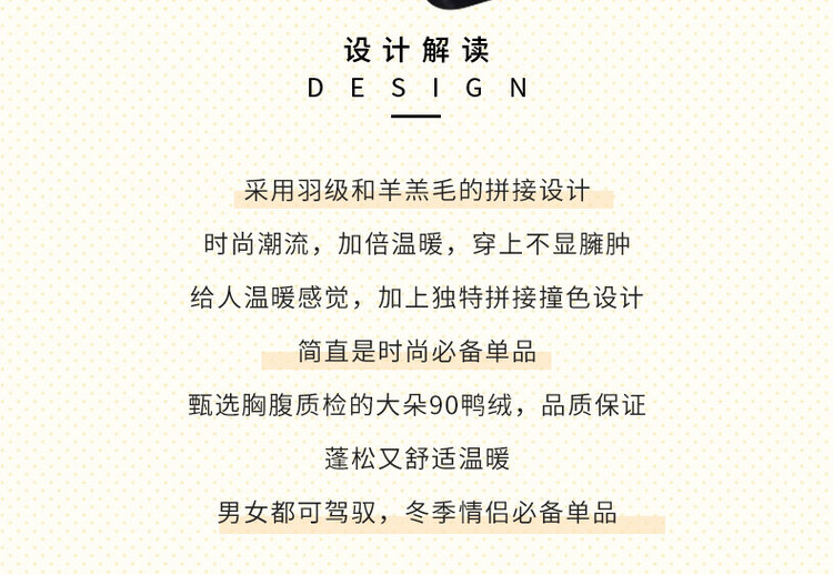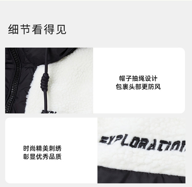 卖点✅ 专柜 1009 元,羽绒与羊羔毛拼接,时尚又加倍温暖。✅ 90% 鸭绒填充,胸腹大朵鸭绒品质佳,蓬松舒适且穿上不臃肿。✅ 独特拼接撞色设计,帽子抽绳防风,满满的时尚感,是必备单品。✅ 侧插口袋暖手又能置物,男女都能驾驭,冬季情侣必备超有爱。