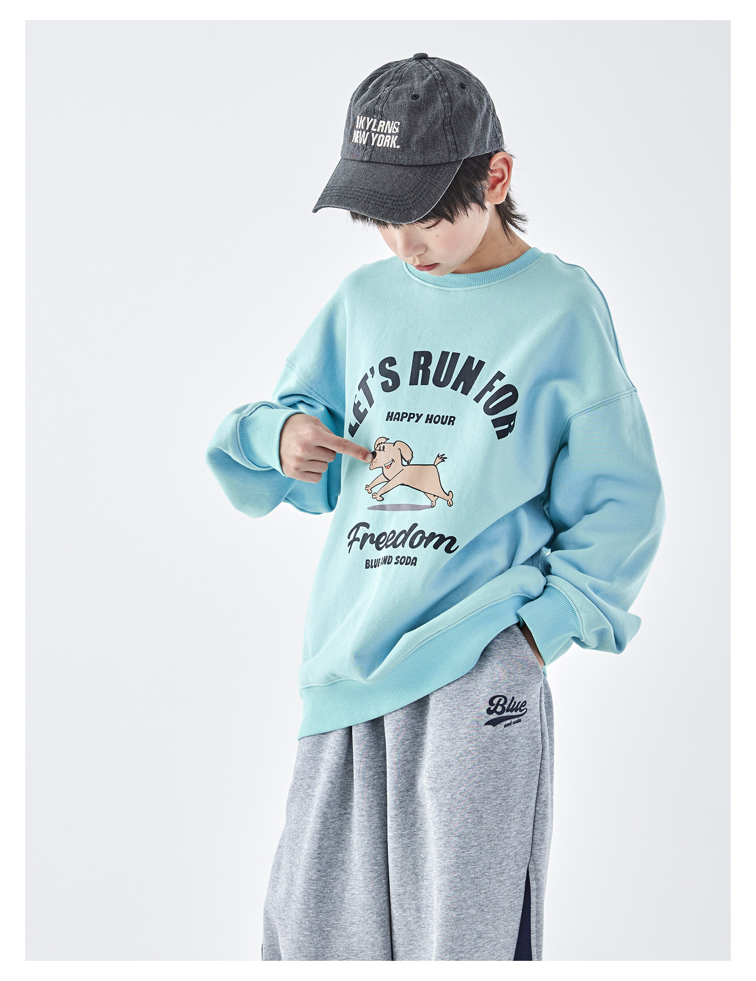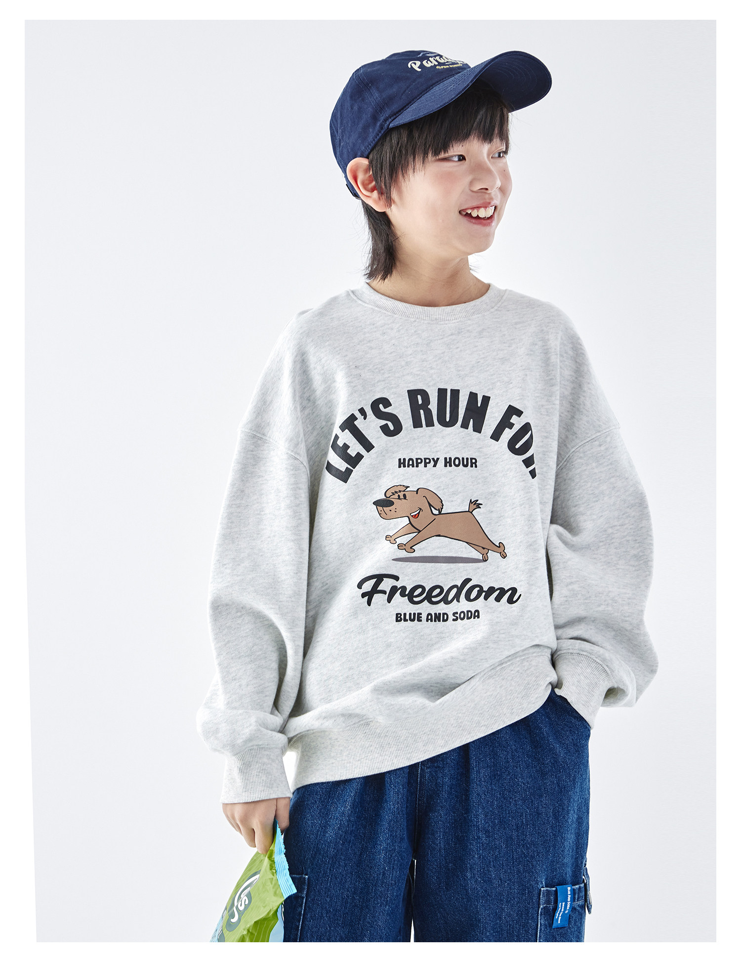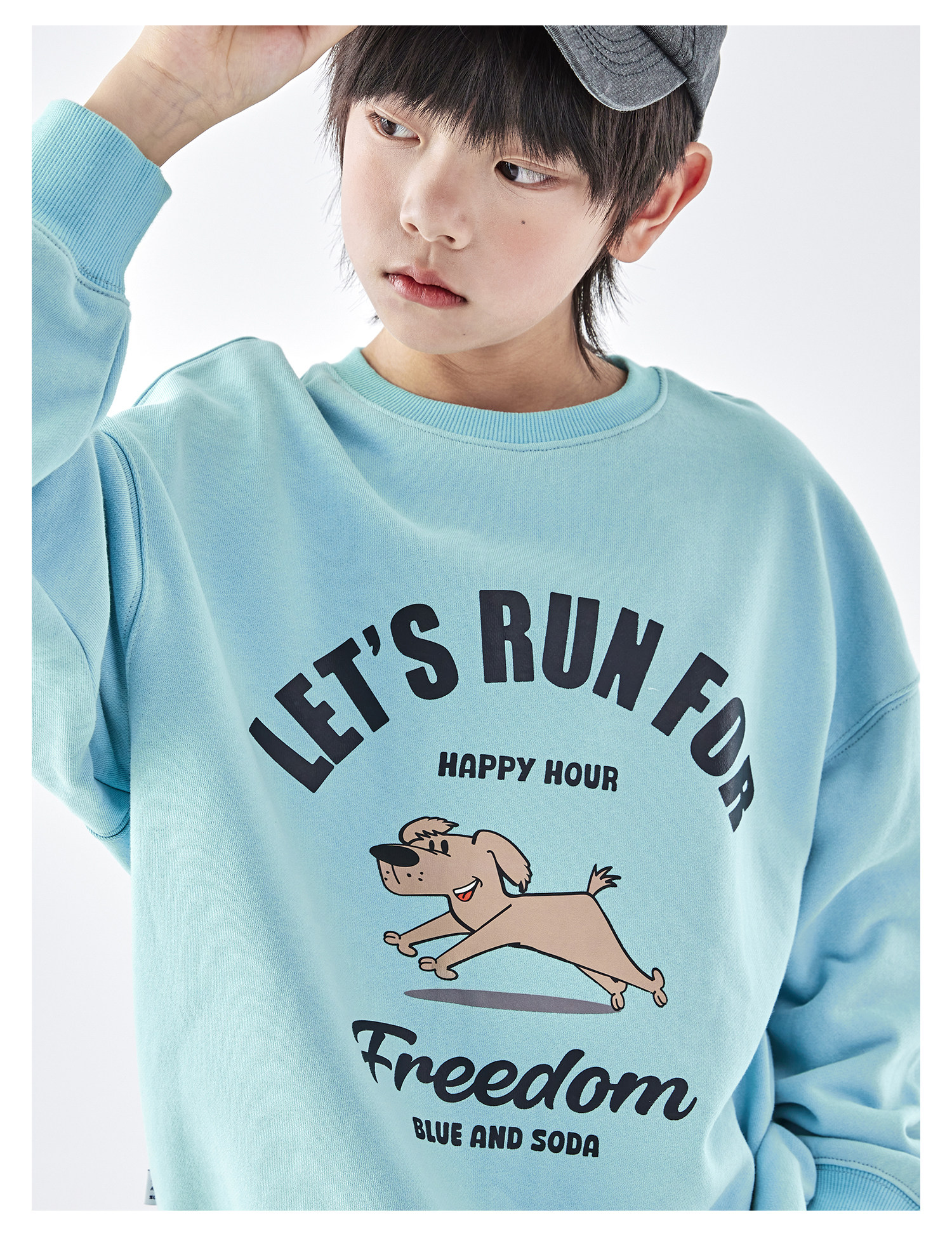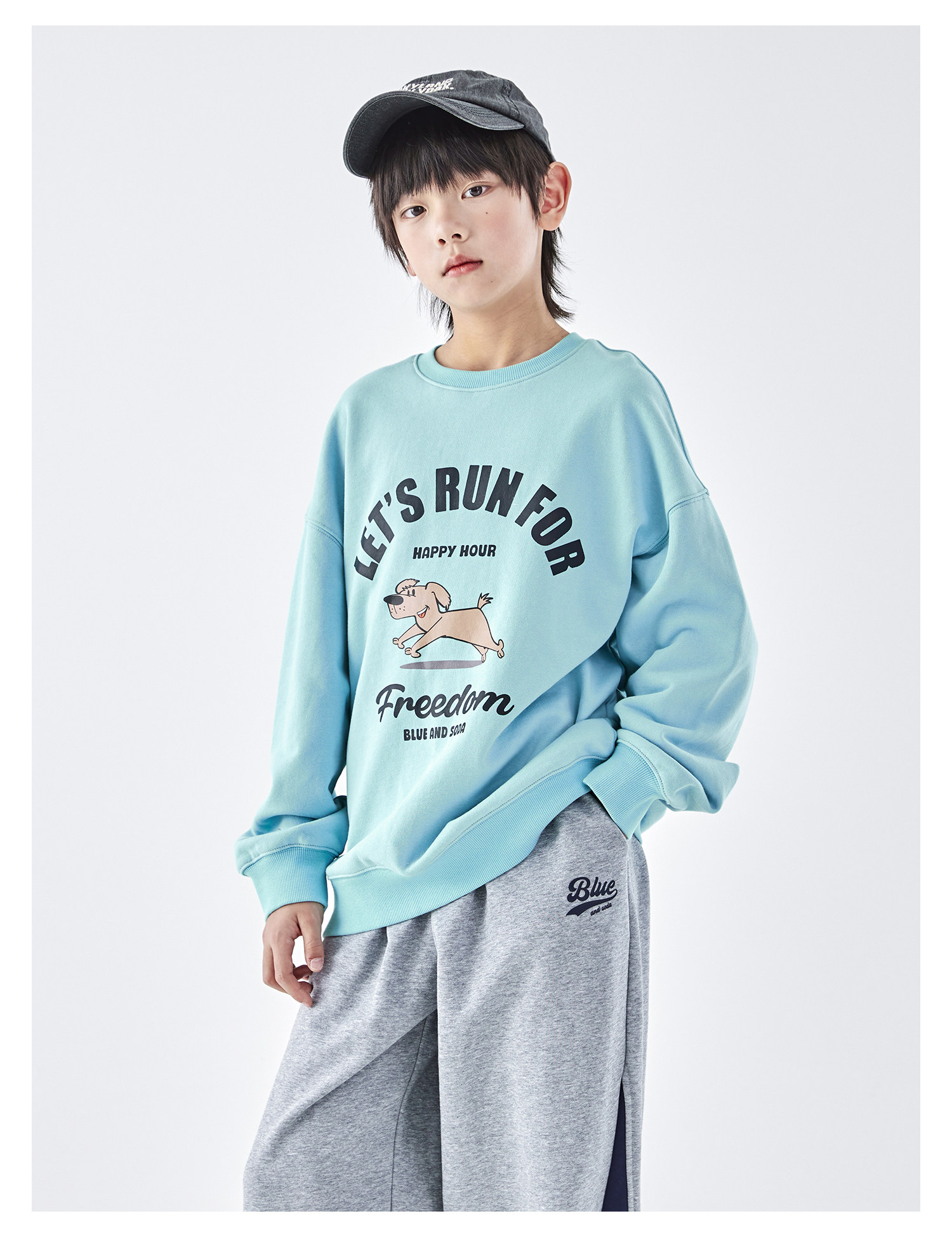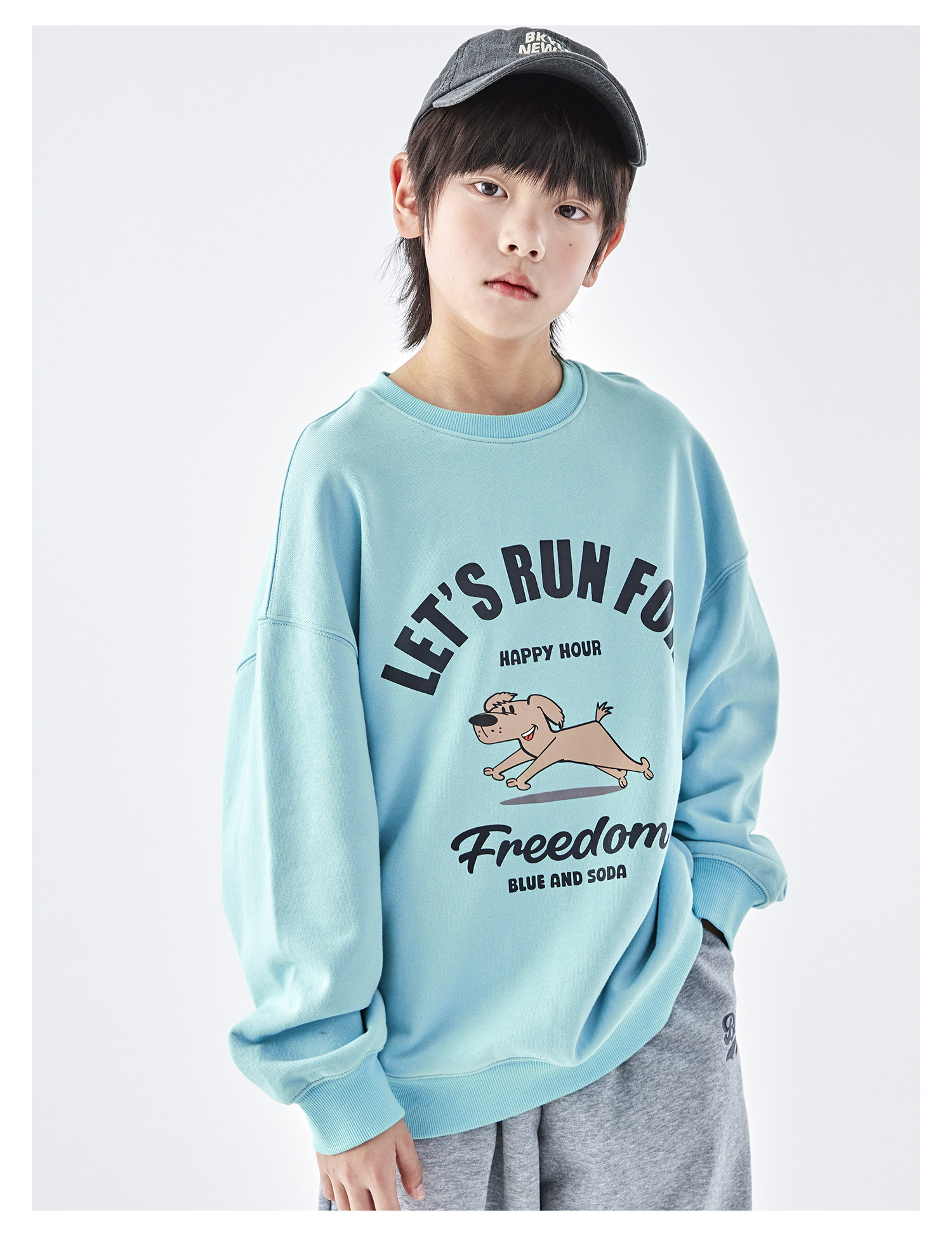 【代发】蓝汽水男童上衣青少年小狗图案印花全棉卫衣浅花灰/浅青蓝