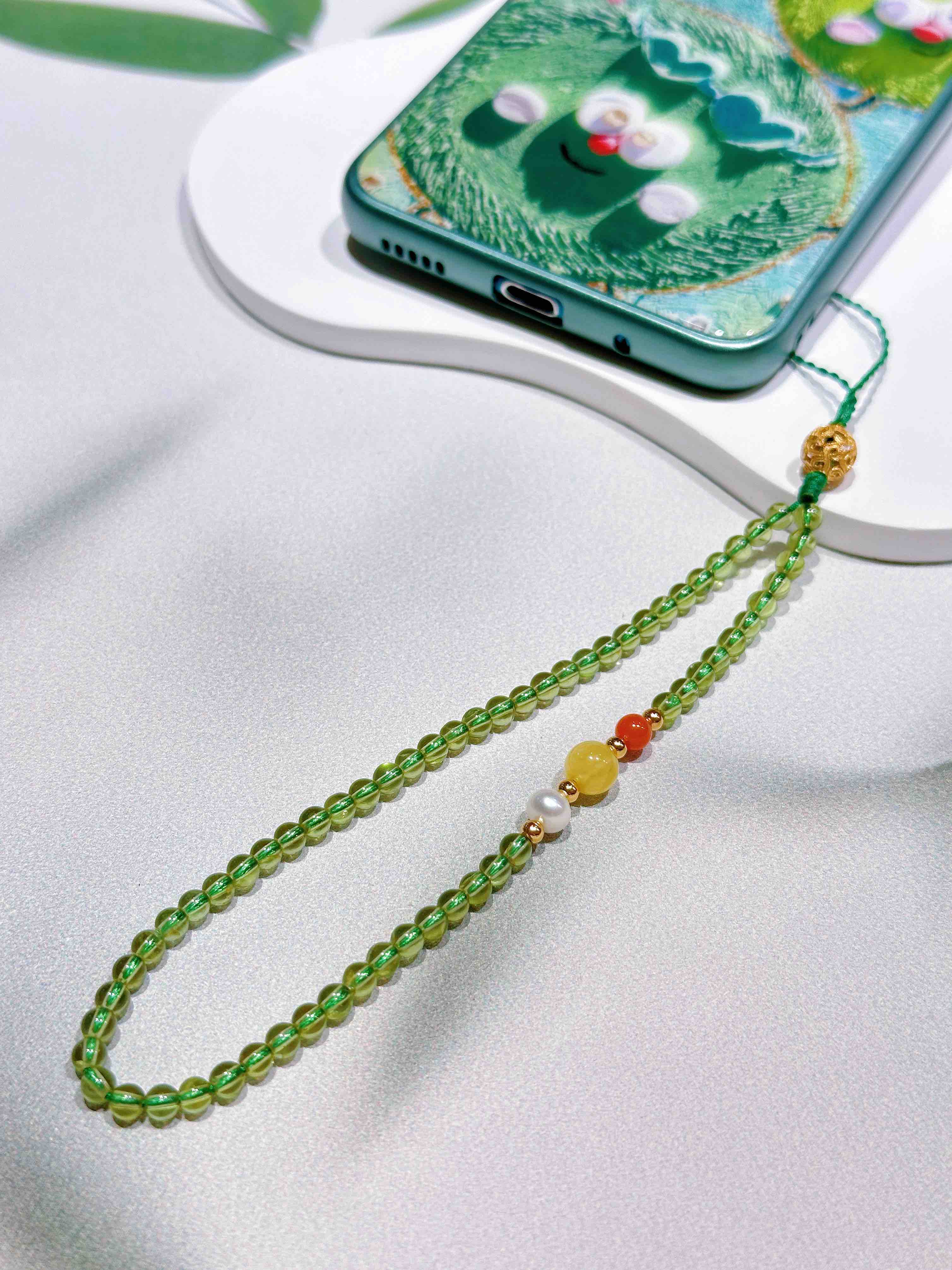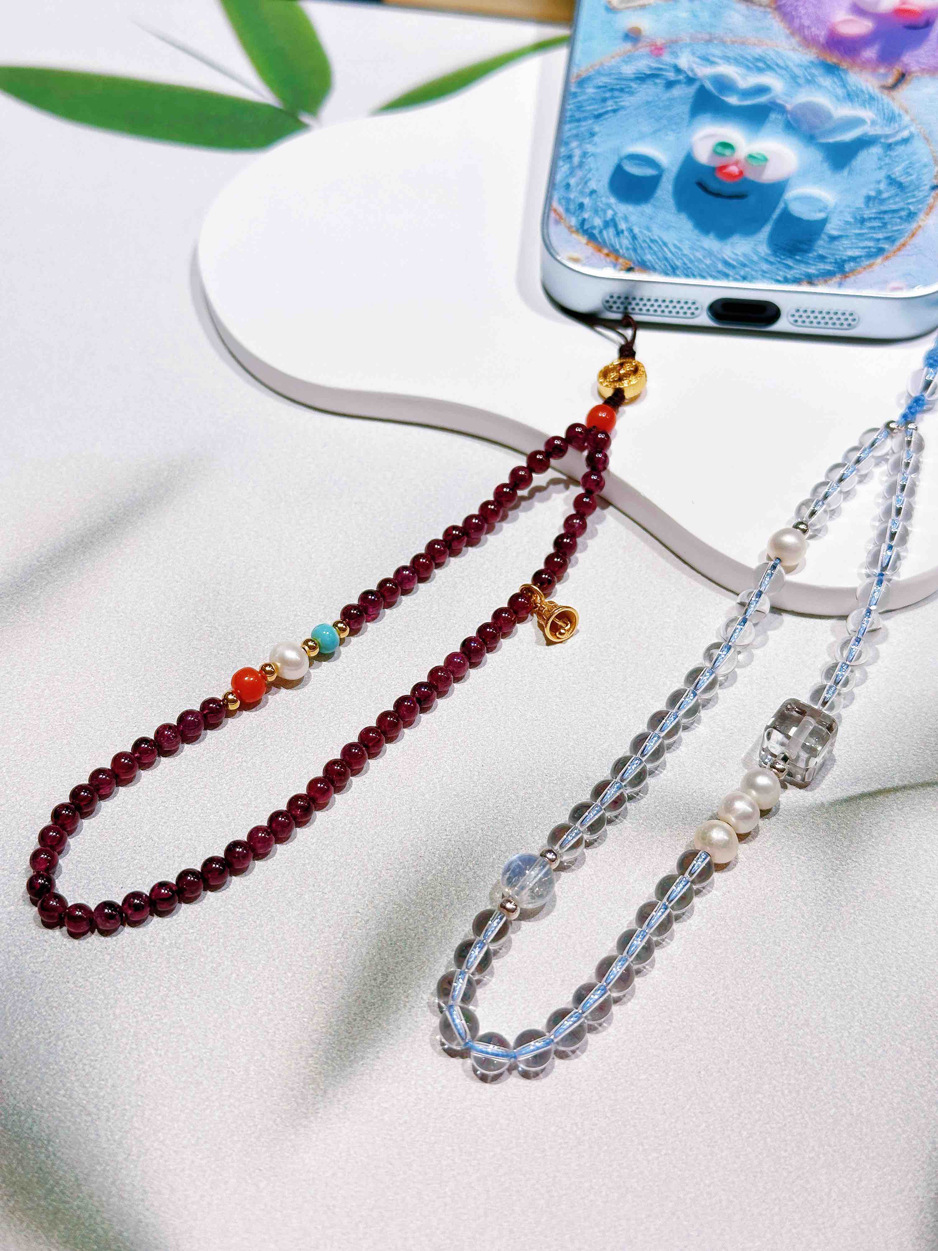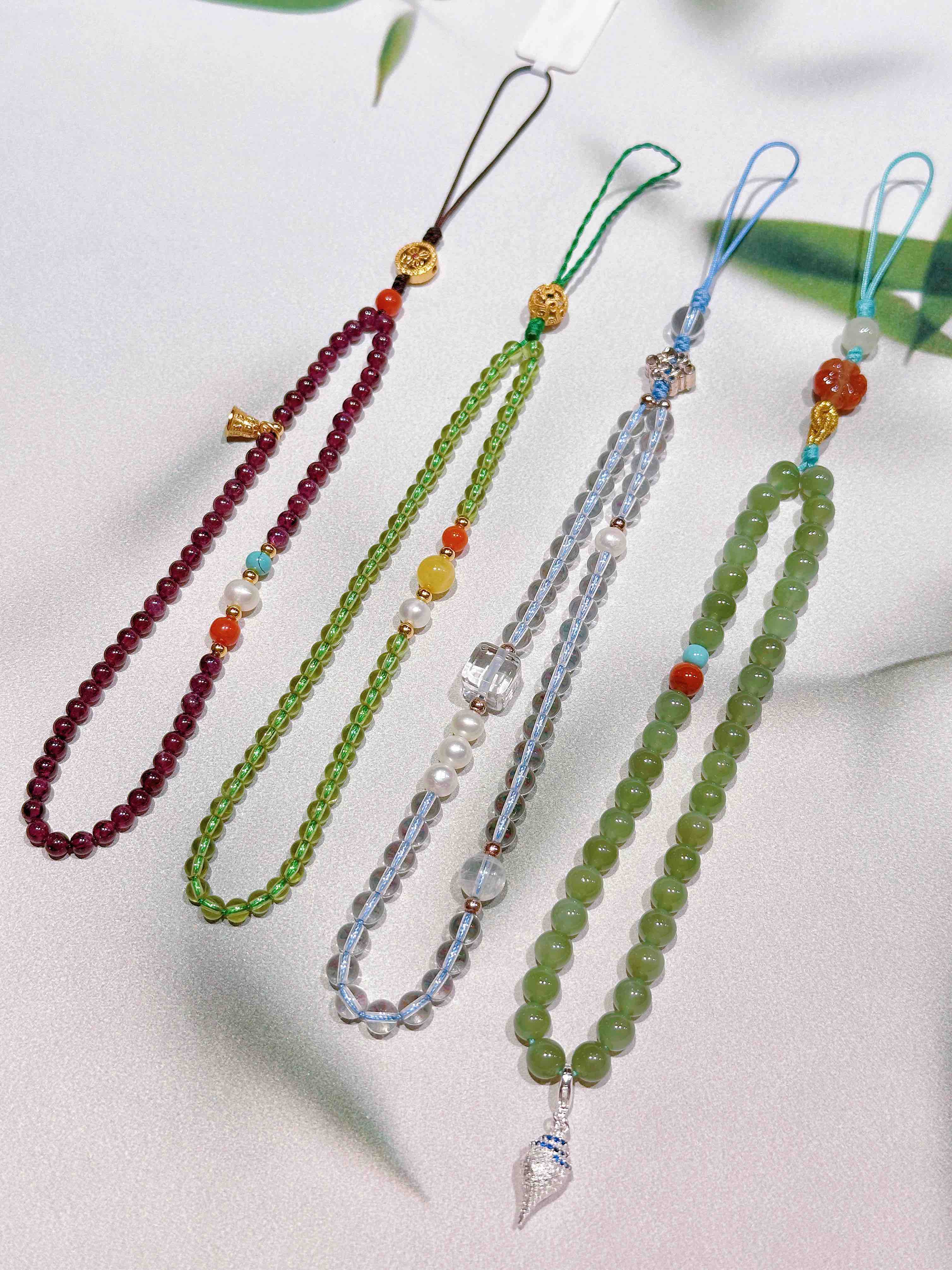 国风原创新中式酒红石榴石水晶橄榄石碧玉手机链手机挂件手腕绳淡水珍珠彩虹蜜蜡南红