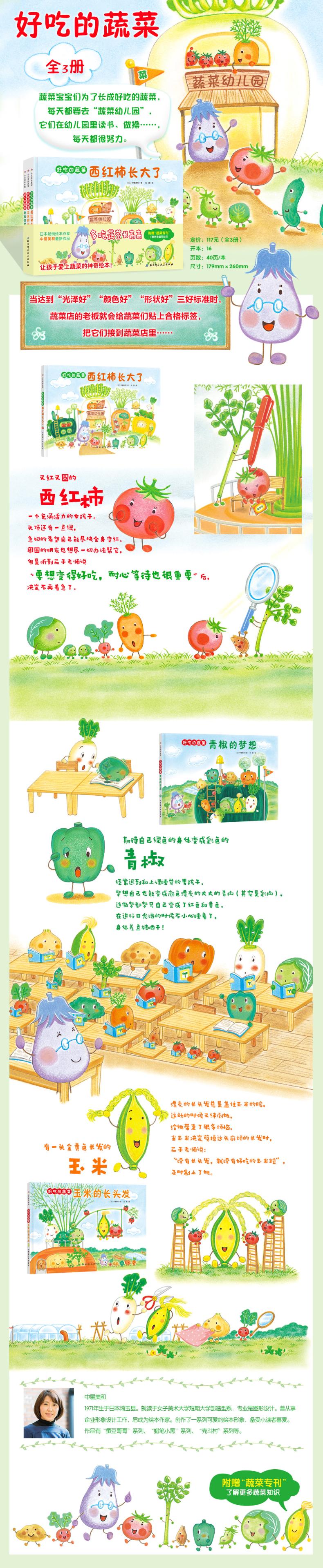 《玉米的长头发》蔬菜宝宝们为了成长为好吃的蔬菜,每天都要去“蔬菜幼儿园”。玉米虽然有一头漂亮的长发,可是行动却很不方便。蔬菜宝宝们齐心协力想出了一个办法来帮助玉米……