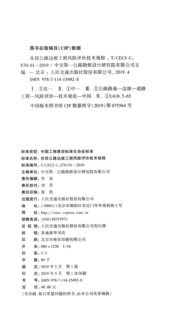 新书 在役公路边坡工程风险评价技术规程 (T/CECS G:E70-01—2019) 人民交通出版社股份有限公司