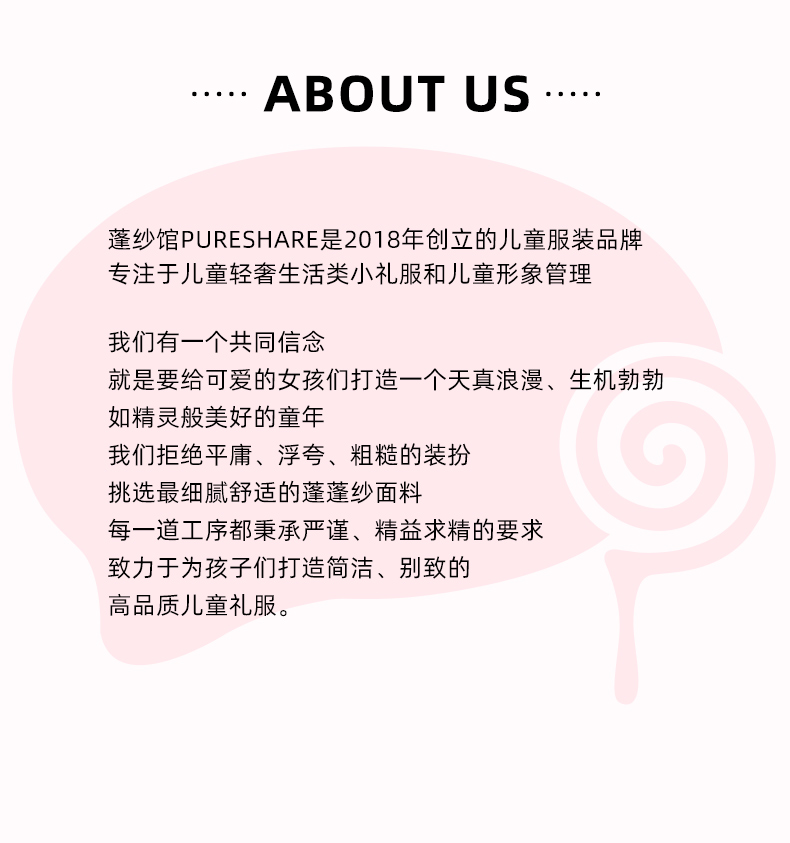 PureShare蓬纱馆,2018年创立的儿童服装品牌,专注于儿童轻奢生活类小礼服,主张“让孩子做最独特的自己”的品牌理念,为孩子们提供时尚简洁、优雅而又不失童真的生活类礼服。