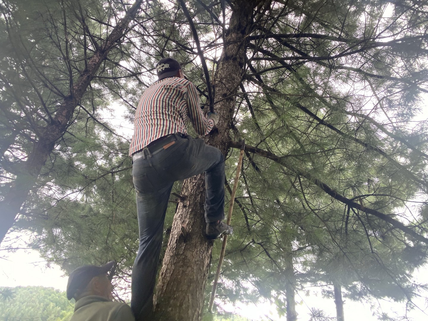 特别是采松子是一件危险系数很高的工作,松子都长在最顶端的树尖儿上,松树都要在二三四十米以上。