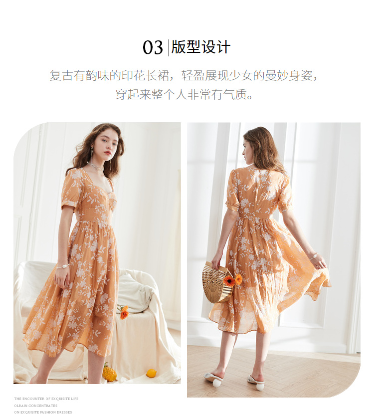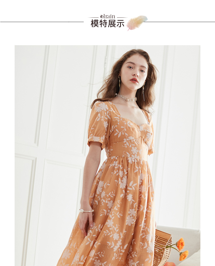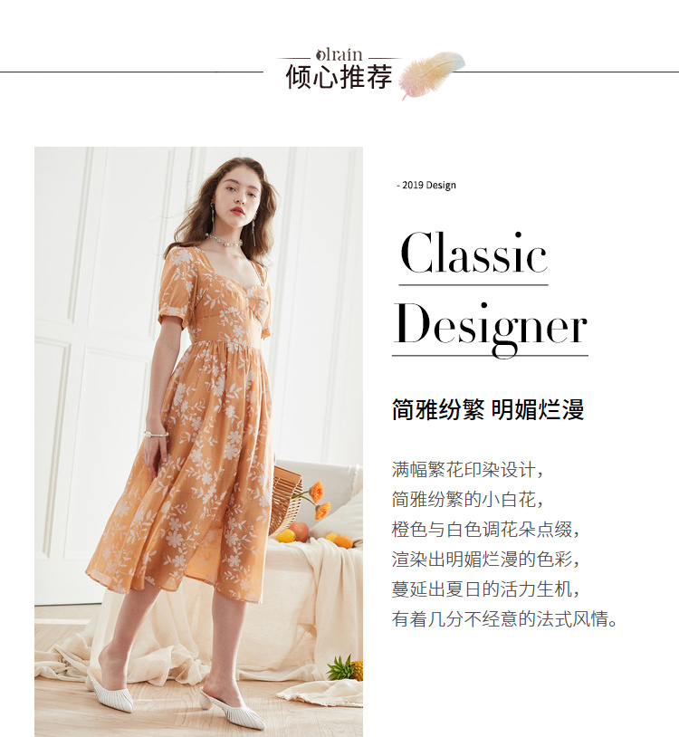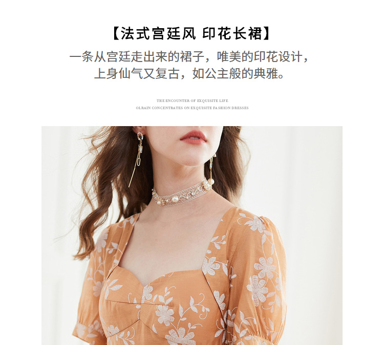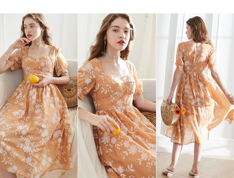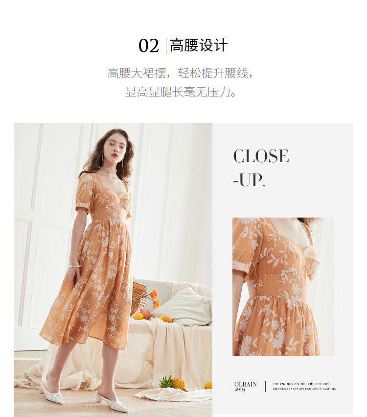 欧芮儿方领短袖印花雪纺连衣裙女显瘦复古裙子仙女超仙森系2019夏装