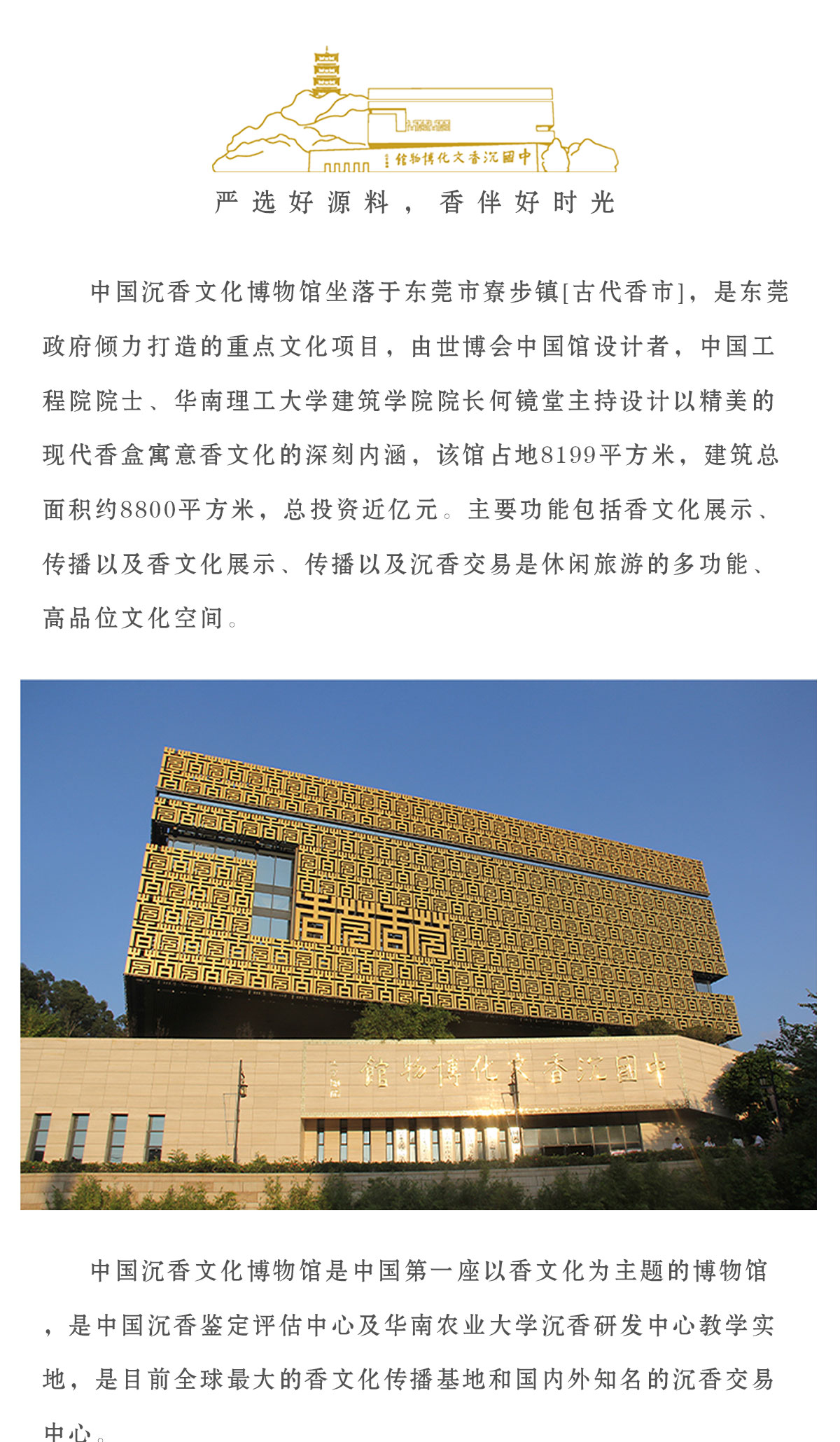 中国沉香文化博物馆坐落于古代[香市]东莞市寮步镇,是东莞政府倾力打造的重点文化项目,由世博会中国馆设计者,中国工程院院士、华南理工大学建筑学院院长何镜堂主持设计,以精美的现代[香盒]寓意香文化的深刻内