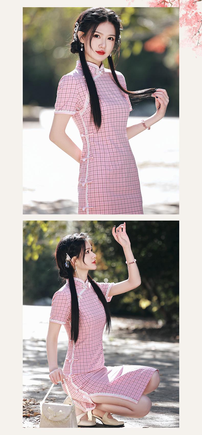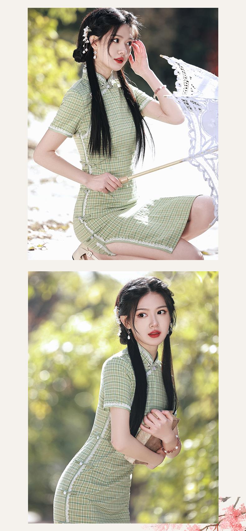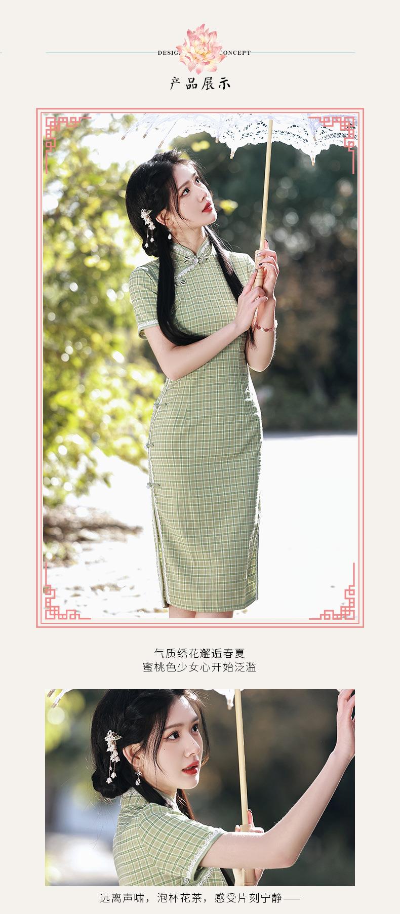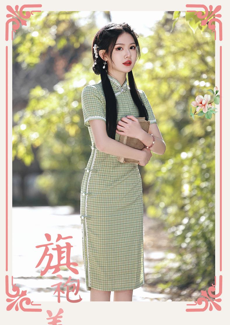 2023春夏新款棉麻格子侧八扣中长款旗袍连衣裙日常复古改良民国风