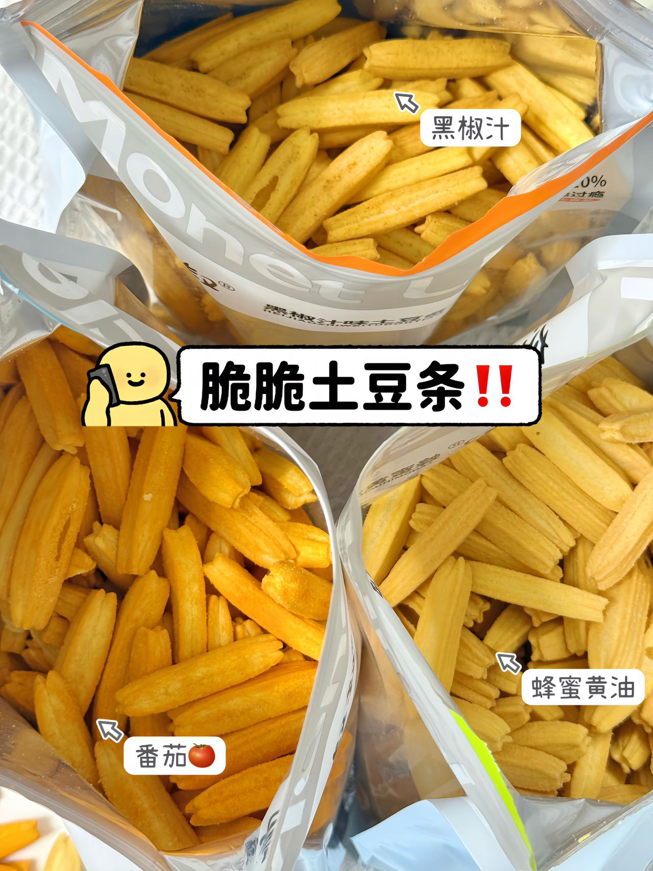 【莫奈叔叔·土豆条】添加20%马铃薯,能吃出土豆的原香,番茄味清新酸甜,黑椒汁味浓郁咸香,蜂蜜黄油味香甜浓郁 300g/袋