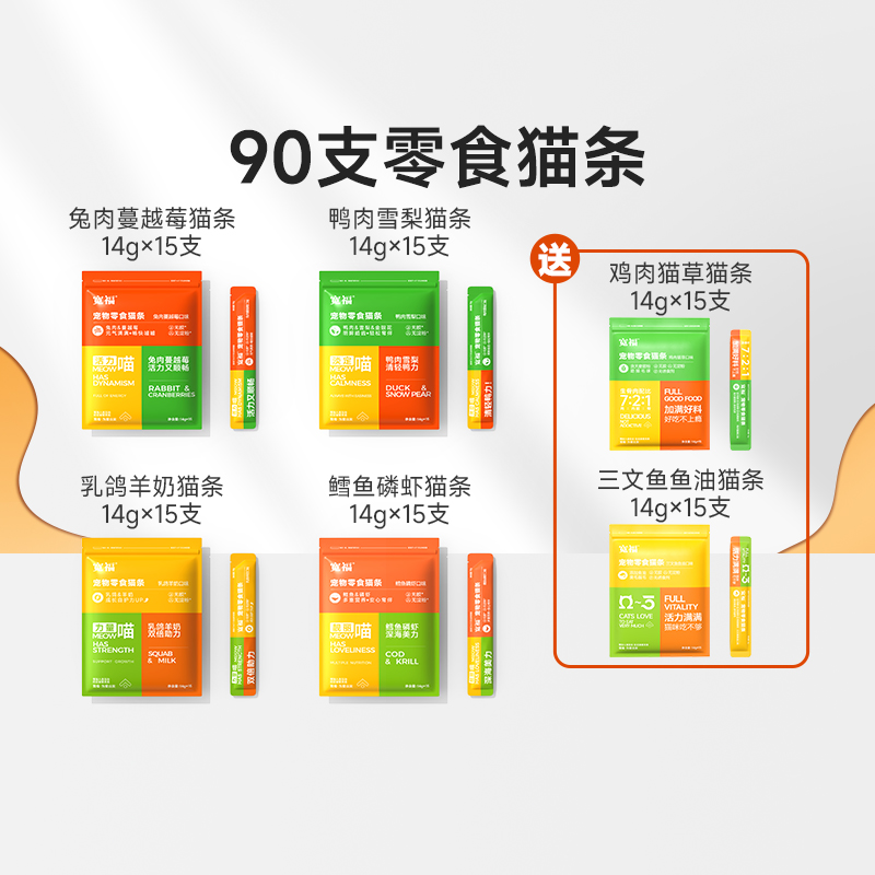 [90支猫条新口味]宽福 猫条 新口味组合14g*15支*6袋 零食猫条 兔肉 鸭肉 乳鸽 鳕鱼 鸡肉 三文鱼