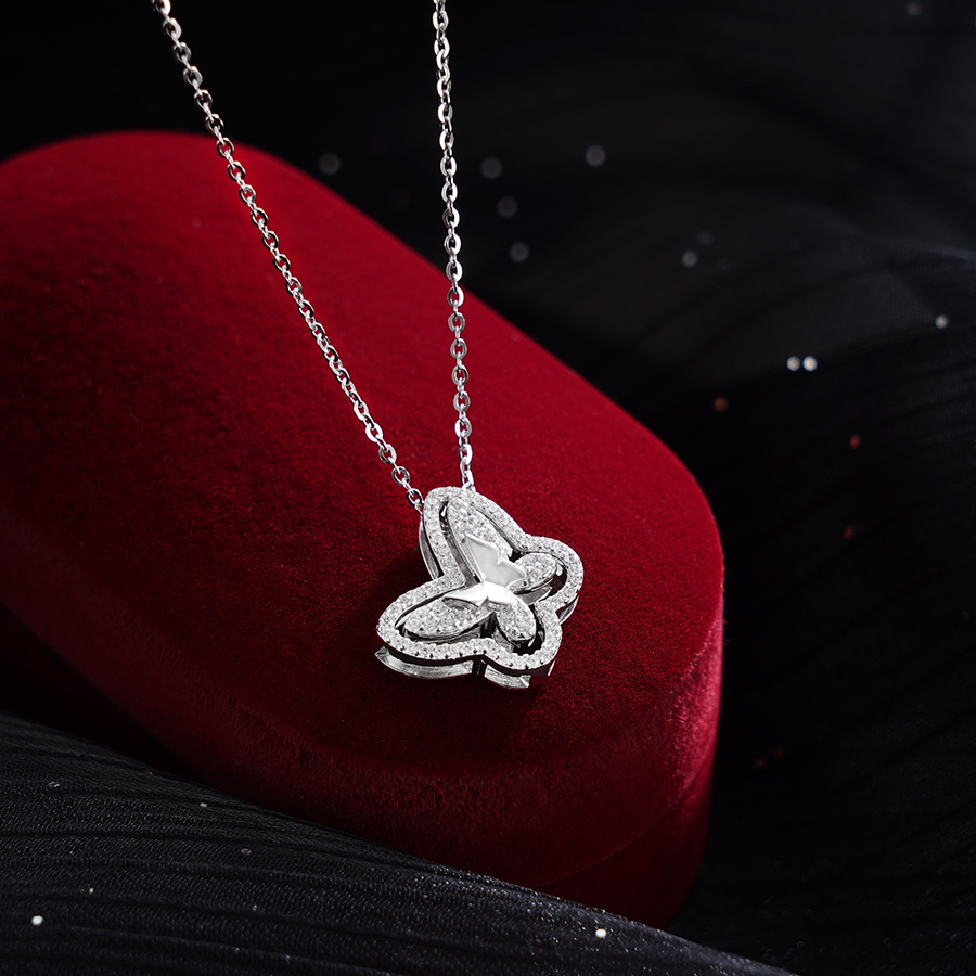 【寓意】:蝴蝶造型精致立体,镂空纹理,锆石密嵌。整体轻灵细腻,质感超然。象征遇见光明,华丽新生。