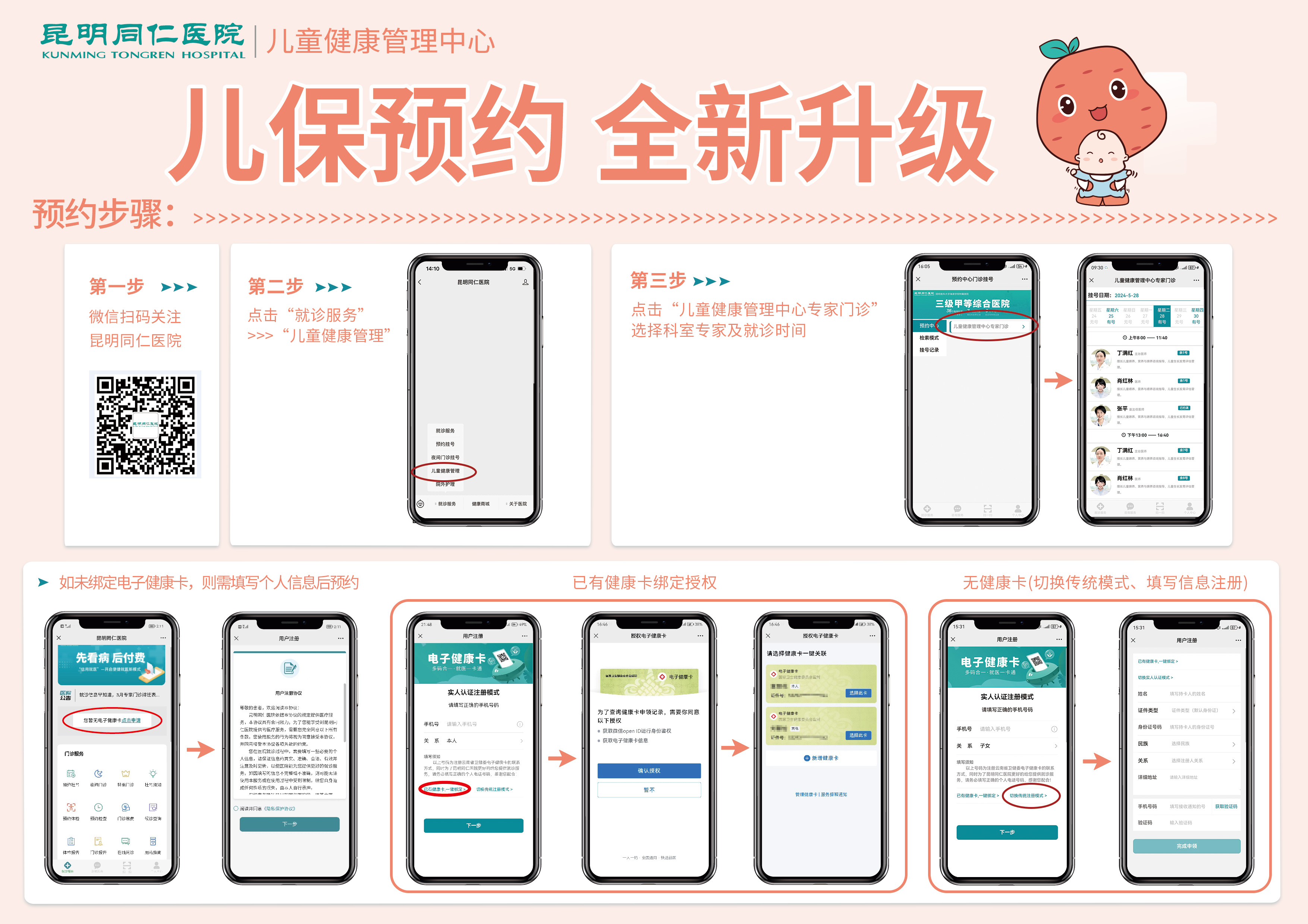 1、购买成功后,请进入“昆明同仁医院”公众号—点击底部导航栏中“就诊服务”—点击“儿童健康管理”进行儿保预约,为保证您的看诊时长并且减少等待时间,请按照预约时间到院就诊。
