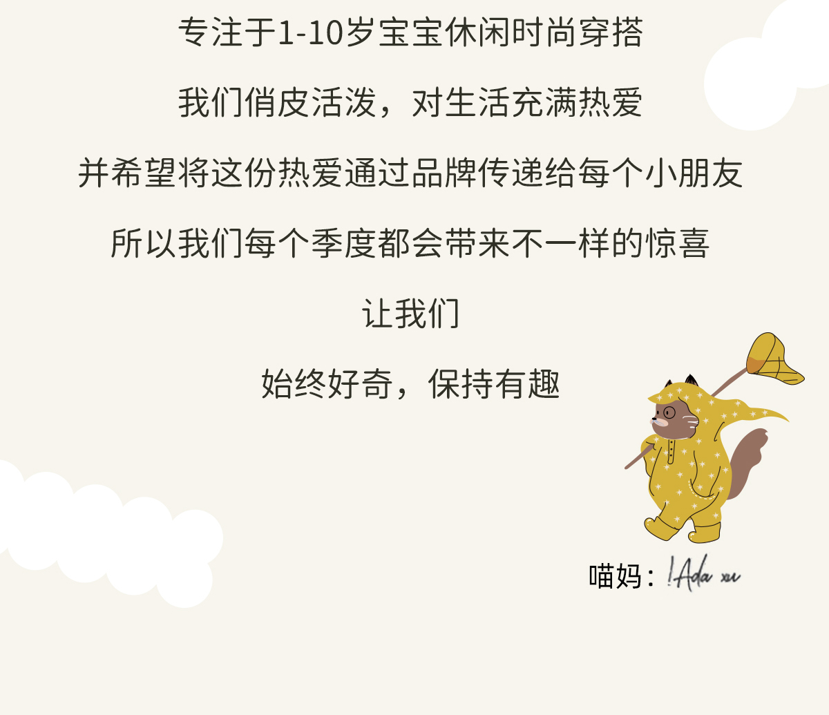 - Purrfect-Diary专注于贴近自然随性的穿着概念,轻奢平价的童装文化传播,在产品设计上更加注重婴童穿着的舒适性、安全性、更出众的国际化品牌,将欧美的育婴文化在中国进行深入的传播与推广。