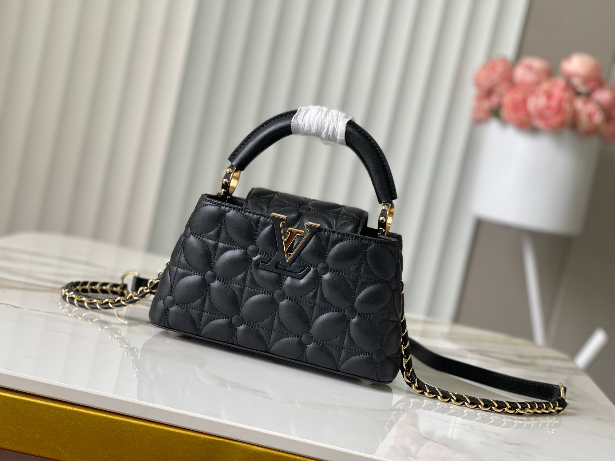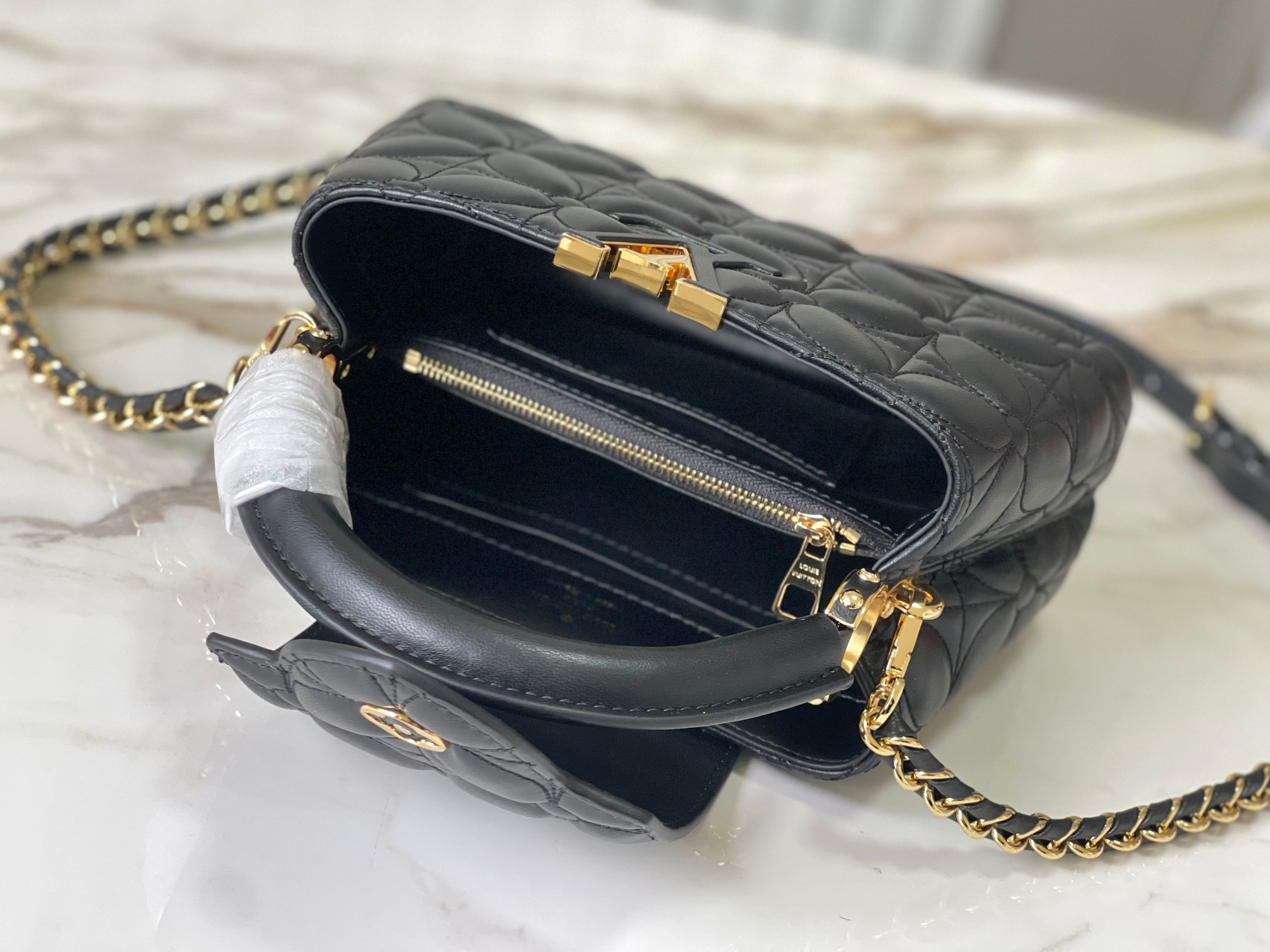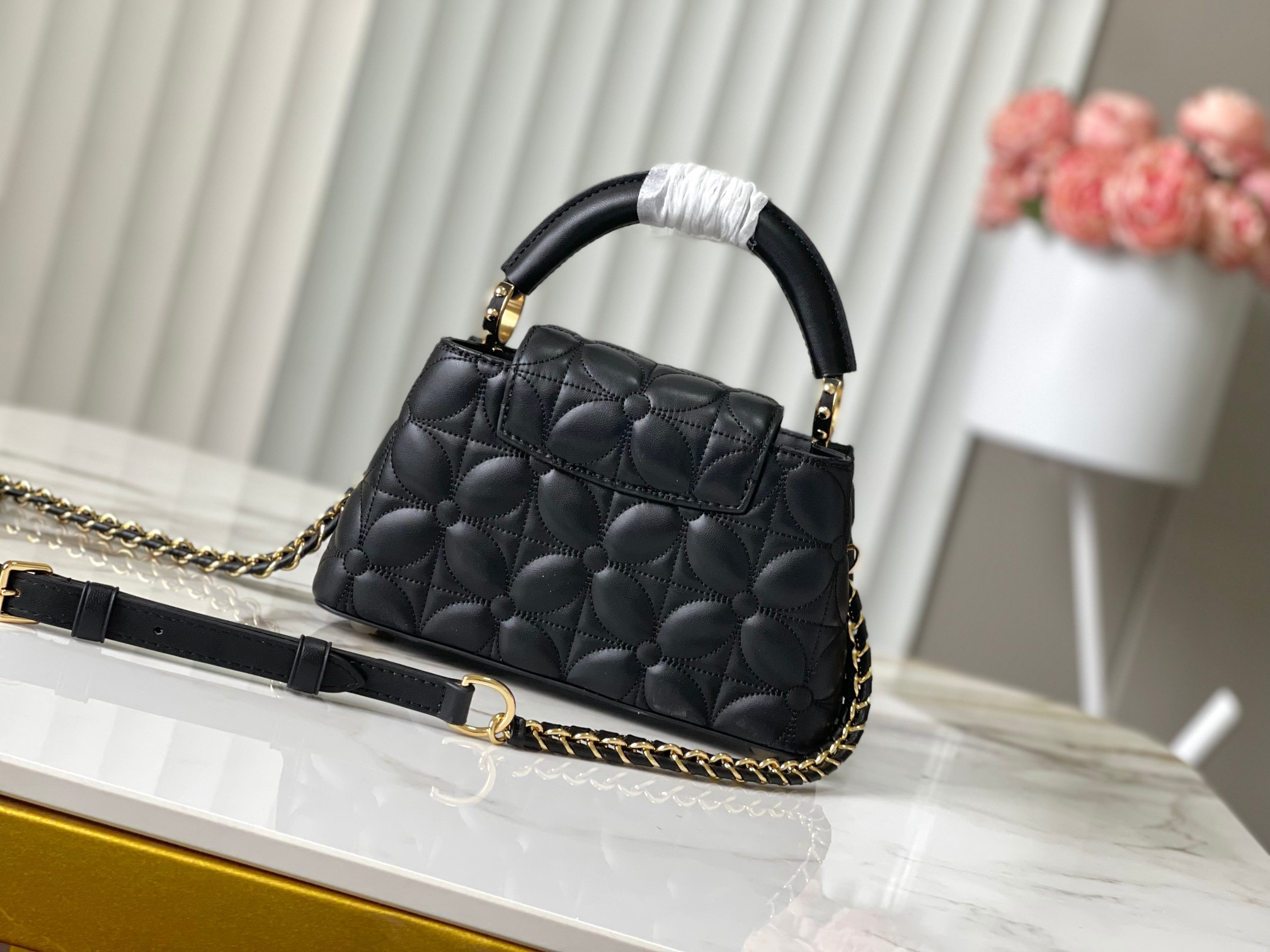 秋冬特惠💰1600 渠道级LV 新品 te级LV 全套包装 M25332/M48865黑色四叶草链条款(变码芯片)Monogram 花卉于优雅绗缝中浮现 为 Capucines 手袋吹袭门店装饰之风 柔软绵羊皮塑造沉稳构型与饰边 可拆卸肩带实现舒适肩背体验 Size:22 * 12 * 8 cm