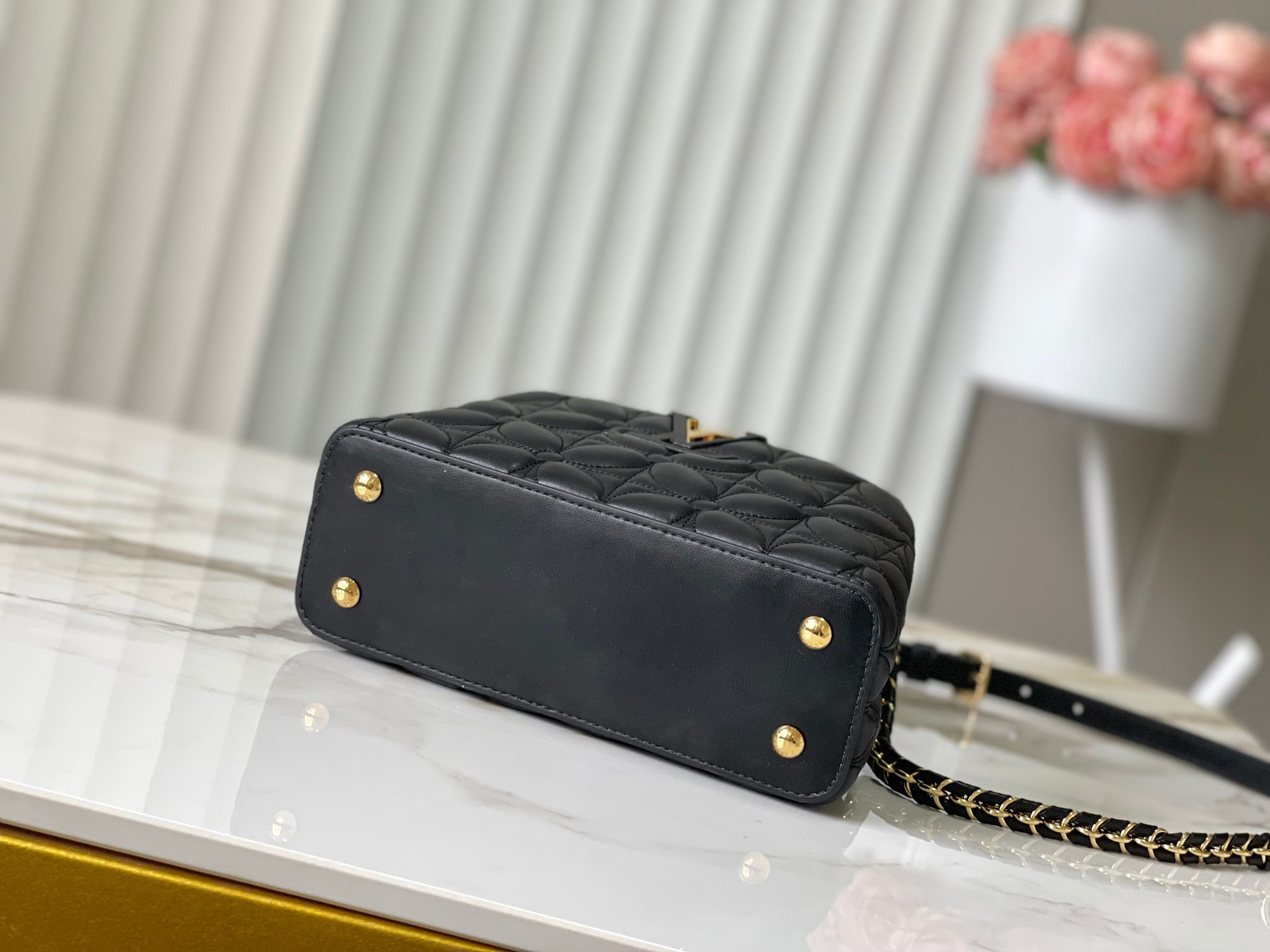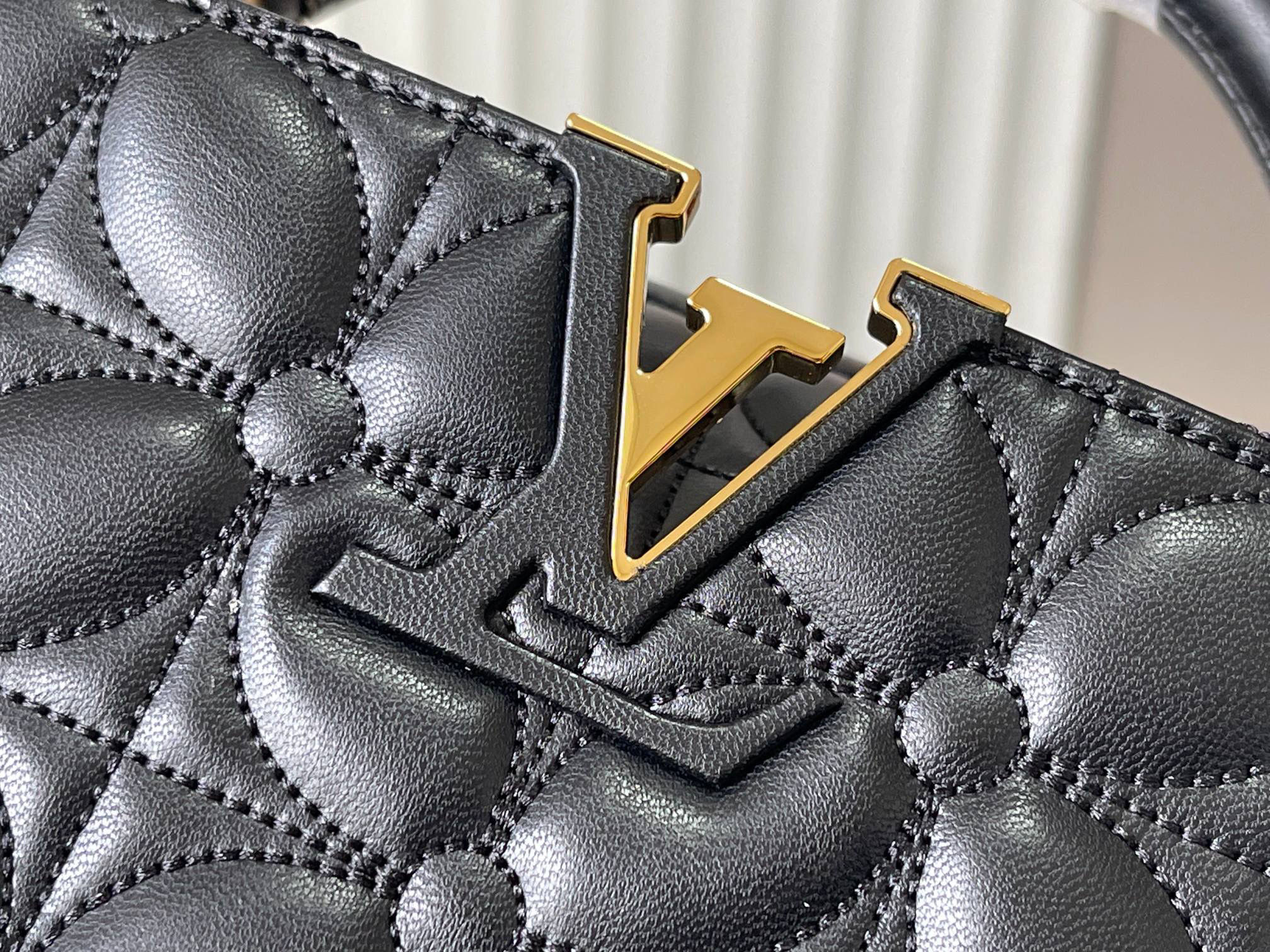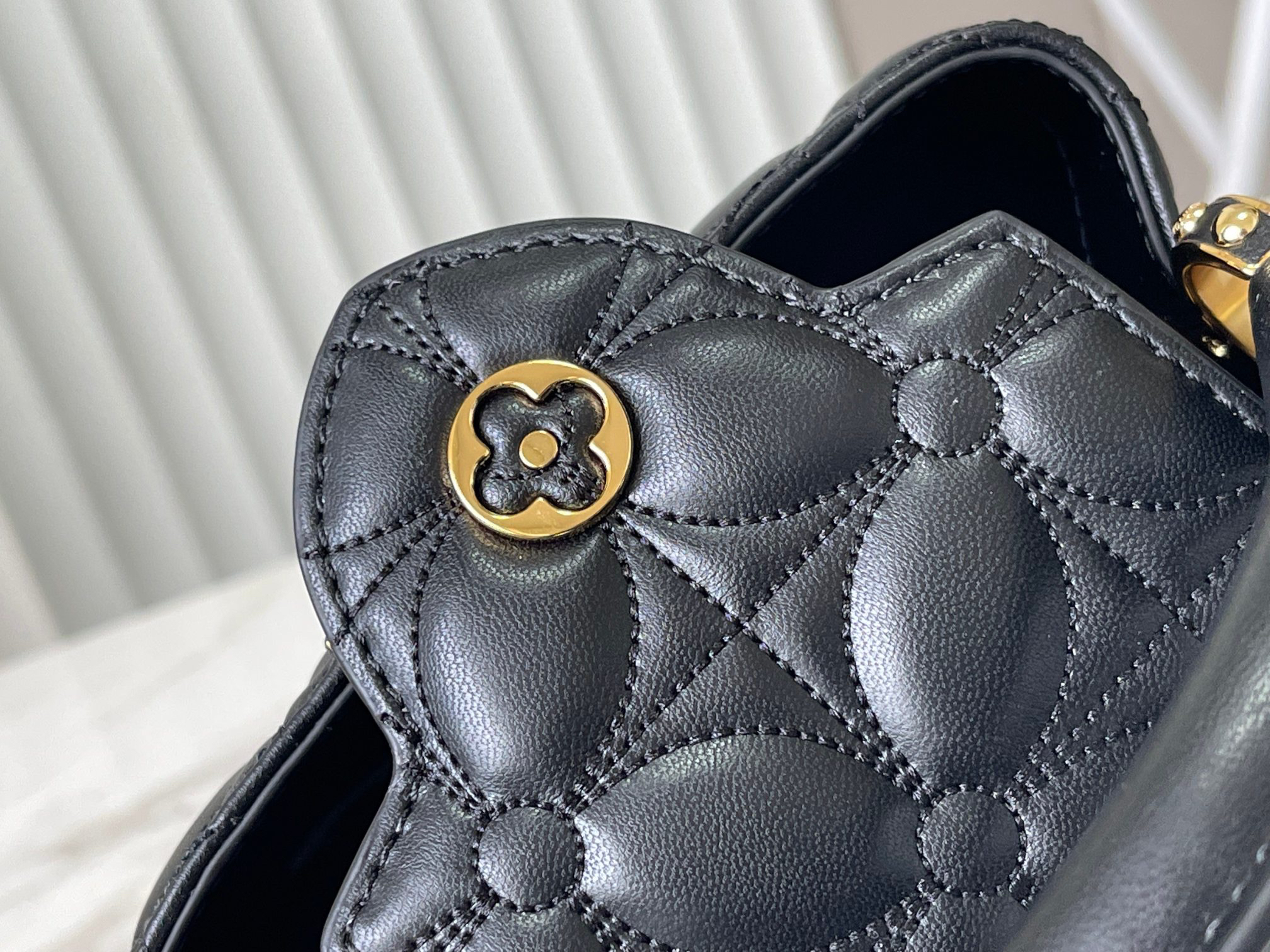 秋冬特惠💰1600 渠道级LV 新品 te级LV 全套包装 M25332/M48865黑色四叶草链条款(变码芯片)Monogram 花卉于优雅绗缝中浮现 为 Capucines 手袋吹袭门店装饰之风 柔软绵羊皮塑造沉稳构型与饰边 可拆卸肩带实现舒适肩背体验 Size:22 * 12 * 8 cm