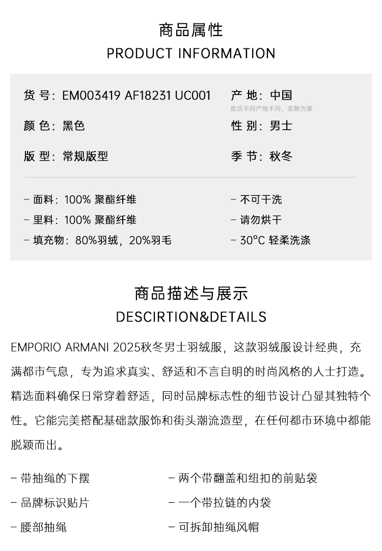 EMPORIO ARMANI 阿玛尼 男士徽标贴片绗缝连帽羽绒服 黑色 EM003419 AF18231 UC001