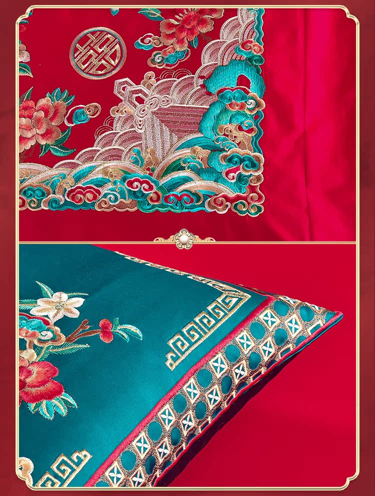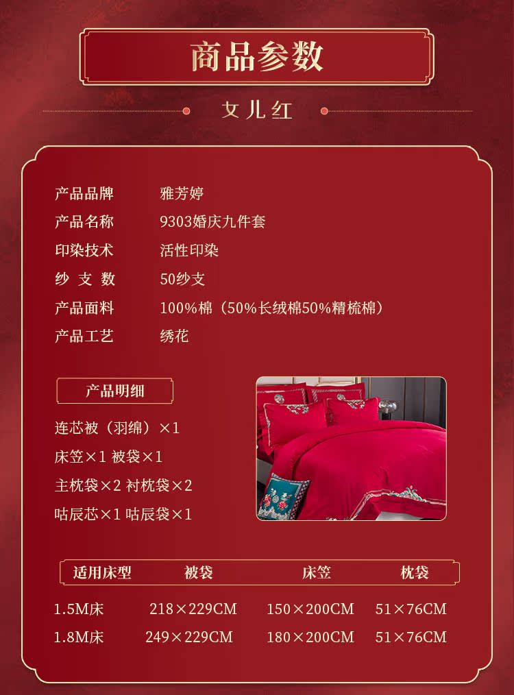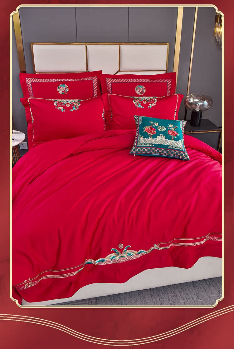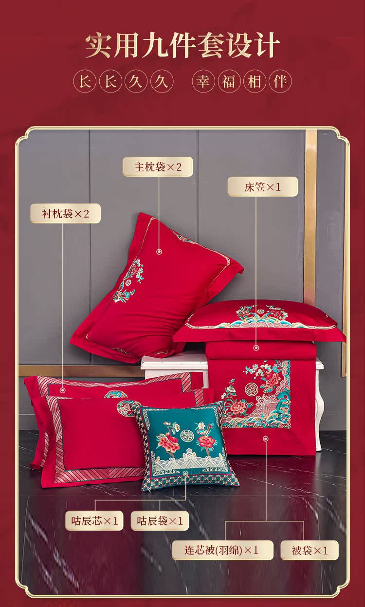 雅芳婷婚庆系列结婚九件套全棉绣花抱枕款红色刺绣床品套件