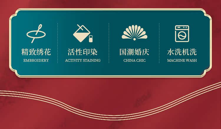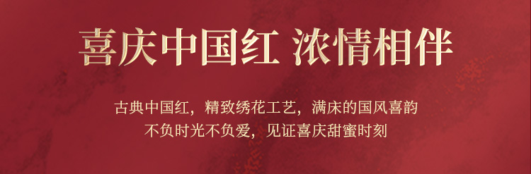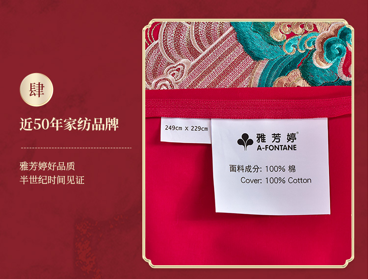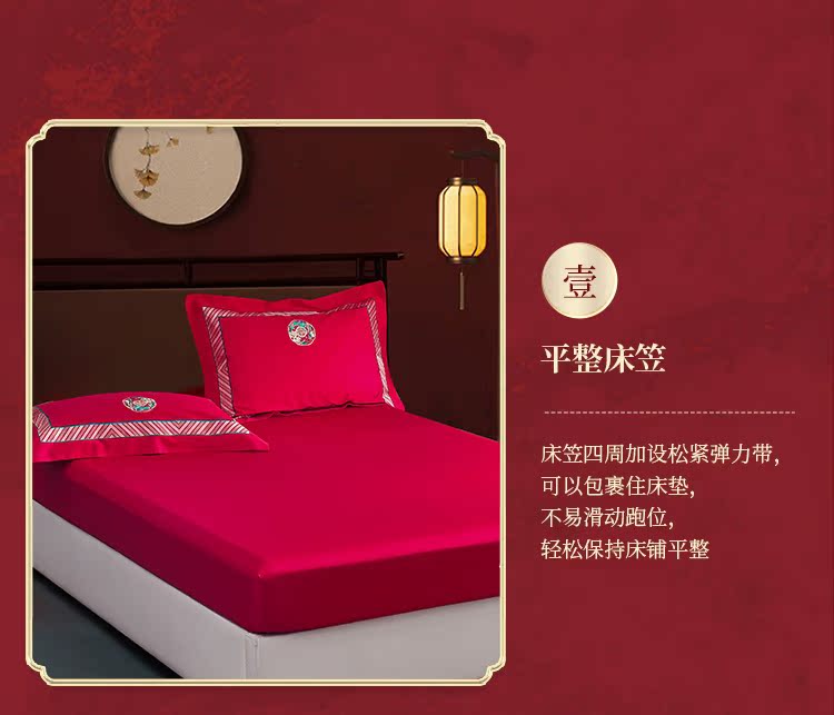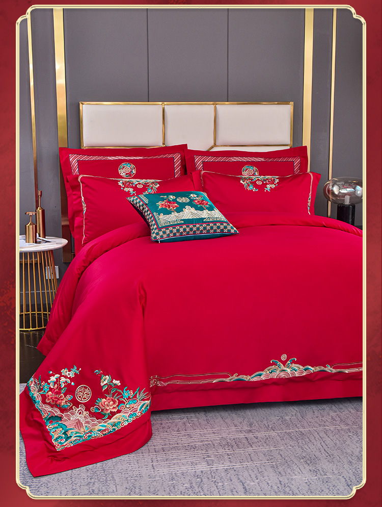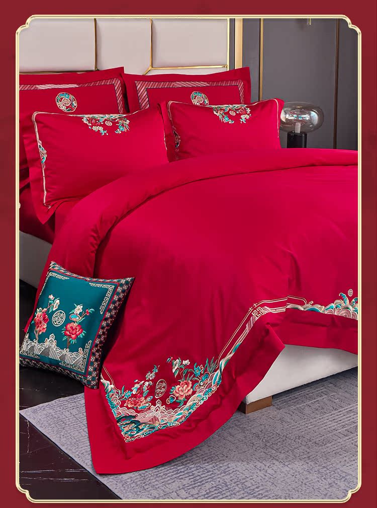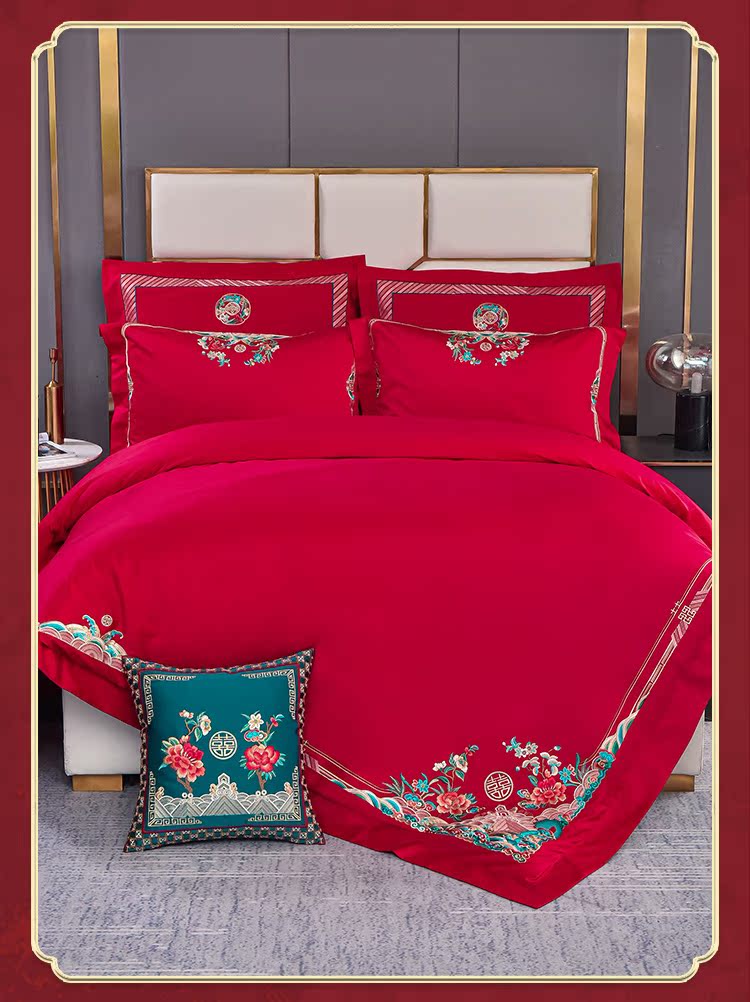 雅芳婷婚庆系列结婚九件套全棉绣花抱枕款红色刺绣床品套件