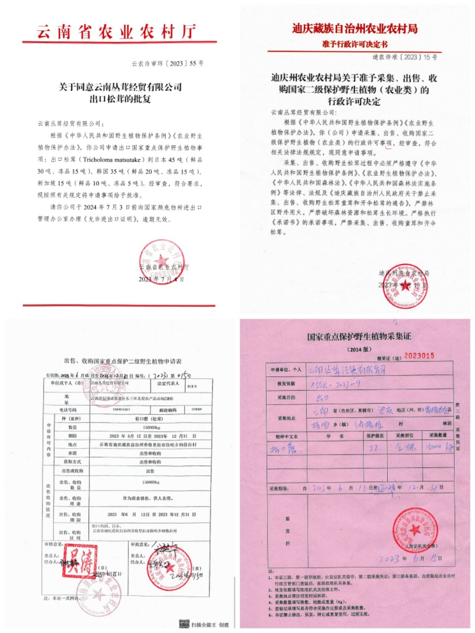 ●2023年15号、55号红头文件,“丛茸菌业”松茸出口行政批文,出口松茸150吨。