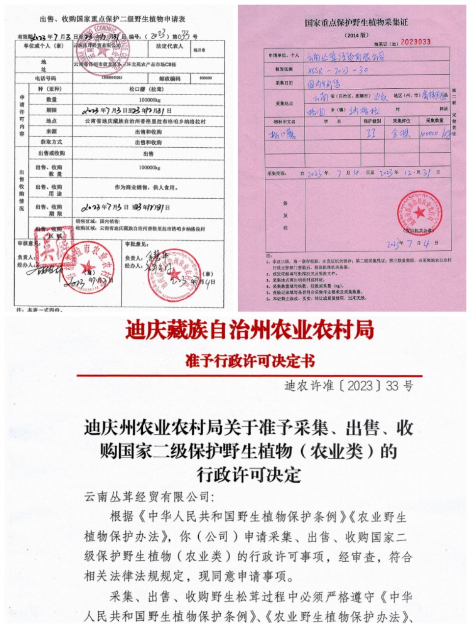 ●2023年33号红头文件,“丛茸菌业”松茸国内销售行政批文,国内销售松茸100吨。