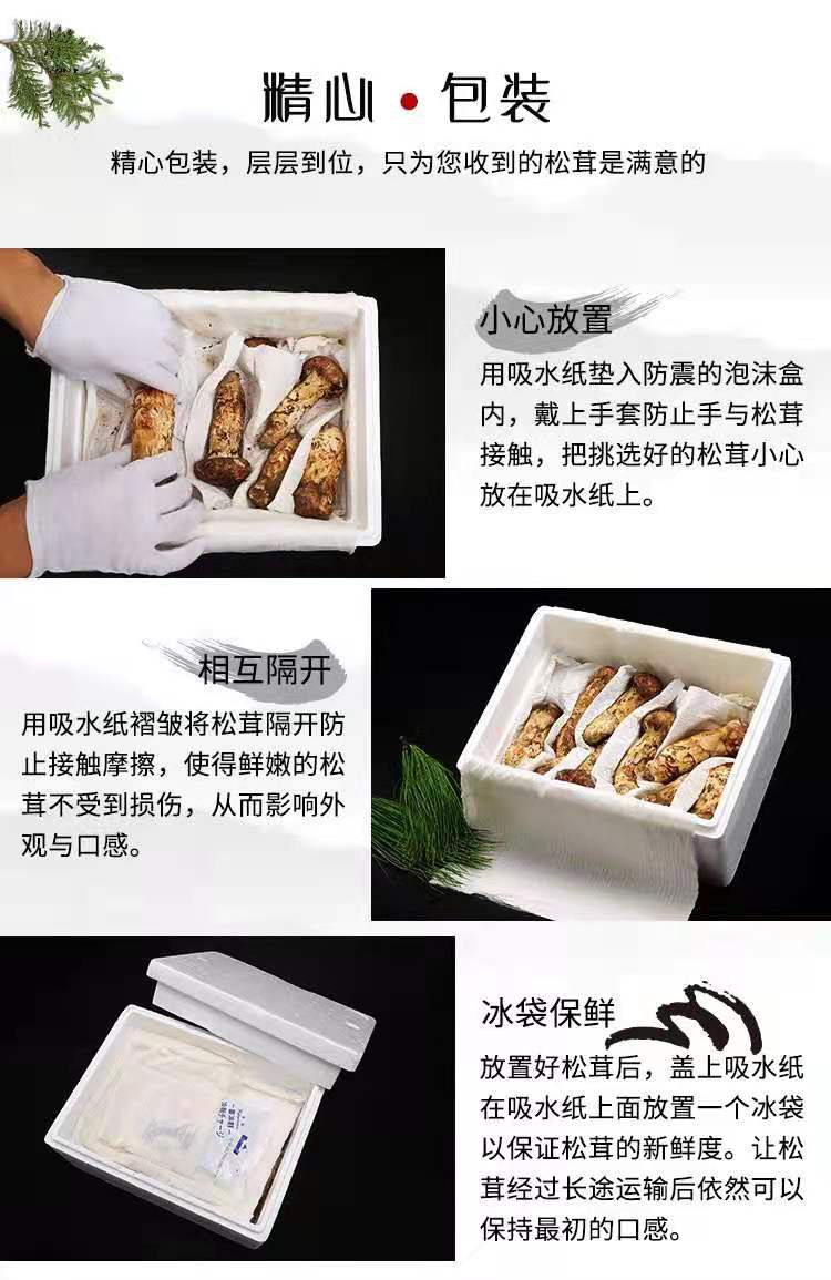 ②我们全程在冷库装箱,先入冷库预冷让松茸中心温度降至1-5度,再加入冰袋发冷链,保证松茸不会由于打包盒内温差过高而受损,保障每一位客户收到高品质高完整度的新鲜松茸,