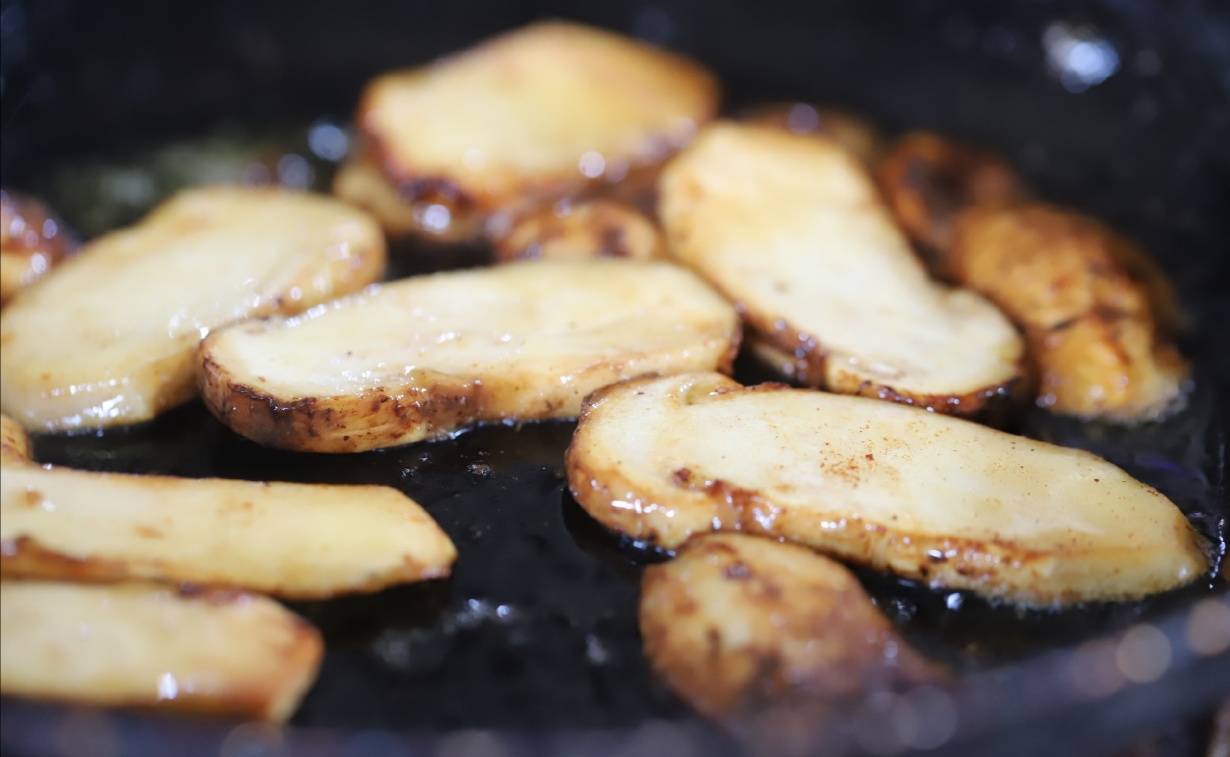平底锅加热后,将黄油慢慢化开,然后放入松茸片小火煎至双面微黄即可,煎时每面洒一点点盐提味。