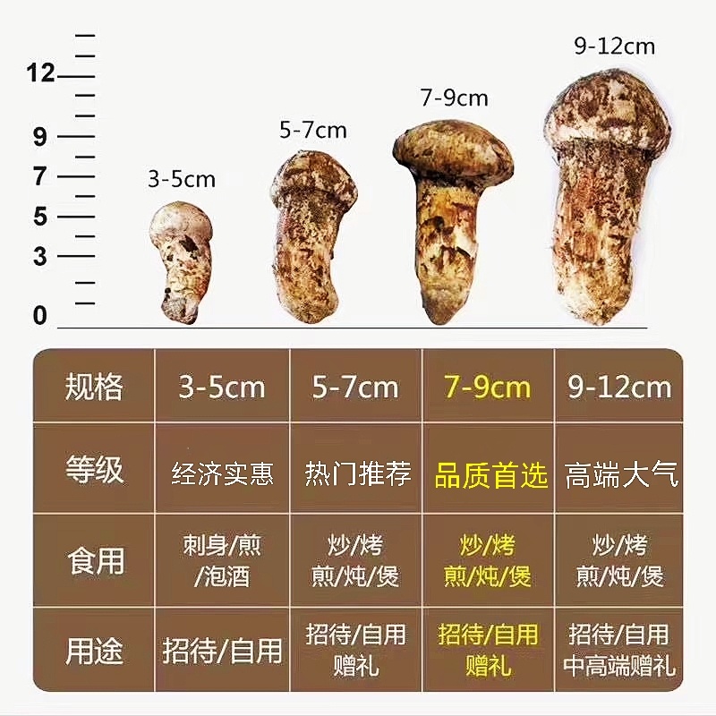 ●未开伞一级新鲜松茸,又根据松茸尺寸分为不同规格,具体如下图:
