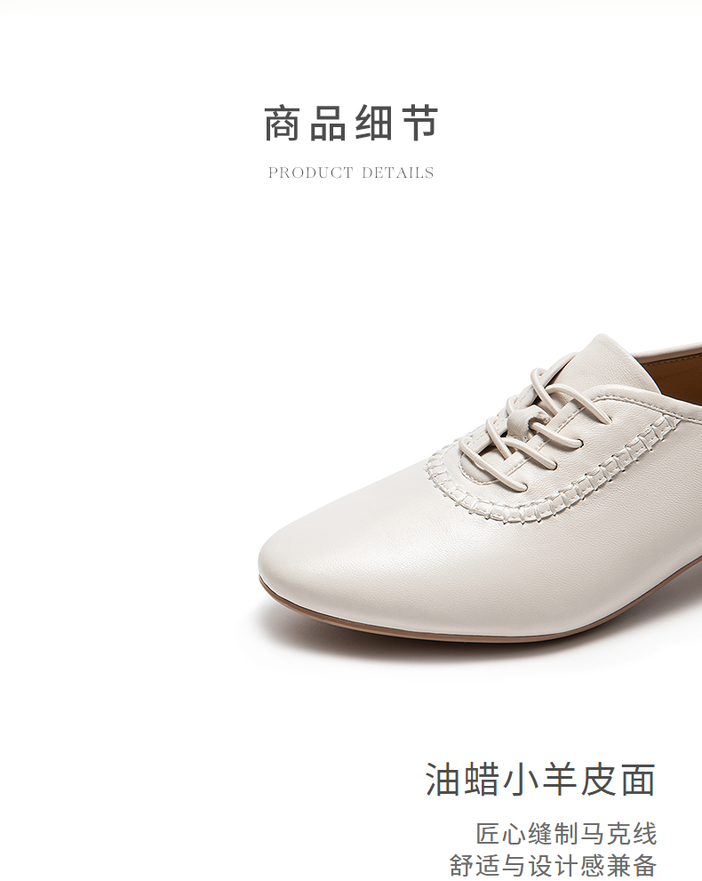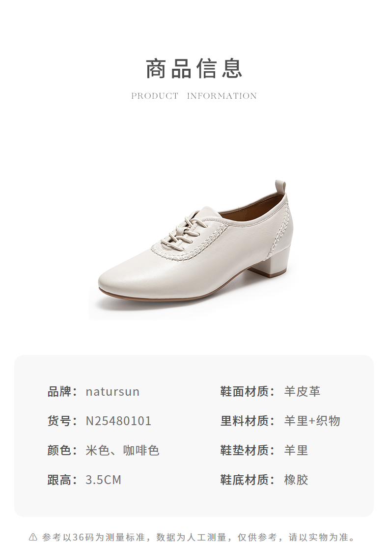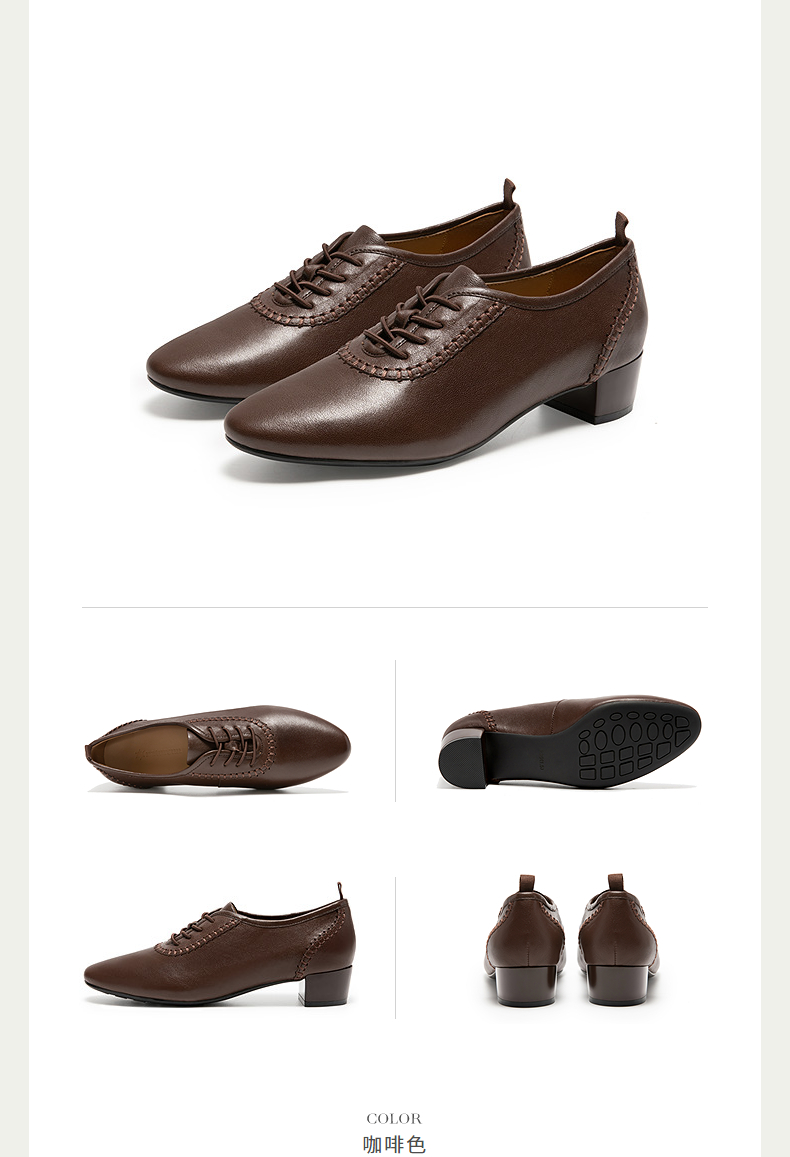 natursun尖头单鞋女系带简约百搭粗跟英伦风休闲皮鞋N25480101
