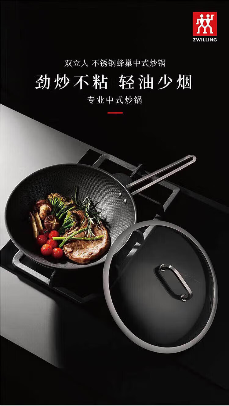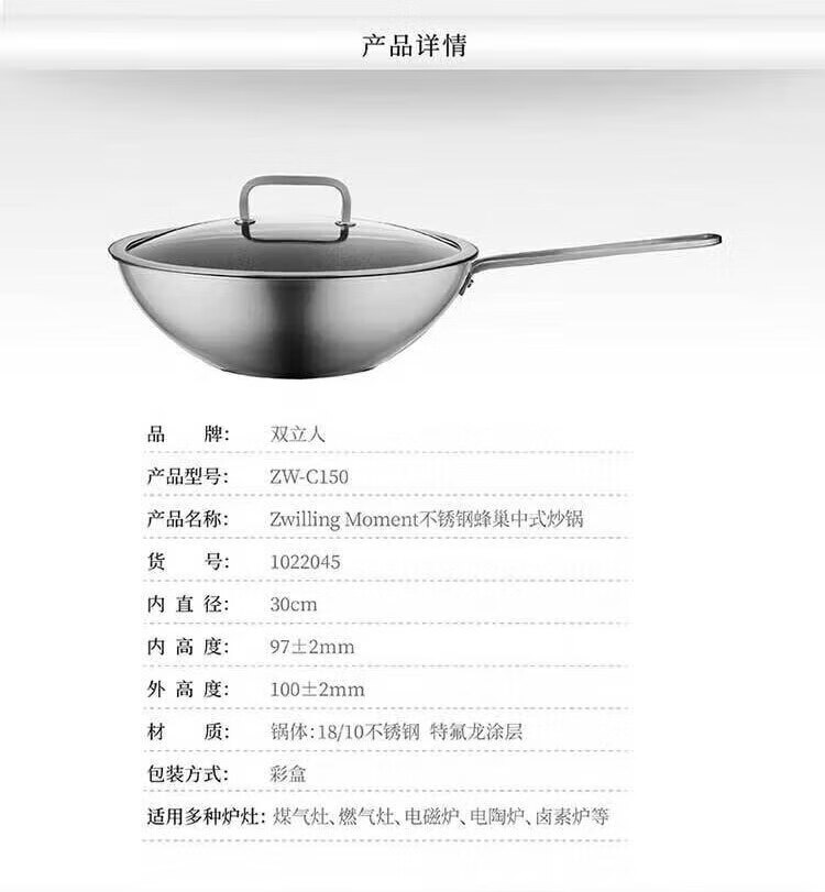 双立人(ZWILLING) 炒锅 Moment 30cm 不锈钢蜂巢中式炒锅 不粘涂层 ZW-C150