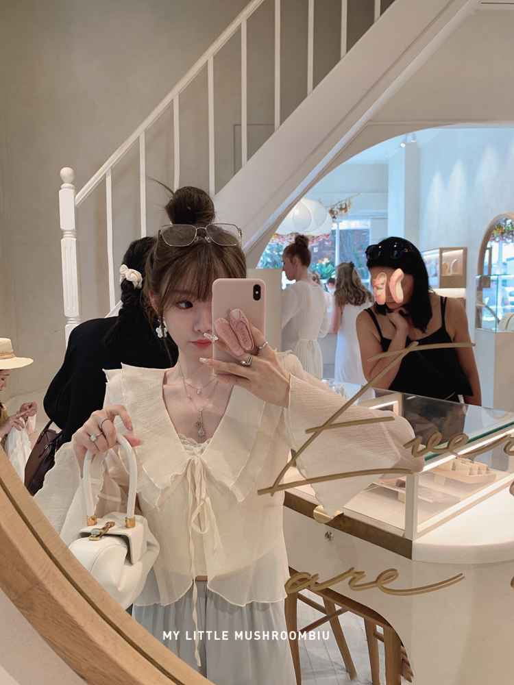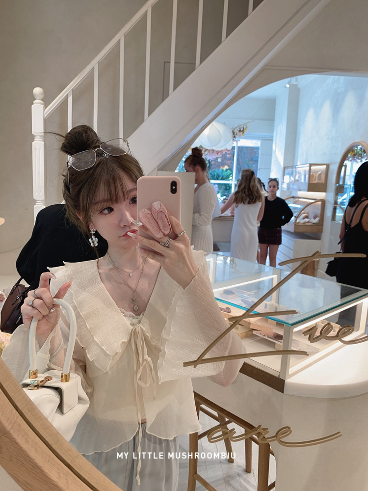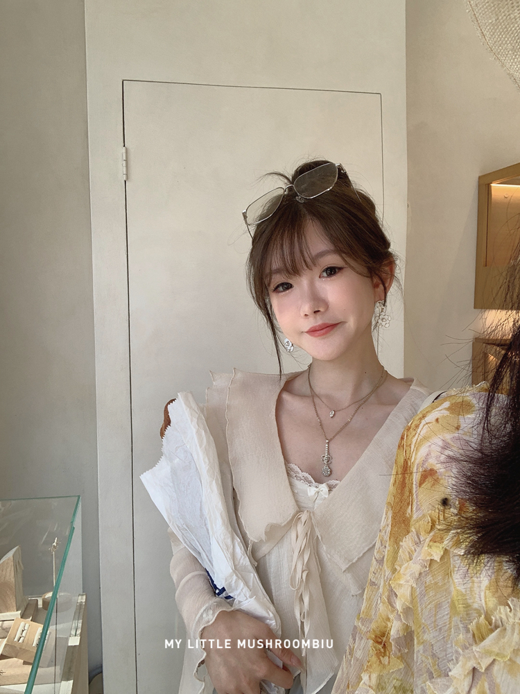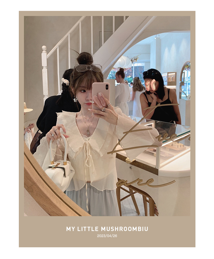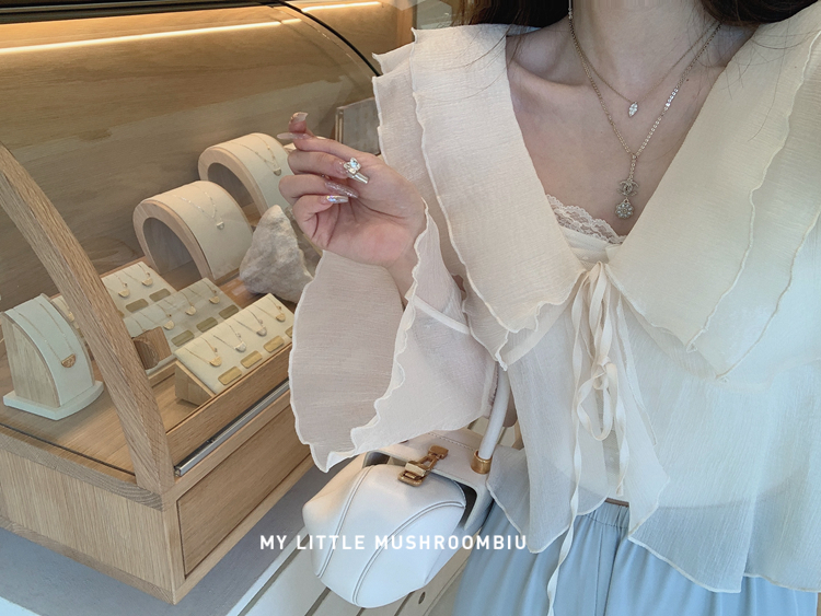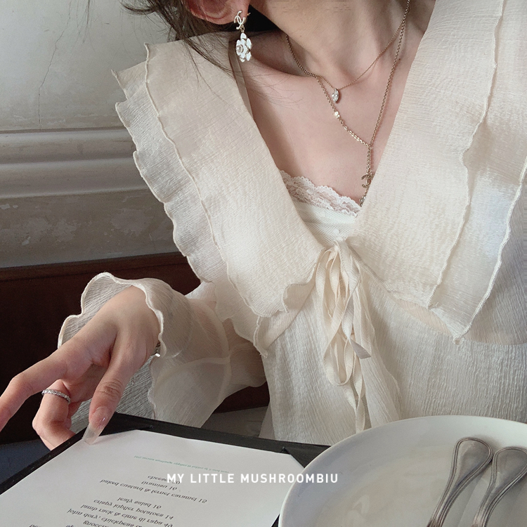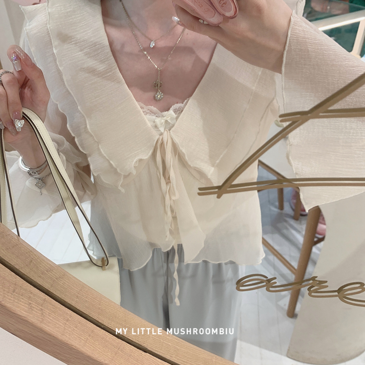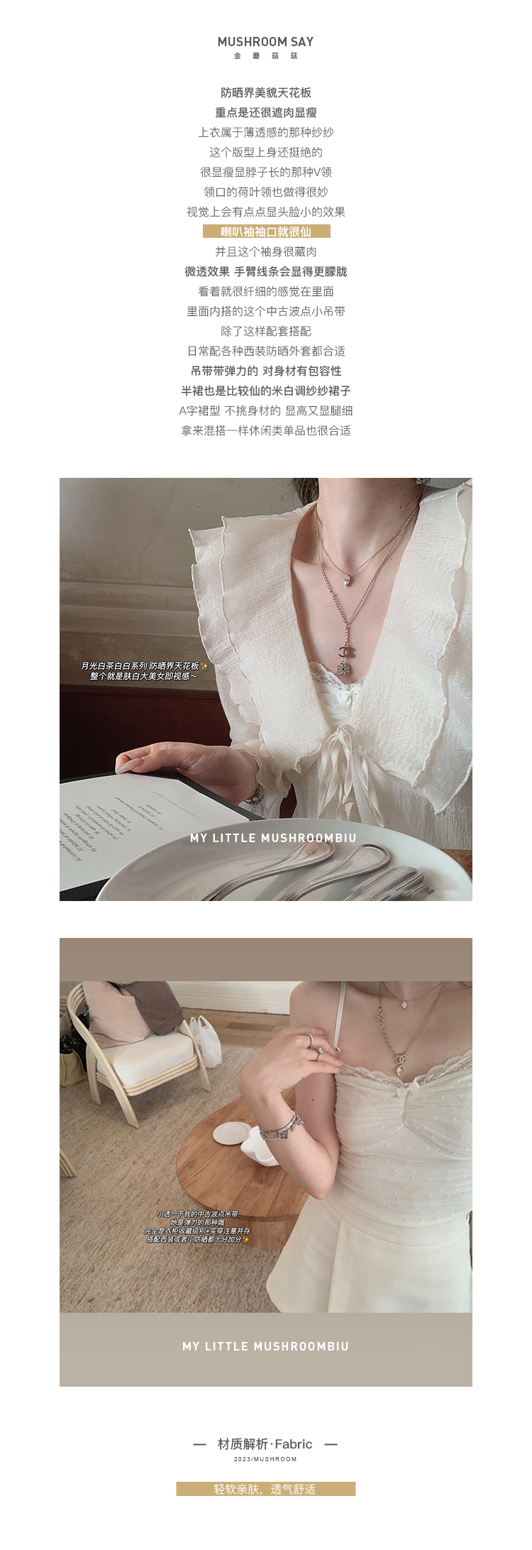 金蘑菇菇 doucuer月光白茶 / 温柔荷叶领喇叭袖仙气上衣防晒小衫