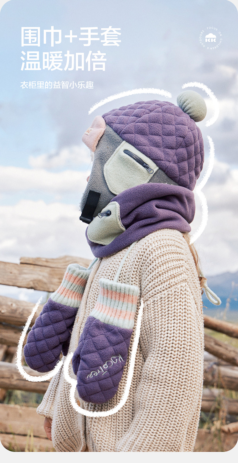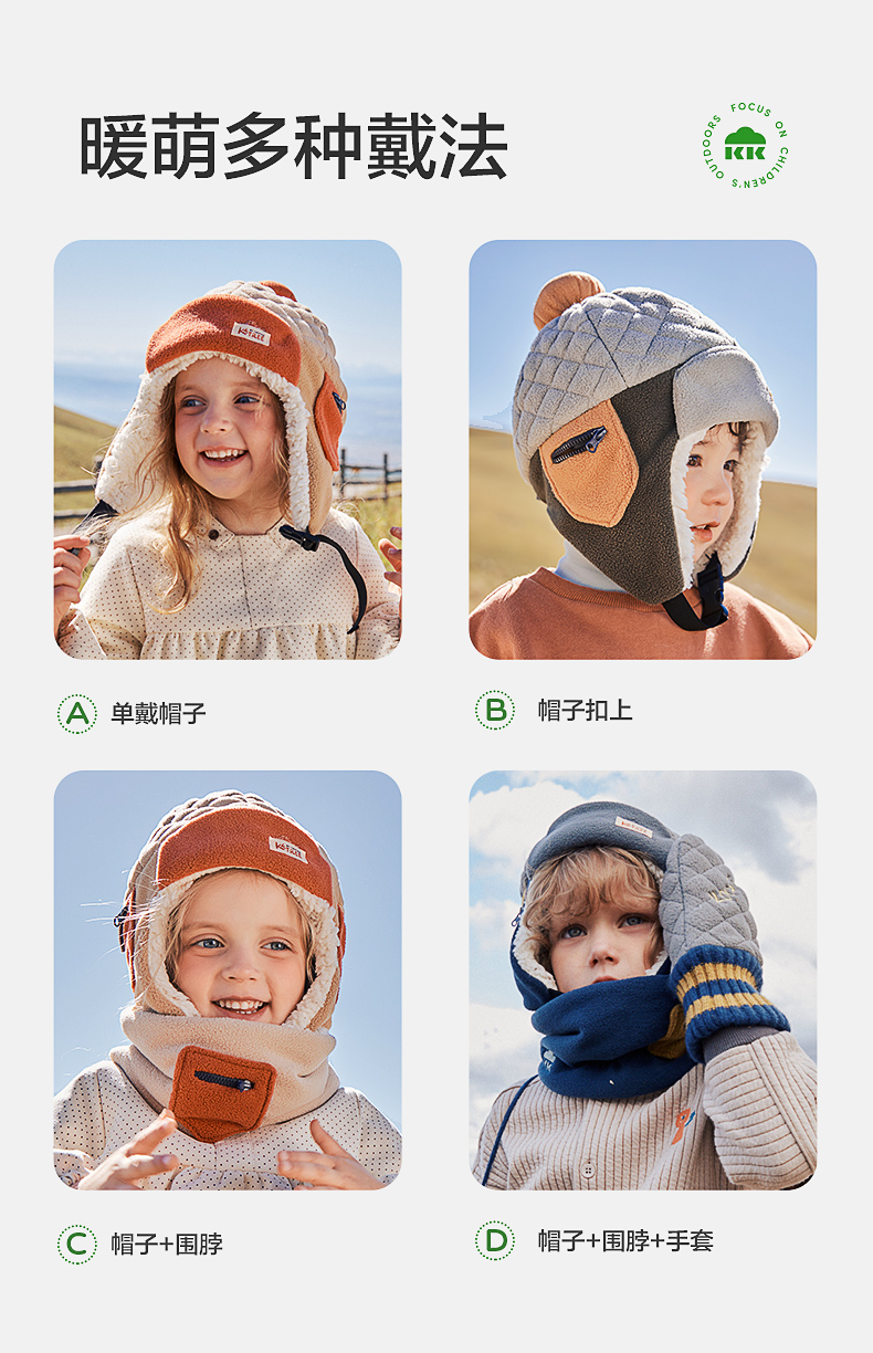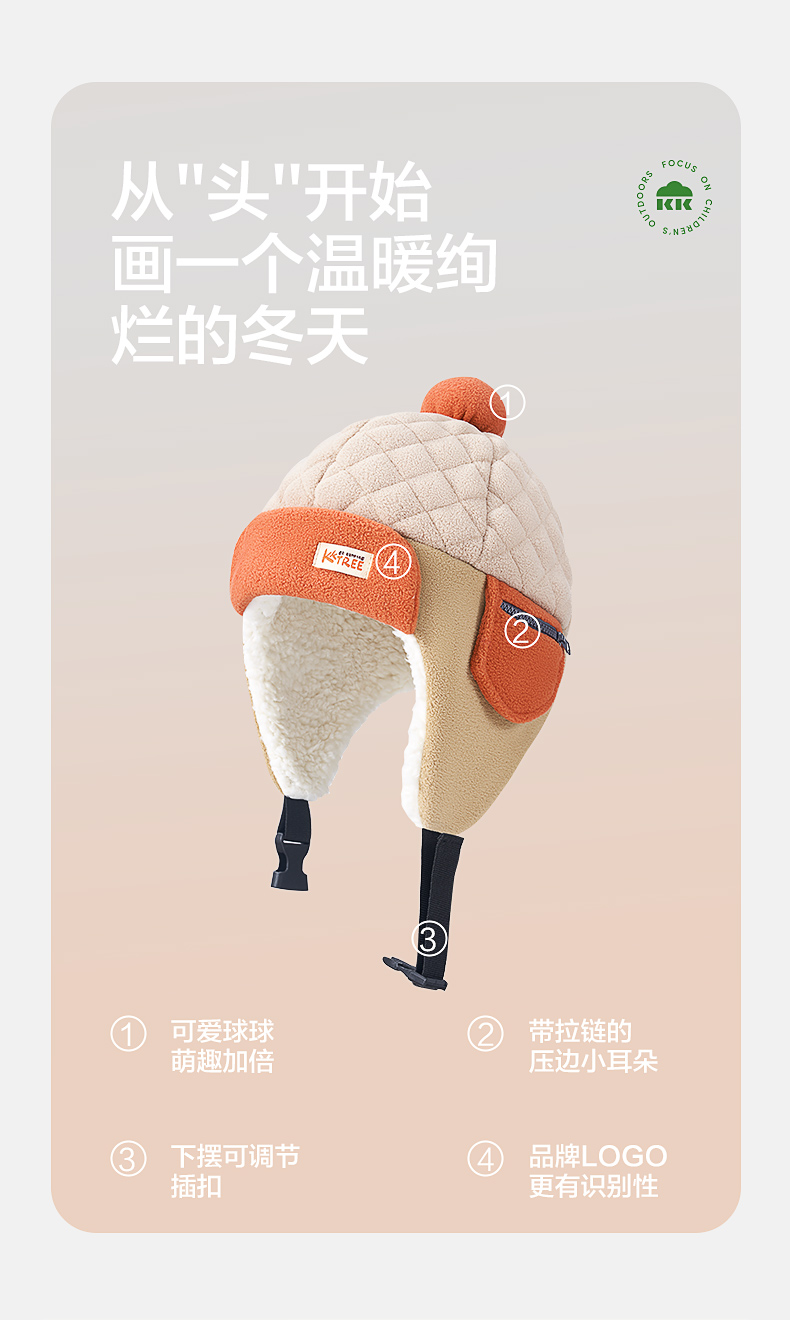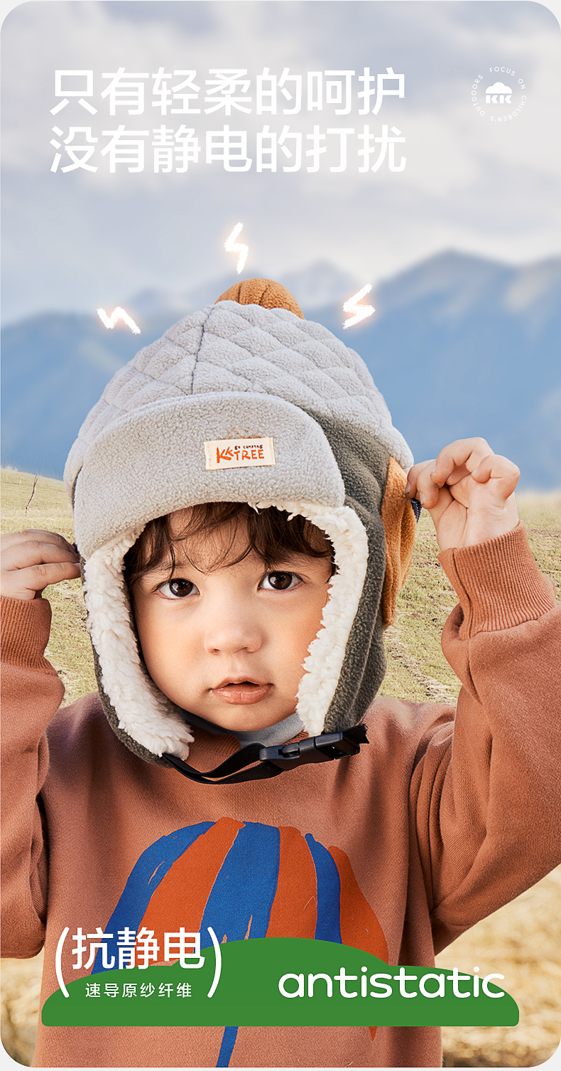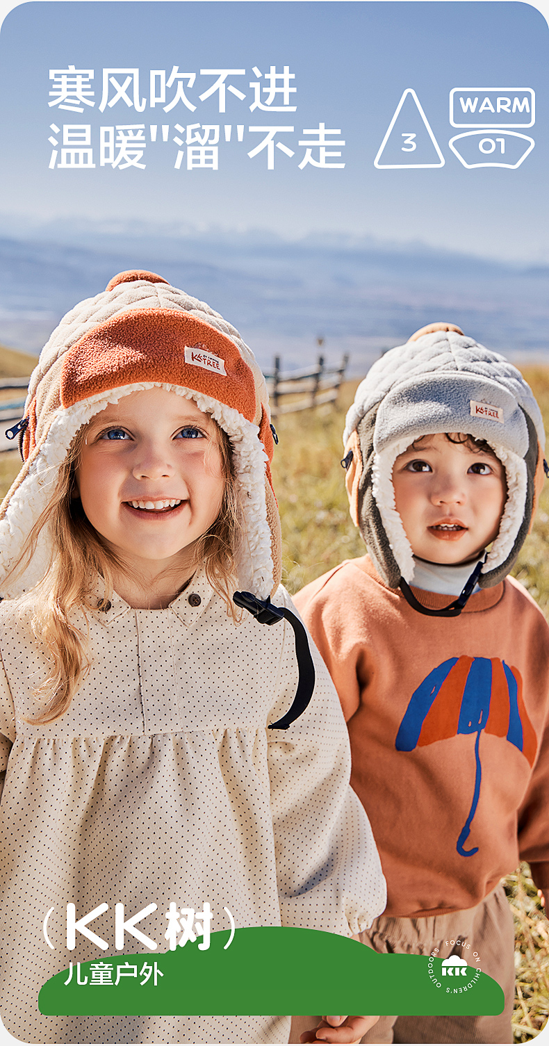 KK树绒绒护耳帽儿童帽子秋冬款宝宝雷锋帽保暖抗静电男童女孩A类野营日记护耳帽
