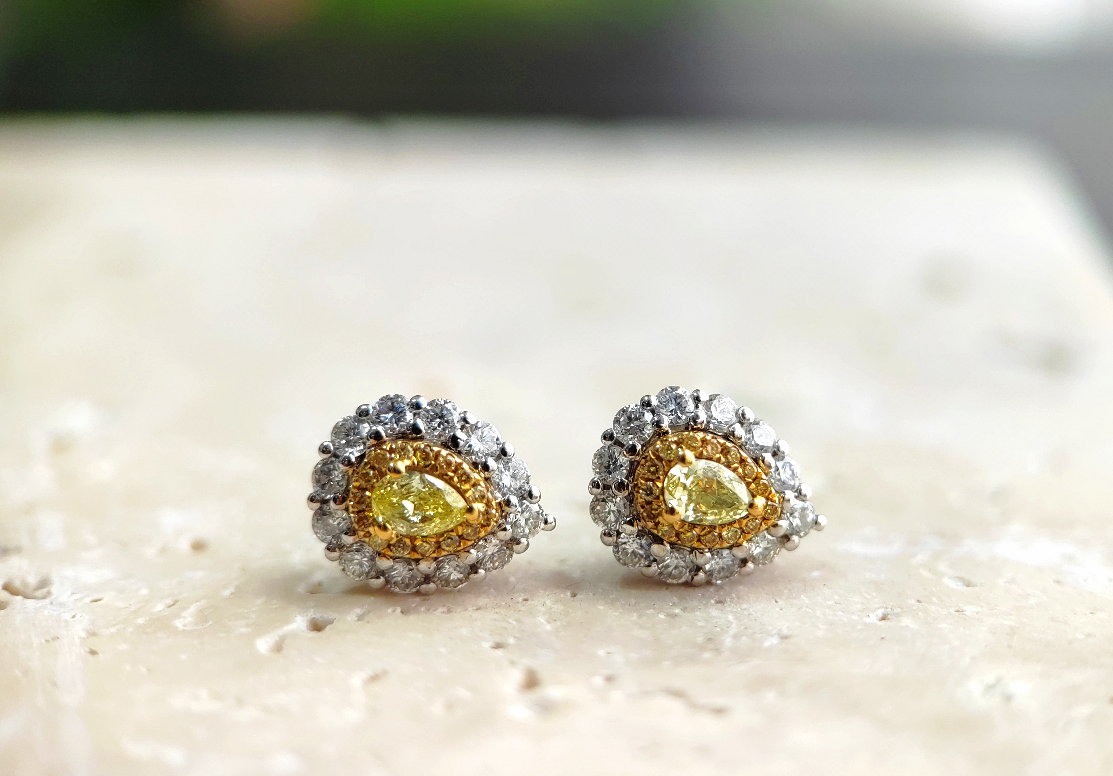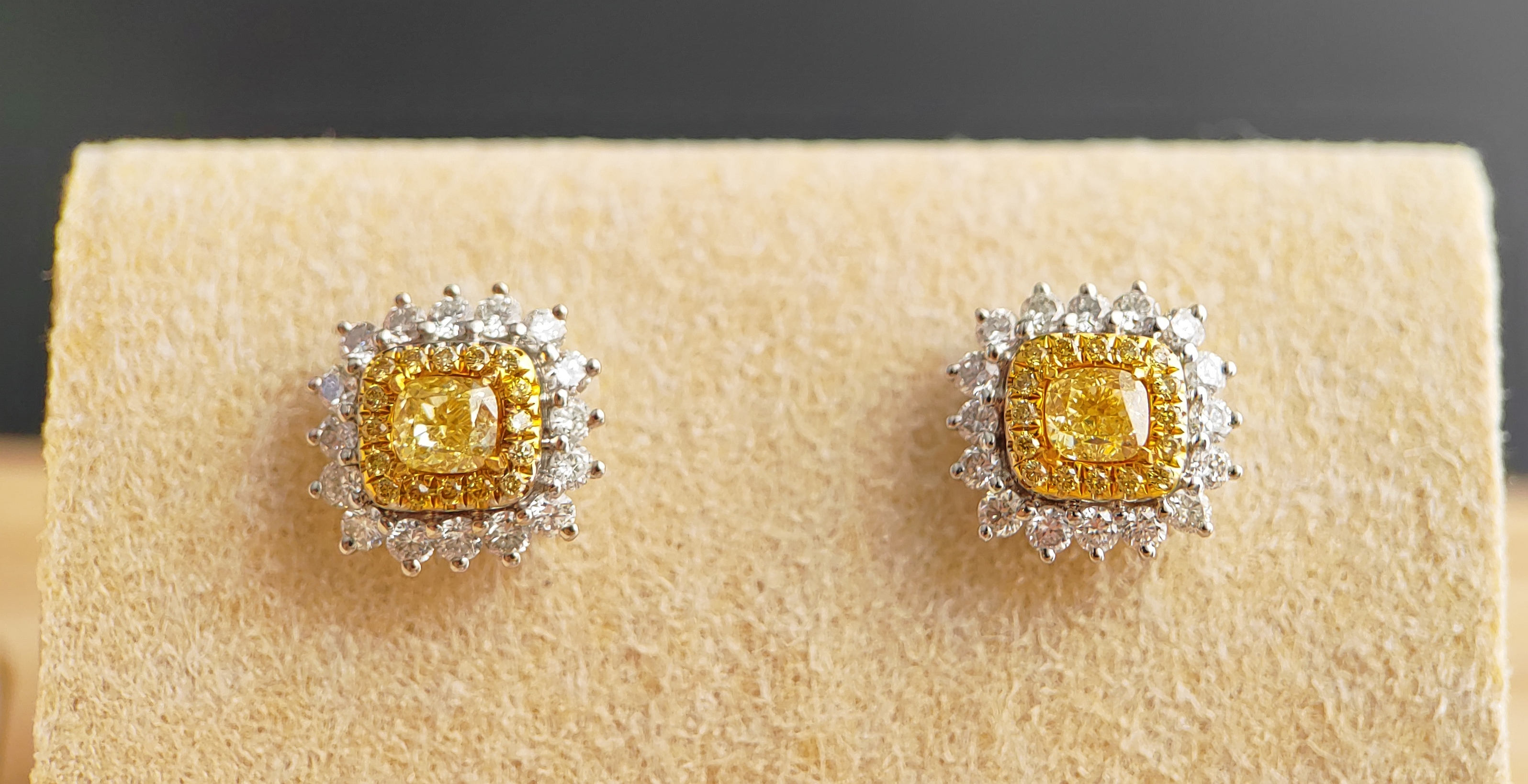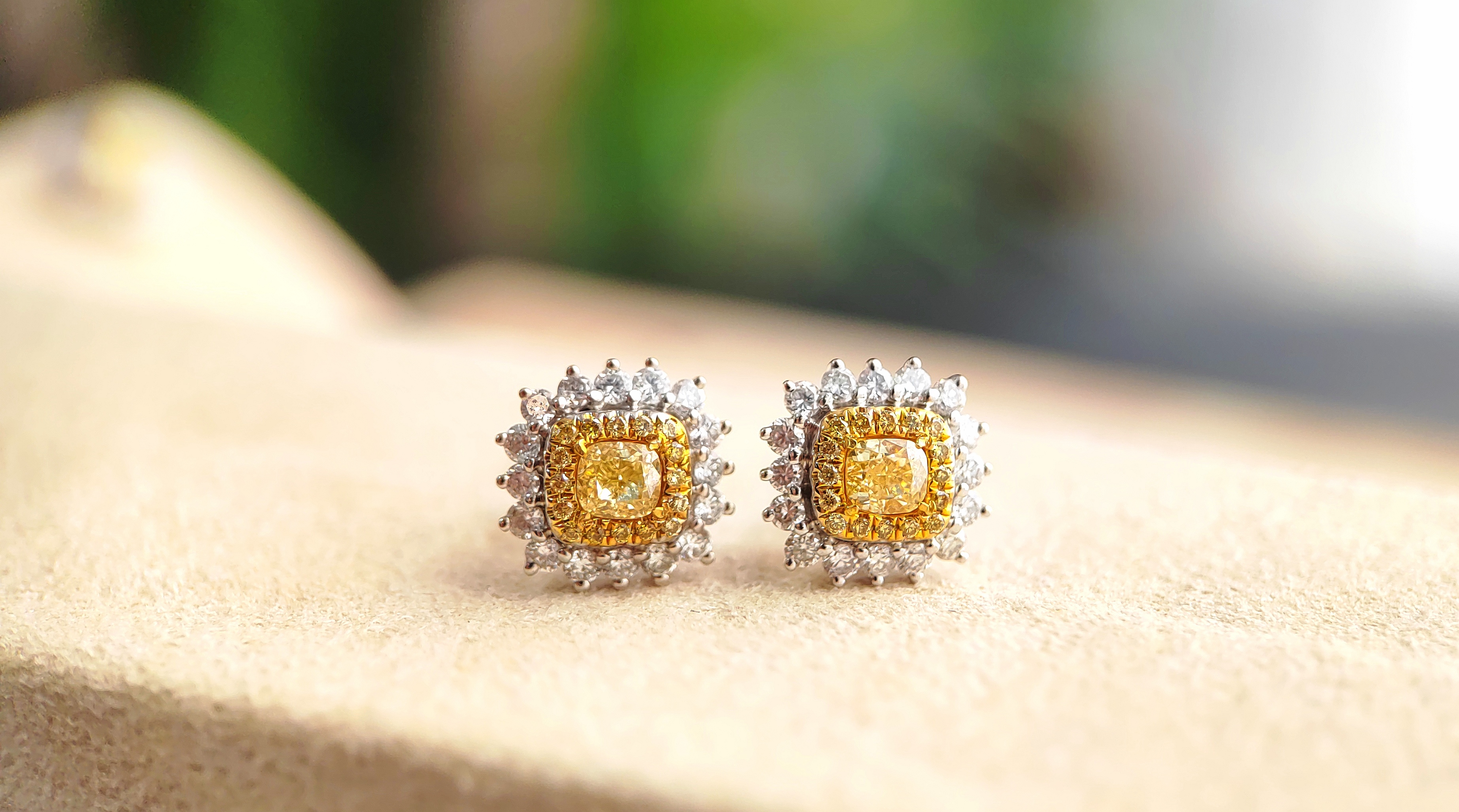 这两对黄钻耳钉,颜色达到fancy light yellow,显色镶嵌后饱和度高,配以简约设计,豪华镶嵌更显火彩璀璨,佩戴后耳间流光溢彩。
