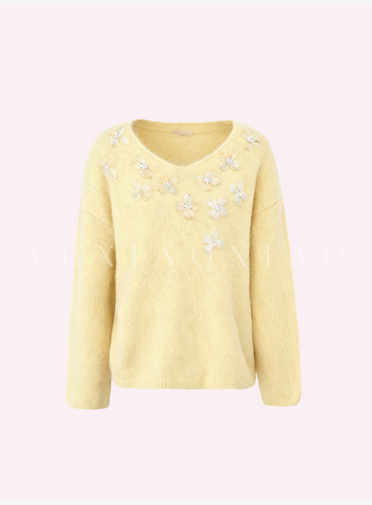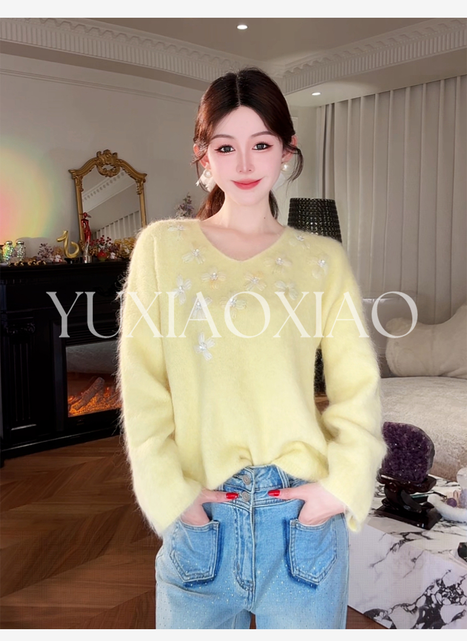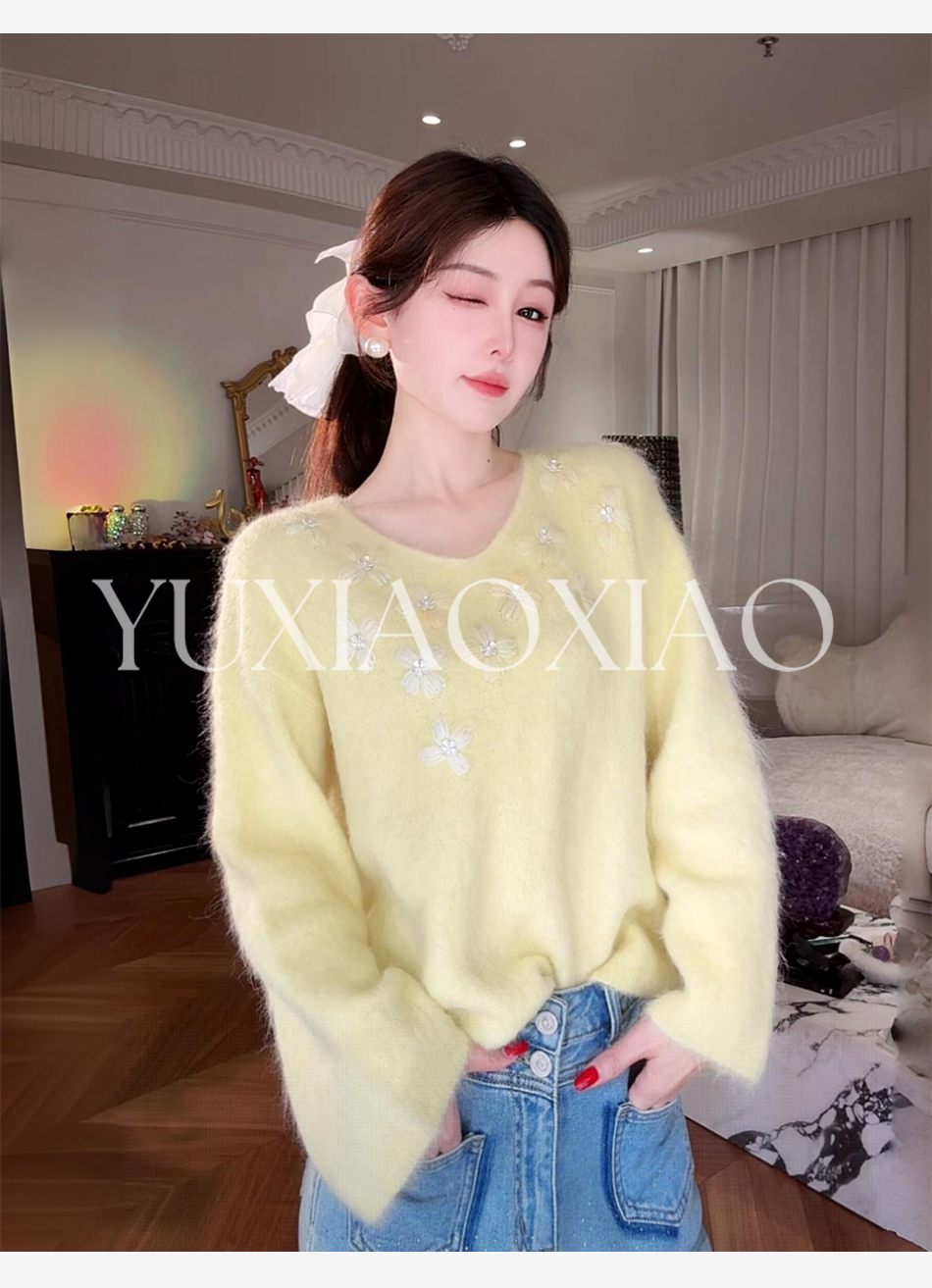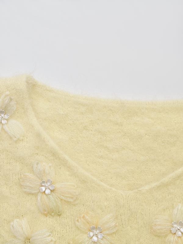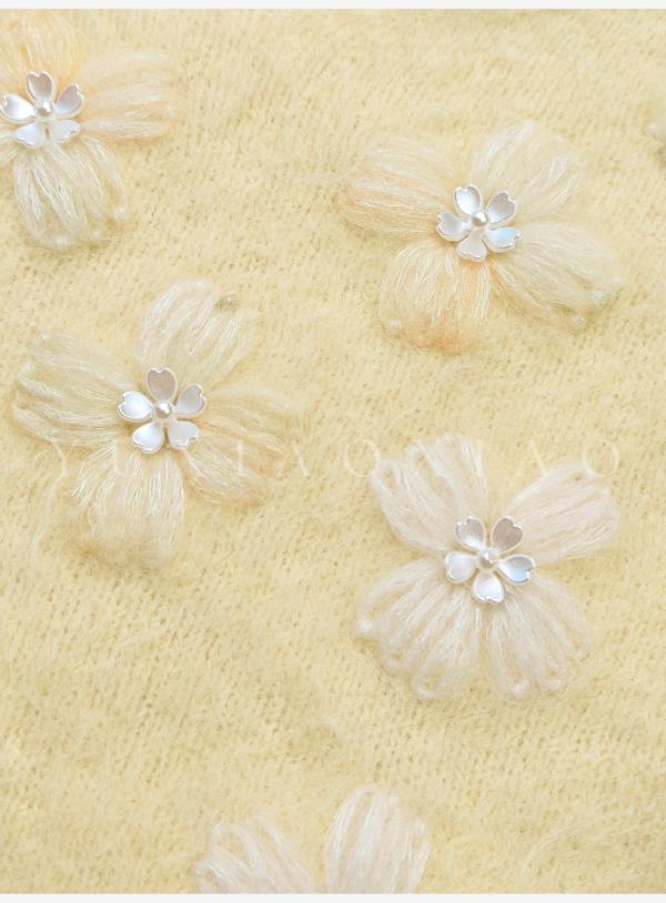 余潇潇【雏菊画幕】慵懒时髦羊驼毛混纺拼立体花朵刺绣V领宽松毛衣