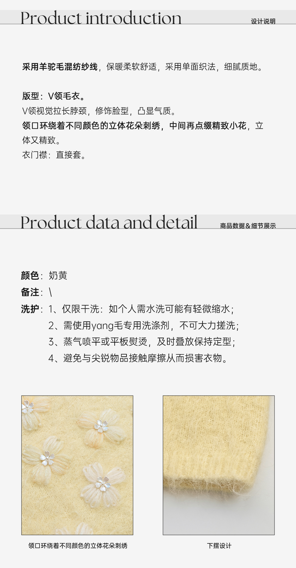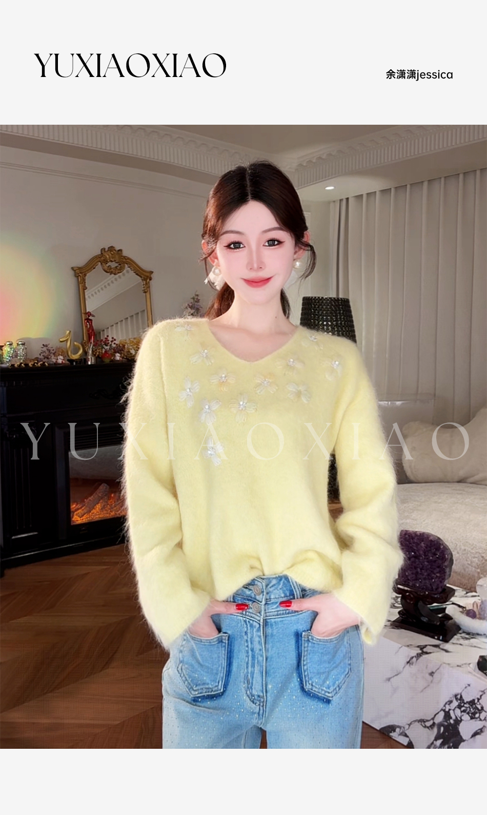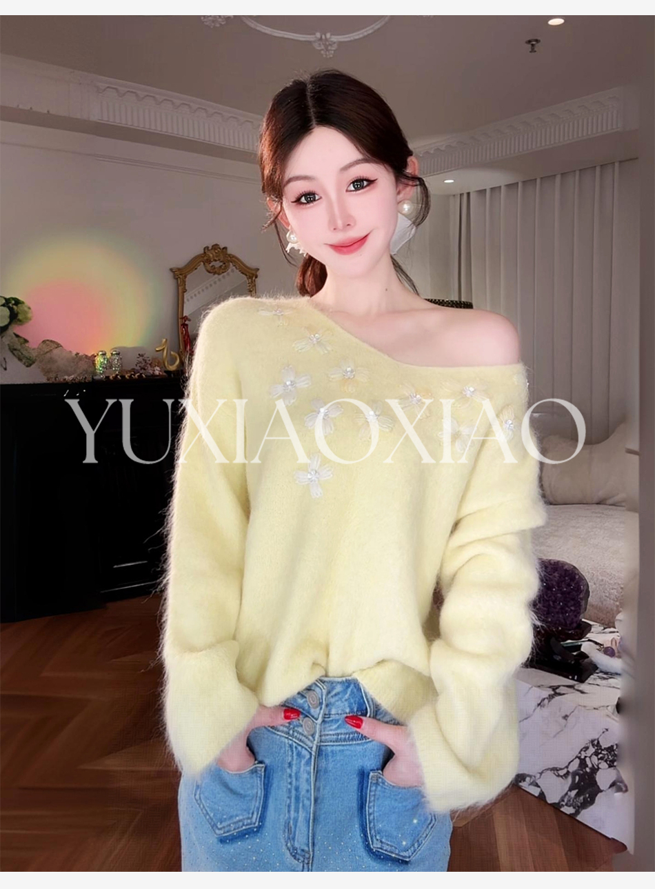余潇潇【雏菊画幕】慵懒时髦羊驼毛混纺拼立体花朵刺绣V领宽松毛衣
