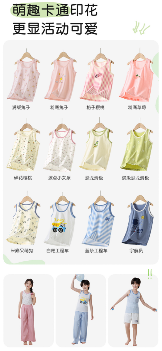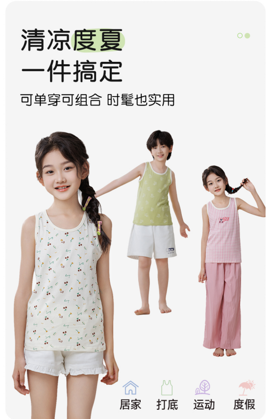 一件背心也可以穿的很洋气 单穿时是元气满满的夏日萌主, 搭配防晒衫秒变 ins 风小潮童 甚至当打底衫穿在小衬衫里 拿捏各种穿搭,秒变时尚小博主