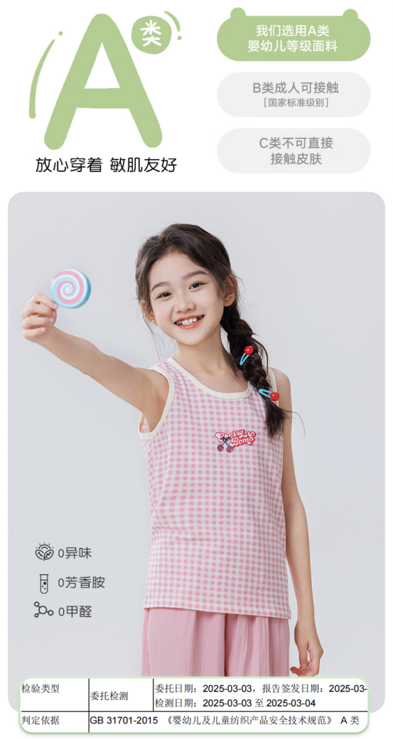 母婴 A 类高标准 给孩子 360° 的安心守护 通过了比成人服装严苛 3 倍的安全检测 不含任何有害化学物质 哪怕是敏感肌的宝宝也能安心穿