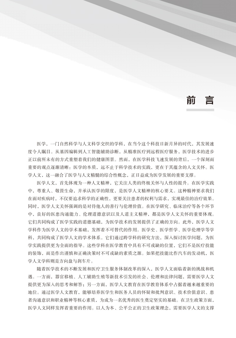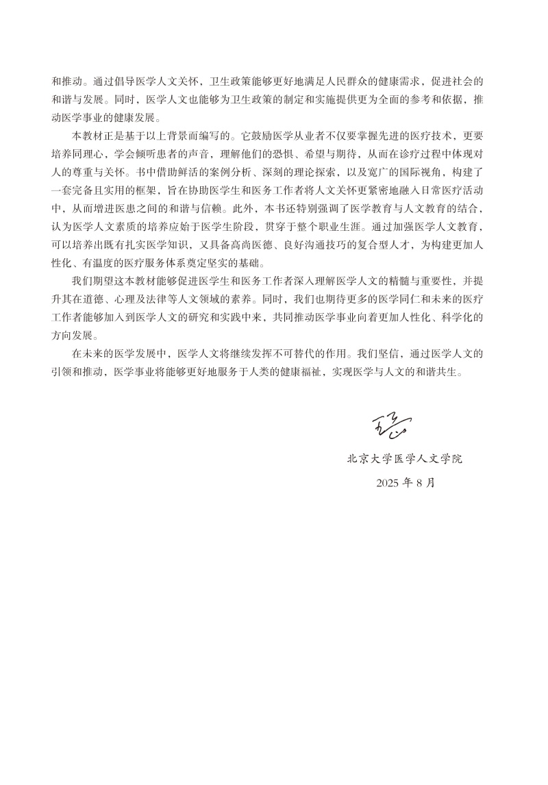 本书为北大医学研究生规划教材,共13章,内容涵盖医学史、医学哲学、叙事医学、医学伦理学、医事法学、医学美学、医学人类学、医学社会学、医学心理学等医学人文学科的多个领域。本书旨在通过多学科的视角,系统介绍医学人文的核心内容,为医学教育工作者、医学生及相关研究人员提供全面的理论参考和实践指导。本教材内容鼓励医学从业者不仅要掌握先进的医疗技术,更要培养同理心,学会倾听患者的声音,理解他们的恐惧、希望与期待,从而在诊疗过程中体现对人的尊重与关怀。书中借助鲜活的案例分析、深刻的理论探索,以及宽广的国际视角,构建了一套完备且实用的框架,旨在协助医学生和医务工作者将人文关怀更紧密地融入日常医疗活动中,从而增进医患之间的和谐与信赖。此外,本书还特别强调了医学教育与人文教育的结合,认为医学人文素质的培养应始于医学生阶段,贯穿于整个职业生涯。