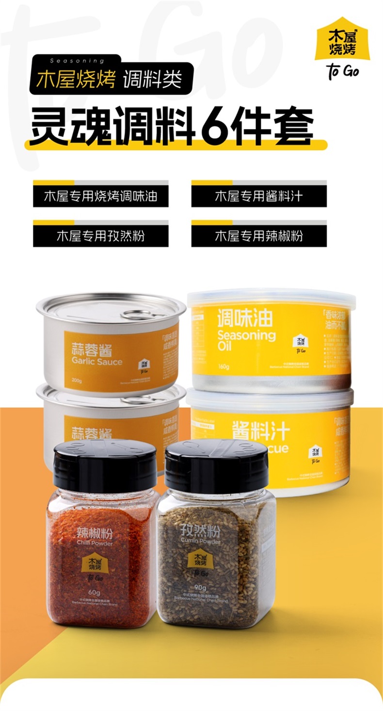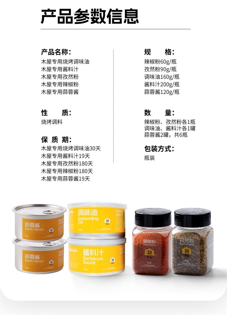 调料6件套(孜然粉90g*1+辣椒粉60g*1+调味油160g*1+酱料汁200g*1+蒜蓉酱120g*2)烧烤调料