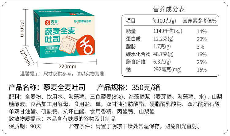 【积分兑换】藜麦全麦吐司350g/箱
