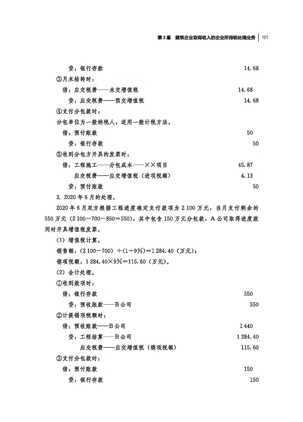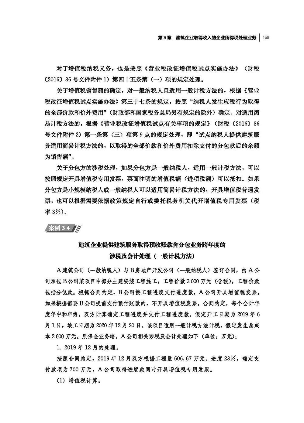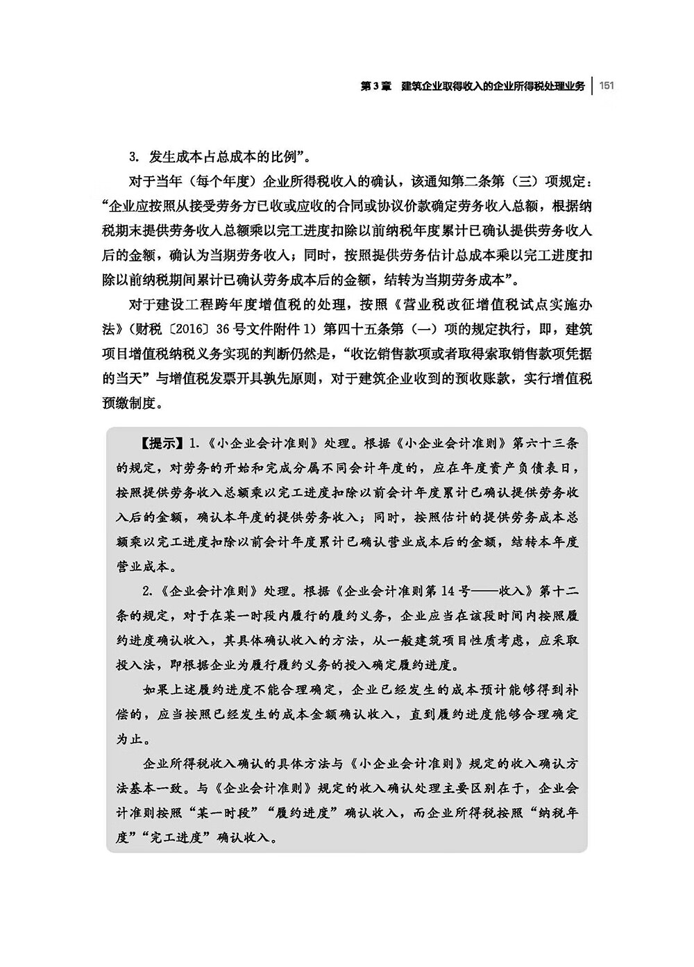 第3章“建筑企业取得收入的企业所得税处理业务”:以企业在实务中遇到的各类收入确认(企业所得税收入)等业务为主,为简化突出重点,略去企业所得税的具体计算。由于收入的确认与增值税密切相关,同时增值税纳税义务与企业所得税收入确认有差异,因此在分析时,为比对政策,一些条目内容(与第2章、本章)有一定重复;