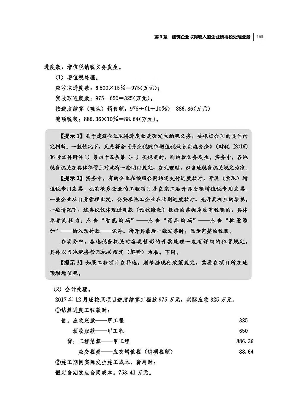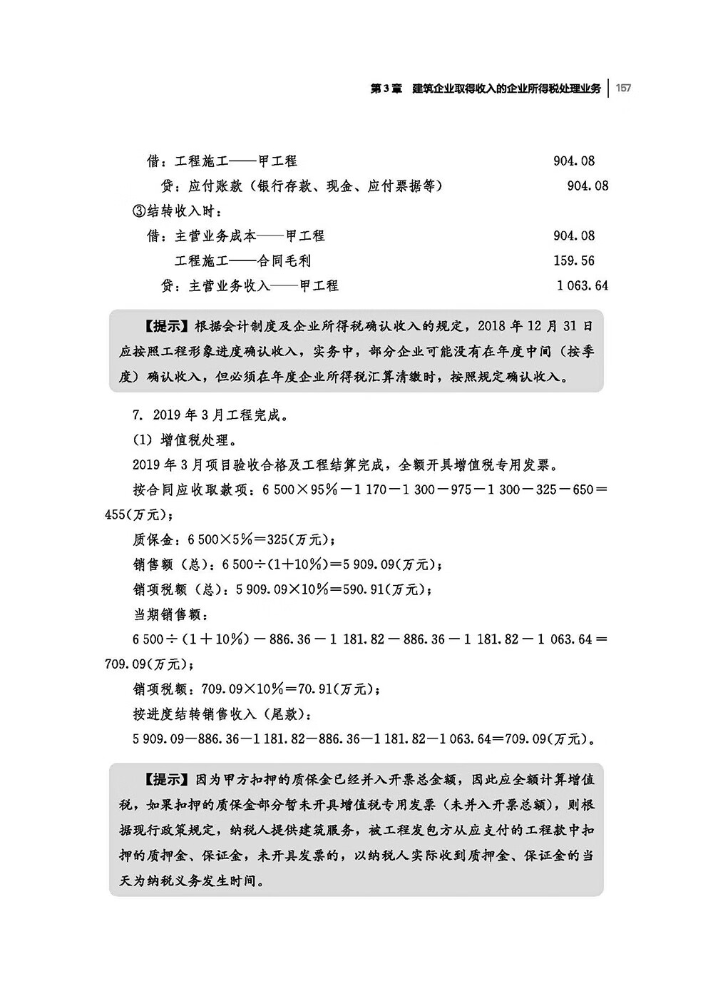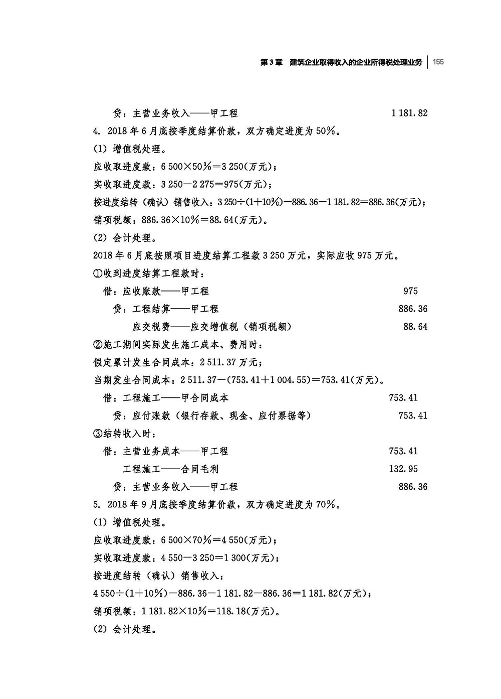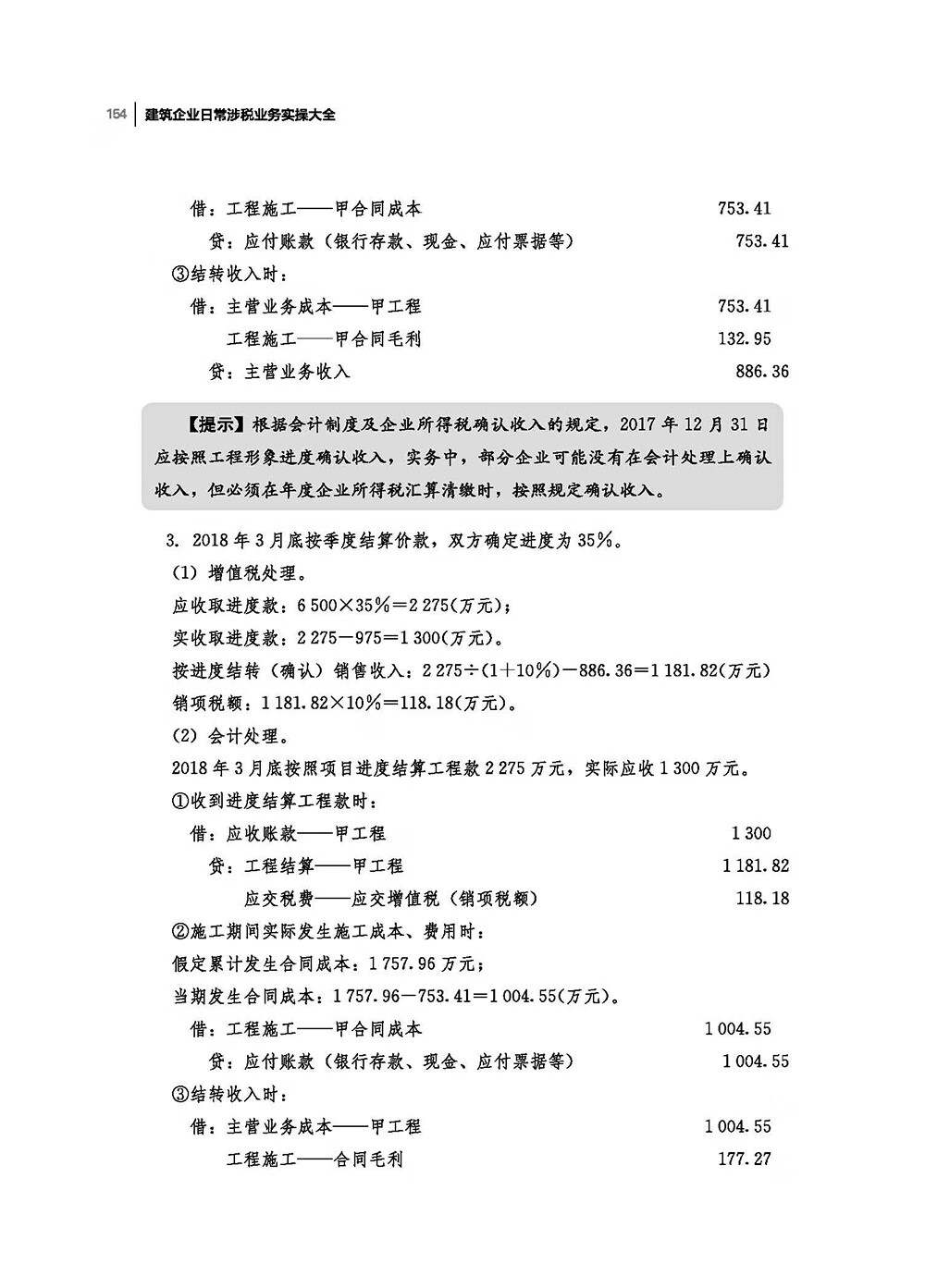 第3章“建筑企业取得收入的企业所得税处理业务”:以企业在实务中遇到的各类收入确认(企业所得税收入)等业务为主,为简化突出重点,略去企业所得税的具体计算。由于收入的确认与增值税密切相关,同时增值税纳税义务与企业所得税收入确认有差异,因此在分析时,为比对政策,一些条目内容(与第2章、本章)有一定重复;