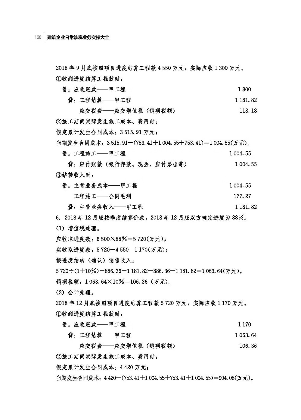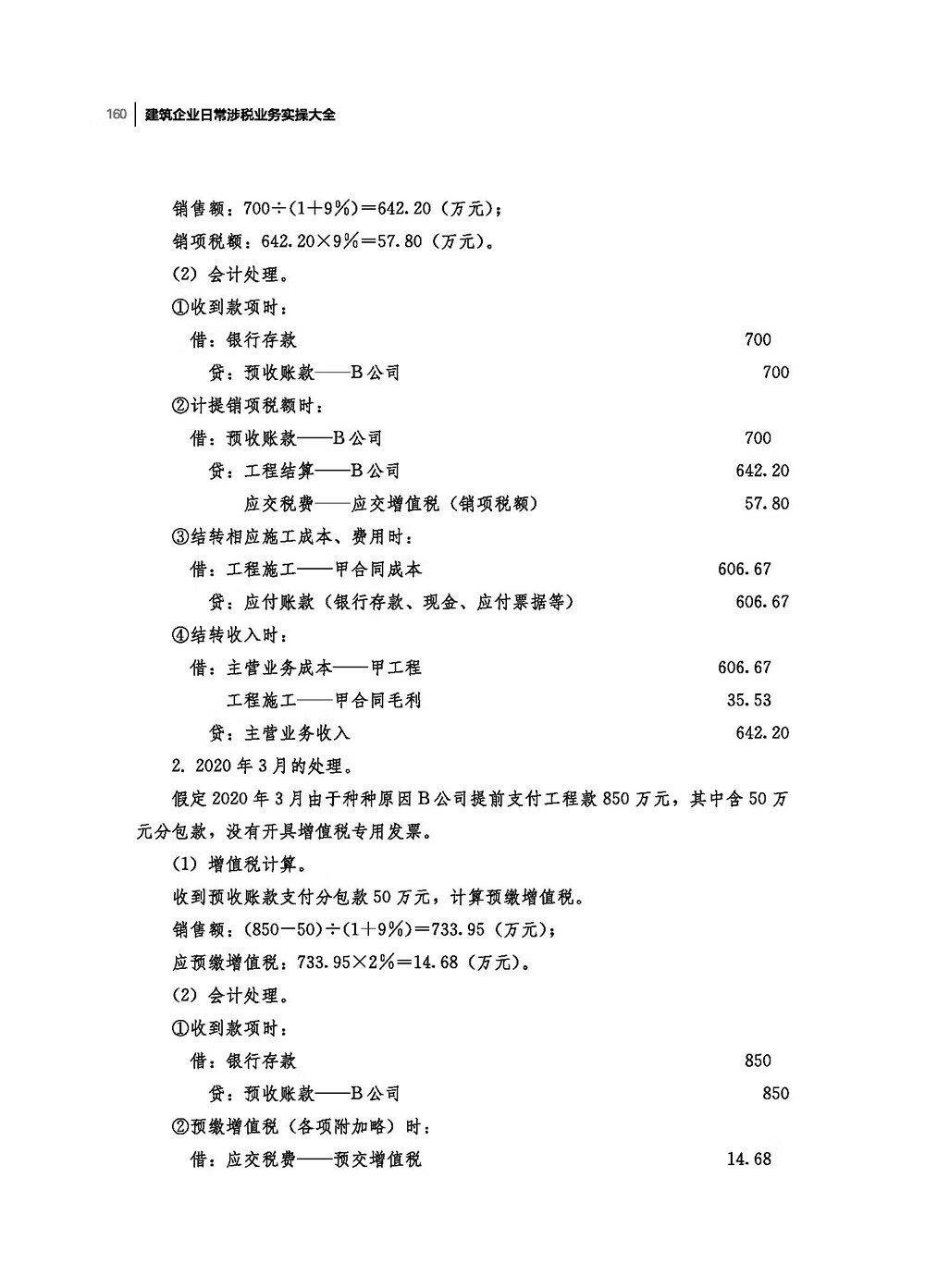 【提示】上述案例根据实际发生业务改编,目的是突出相关涉税要点,例如预缴增值税、全款开具增值税发票等。实务中,由于种种原因,有些建筑企业(或项目)对工程款没有采取预收账款(不采用“预收账款”科目)方式,而是采取“应收账款”(采用“应收账款”科目)方式,在日常处理时,如果收取的款项符合预收账款性质的,仍然要按照政策规定处理。