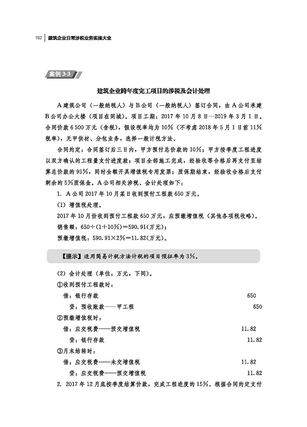 近几年税收新政不断推出,特别是营改增、个人所得税法修订及相关企业所得税政策出台等,使实务中各种涉税业务的处理发生了较大变化。建筑企业由于自身架构特点、会计核算特点等,出现了很多值得分析的涉税业务问题,例如,纳税人提供建筑服务增值税纳税义务确定的时点与企业所得税收入确认的时点差异、建设方要求施工方提前开具增值税发票、工程项目收取进度款不及时与收入确认之间的涉税处理、工程施工成本的归集与结转金额的所得税处理,等等。这些不仅是税务机关需要及时了解的内容,更是建筑企业财务人员在实操中需要及时掌握处理方式的难点。为此,我们编写了《建筑企业日常涉税业务实操大全》,本书不是叙述建筑业整体会计核算的书籍,主要目的是针对实务中发生的涉税(或会计处理)业务,分析其中涉及的税收政策应用,以期给税务管理部门、稽查部门、企业财务以及财税中介机构提供一个业务与政策对应的参考索引。