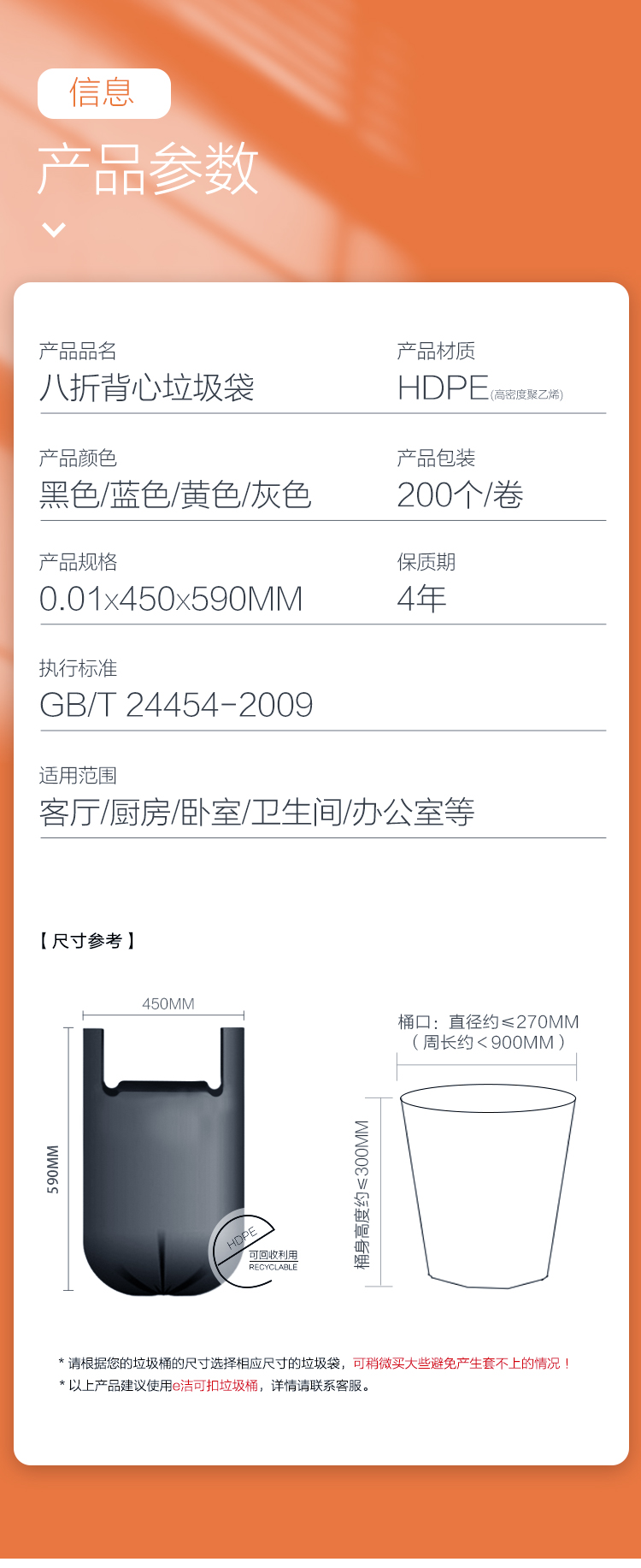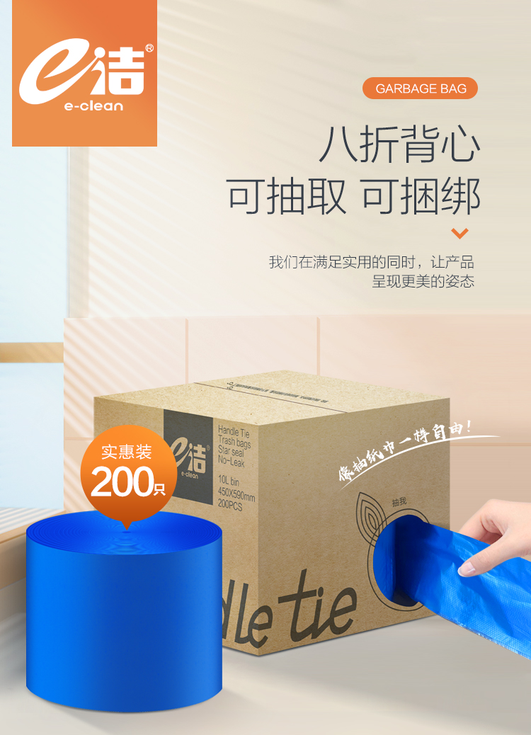 【e洁】八折背心垃圾袋 200只 加厚家用 手提抽取式垃圾袋 厨房中号塑料袋 点断式设计 易撕便捷 48小时发货