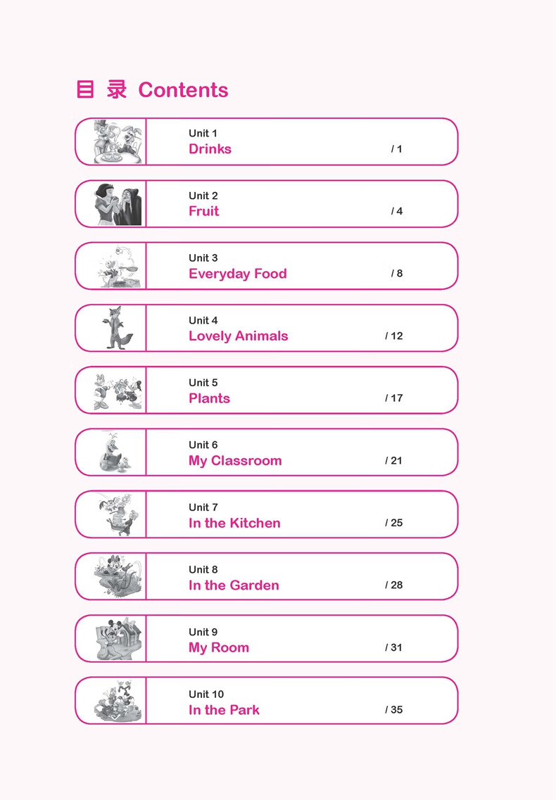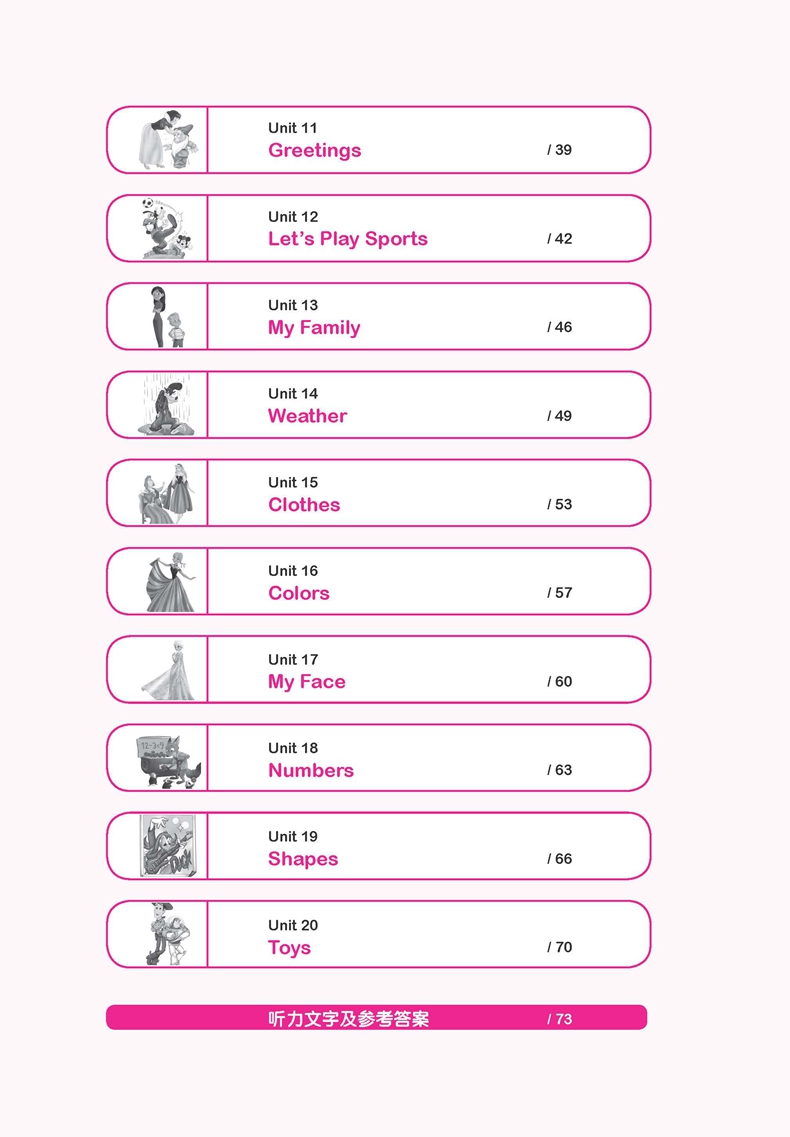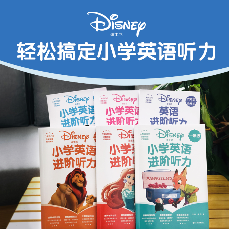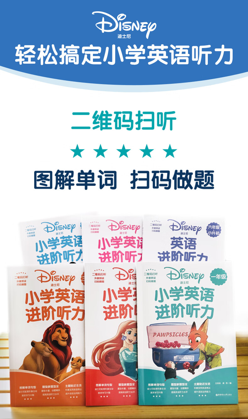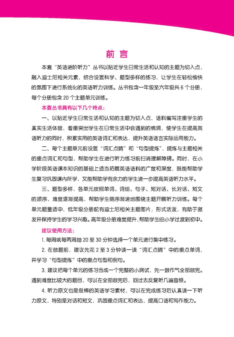 三、题型多样,各单元按照单词、词组、句子、短对话、长对话、短文的顺序,难度逐渐提高,帮助学生循序渐进地围绕主题开展听力训练。每个单元题量适中,低年级分册配有迪士尼相关主题图片,形式活泼,有助于激发并保持学生的学习兴趣。高年级分册难度提升,帮助学生由小学过渡到初中。