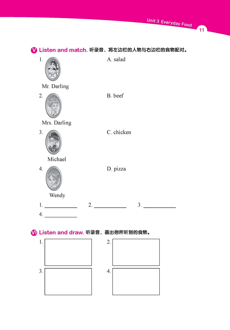 二、每个主题单元前设置“词汇点睛”和“句型提炼”,提炼与主题相关的重点词汇和句型,帮助学生在进行听力练习前扫清理解障碍。同时,在小学阶段英语课本知识的基础上适当拓展英语语料的广度和深度,既能帮助学生复习巩固课内所学,又能帮助学有余力的学生进一步提高英语听力水平。