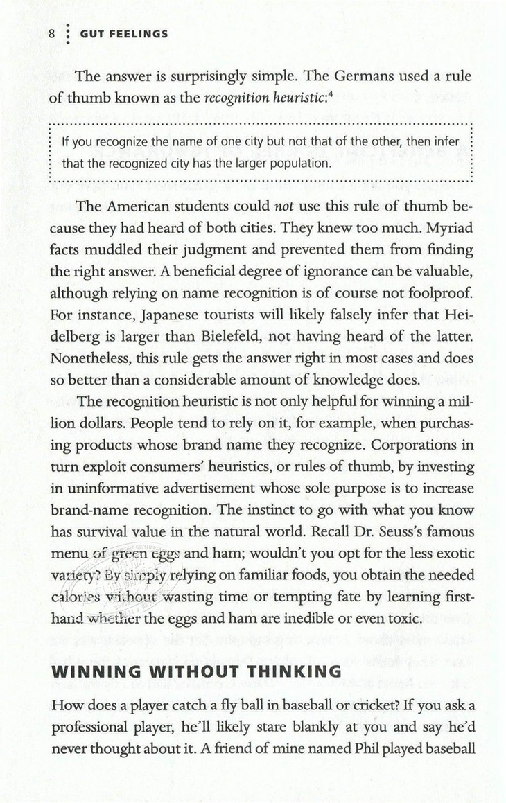 Why is split second decision-making superior to deliberation? Gut Feelings delivers the science behind Malcolm Gladwell's Blink. Reflection and reason are overrated, according to renowned psychologist Gerd Gigerenzer. Much better qualified to help us make decisions is the cognitive, emotional, and social repertoire we call intuition, a suite of gut feelings that have evolved over the millennia specifically for making decisions. Gladwell drew heavily on Gigerenzer's research. But Gigerenzer goes a step further by explaining just why our gut instincts are so often right. Intuition, it seems, is not some sort of mystical chemical reaction but a neurologically based behavior that evolved to ensure that we humans respond quickly when faced with a dilemma (BusinessWeek).