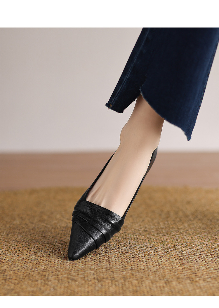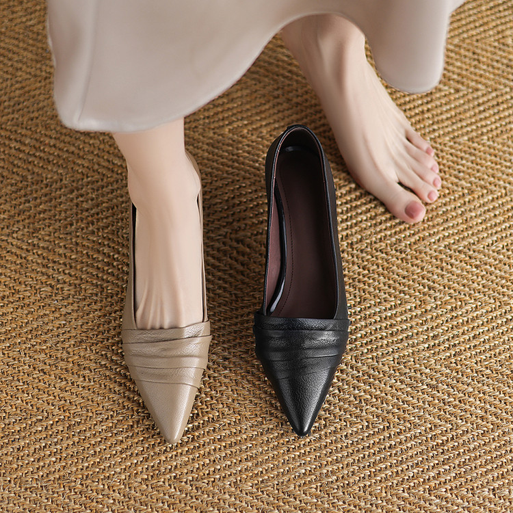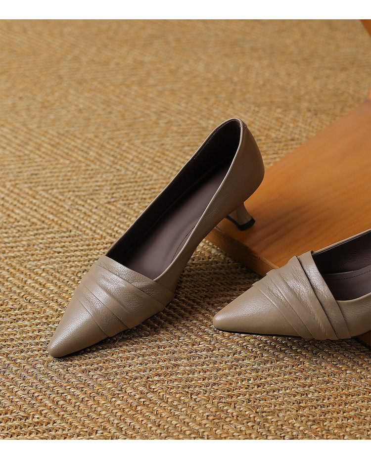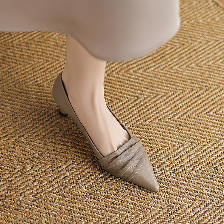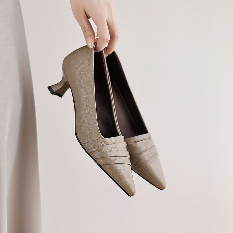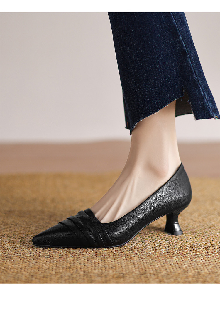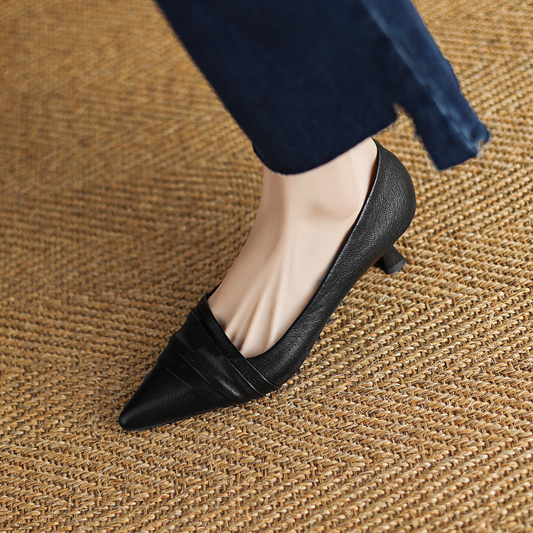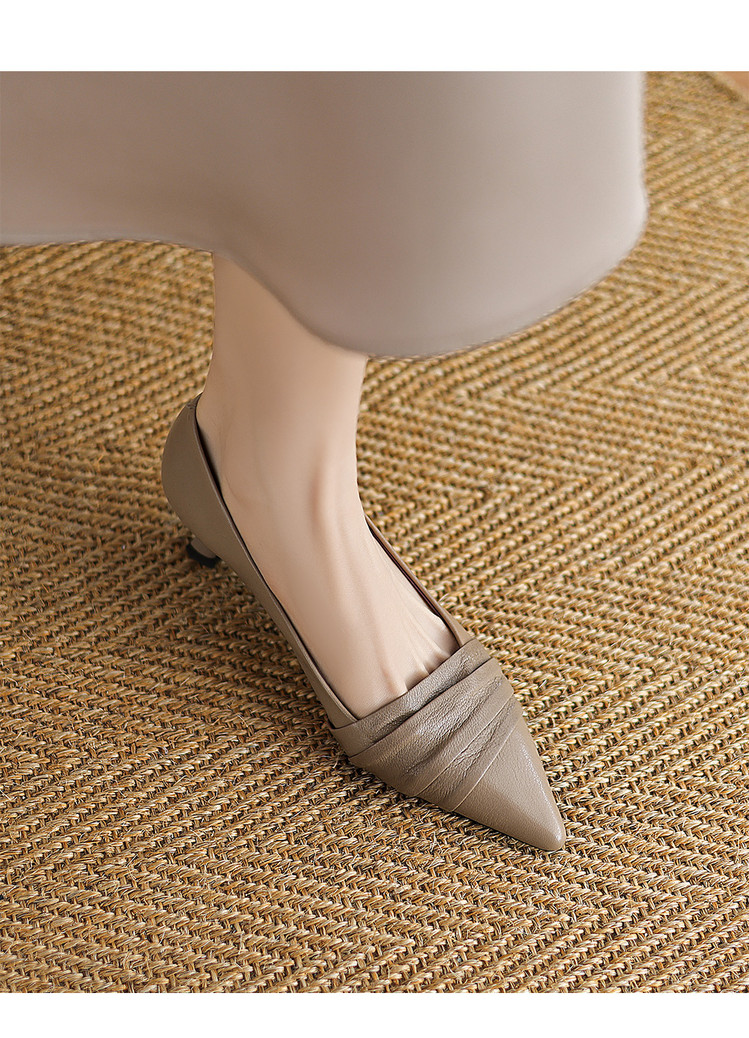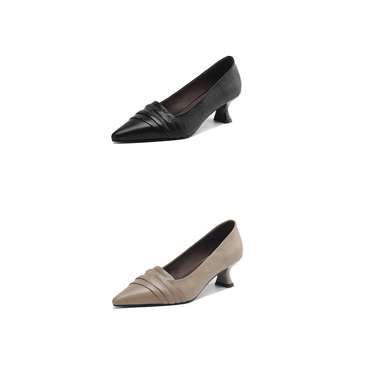 【预售5天】法式浪漫~真皮皱褶粗跟浅口单鞋气质百搭OL高跟鞋女真皮JLY&18-593