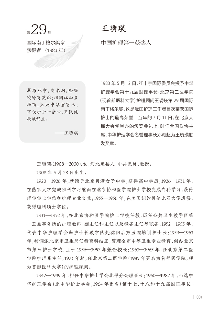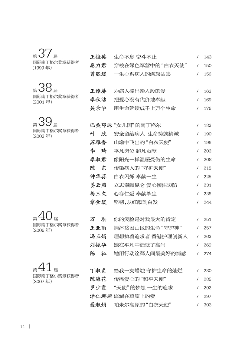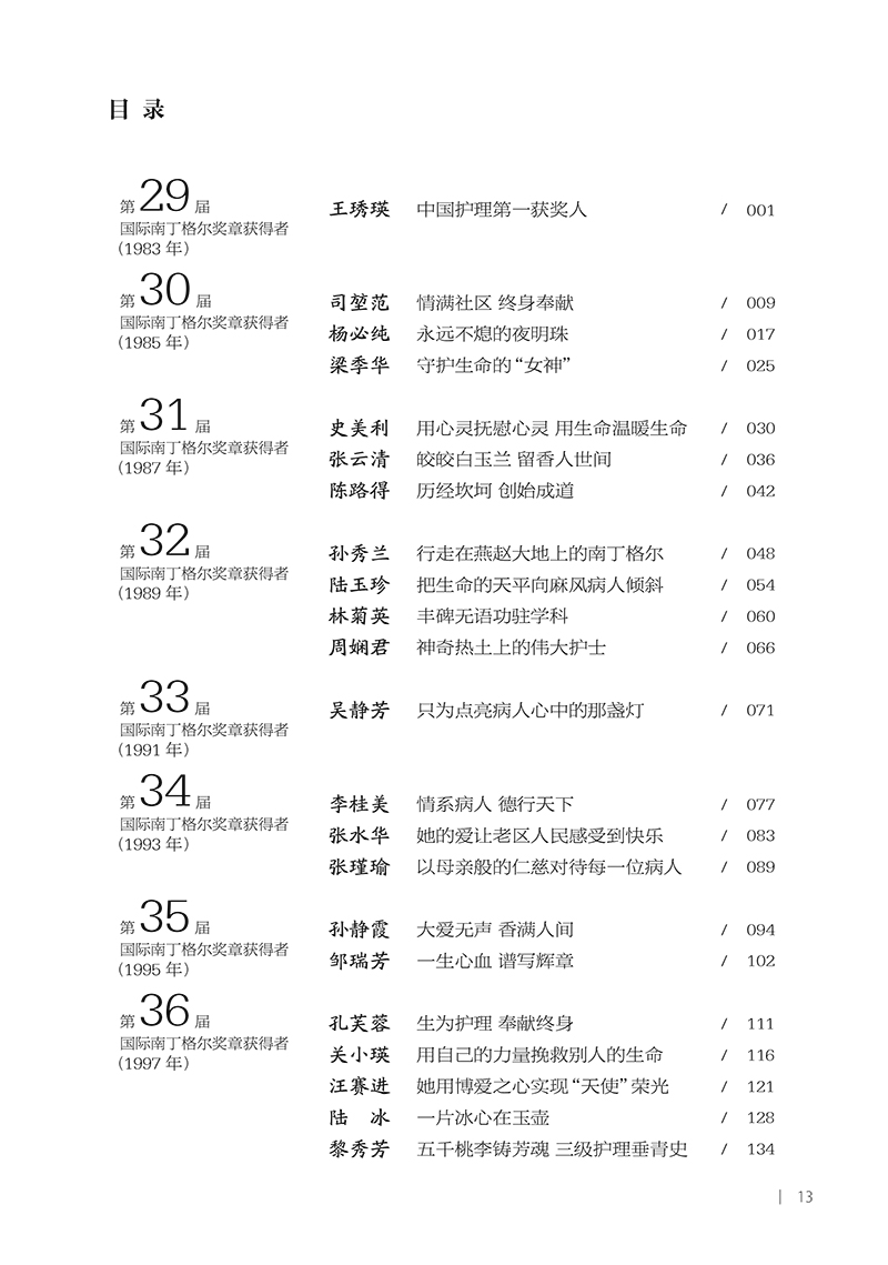 第29届国际南丁格尔奖章获得者(1983 年) 王琇瑛 中国护理第一获奖人 / 001 第30届国际南丁格尔奖章获得者(1985 年) 司堃范 情满社区 终身奉献 / 009 杨必纯 永远不熄的夜明珠 / 017 梁季华 守护生命的“女神” / 025 第31届国际南丁格尔奖章获得者(1987 年) 史美利 用心灵抚慰心灵 用生命温暖生命 / 030 张云清 皎皎白玉兰 留香人世间 / 036 陈路得 历经坎坷 创始成道 / 042 第32届国际南丁格尔奖章获得者(1989 年) 孙秀兰 行走在燕赵大地上的南丁格尔 / 048 陆玉珍 把生命的天平向麻风病人倾斜 / 054 林菊英 丰碑无语功驻学科 / 060 周娴君 神奇热土上的伟大护士 / 066 第33届国际南丁格尔奖章获得者(1991 年) 吴静芳 只为点亮病人心中的那盏灯 / 071 第34届国际南丁格尔奖章获得者(1993 年) 李桂美 情系病人 德行天下 / 077 张水华 她的爱让老区人民感受到快乐 / 083 张瑾瑜 以母亲般的仁慈对待每一位病人 / 089 第35届国际南丁格尔奖章获得者(1995 年) 孙静霞 大爱无声 香满人间 / 094 邹瑞芳 一生心血 谱写辉章 / 102 第36届国际南丁格尔奖章获得者(1997 年) 孔芙蓉 生为护理 奉献终身 / 111 关小瑛 用自己的力量挽救别人的生命 / 116 汪赛进 她用博爱之心实现“天使”荣光 / 121 陆 冰 一片冰心在玉壶 / 128 黎秀芳 五千桃李铸芳魂 三级护理垂青史 / 134 第37届国际南丁格尔奖章获得者(1999 年) 王桂英 生命不息 奋斗不止 / 143 秦力君 穿梭在绿色军营中的“白衣天使” / 150 曾熙媛 一生心系病人的满族姑娘 / 156 第38届国际南丁格尔奖章获得者(2001 年) 王雅屏 为病人捧出亲人般的爱 / 163 李秋洁 把爱心没有代价地奉献 / 169 吴景华 用生命延续成千上万个生命 / 176 第39届国际南丁格尔奖章获得者(2003 年) 巴桑邓珠 “女儿国”的南丁格尔 / 183 叶 欣 安全留给病人 生命铸就精诚 / 190 苏雅香 山坳中飞出的“白衣天使” / 196 李 琦 平凡岗位 超凡贡献 / 202 李淑君 像阳光一样温暖受伤的生命 / 208 陈 东 传染病人的“守护天使” / 215 钟华荪 白衣闪烁 奉献一生 / 225 姜云燕 立志奉献昆仑 爱心倾注边防 / 231 梅玉文 心存仁爱 奉献毕生 / 238 章金媛 坚韧,从红颜到白发 / 244 第40届国际南丁格尔奖章获得者(2005 年) 万 琪 你的笑脸是对我最大的肯定 / 251 王亚丽 情沐贫困山区的生命“守护神” / 257 冯玉娟 理想执着追求者 香港护理创新人 / 263 刘振华 她在平凡中造就了高尚 / 269 陈 征 她用行动诠释人间最美好的情感 / 274 第41届国际南丁格尔奖章获得者(2007 年) 丁淑贞 给我一支蜡烛 守护生命的灿烂 / 280 陈海花 传播爱心的“和平天使” / 285 罗少霞 “天使”的梦想 一生的追求 / 292 泽仁娜姆 流淌在草原上的爱 / 297 聂淑娟 帕米尔高原的“白衣天使” / 302 第42届国际南丁格尔奖章获得者(2009 年) 王文珍 用爱诠释着和谐的真谛 / 307 刘淑媛 白衣素雅 行无所息 / 312 杨 秋 尽最大努力做好最平凡的事 / 320 张桂英 用特别的爱温暖迷失的心灵 / 326 鲜继淑 无怨无悔尽天职 毕生愿做“提灯人” / 332 潘美儿 山坳人生 照样出彩 / 337 第43届国际南丁格尔奖章获得者(2011 年) 孙玉凤 麻风病病人的贴心“天使” / 343 吴欣娟 给人类以关怀 给病人以力量 / 349 张利岩 倾心灾害护理 书写大爱人生 / 356 陈声容 爱,可以这样深沉与美丽 / 362 陈荣秀 用一生去爱肿瘤病人 / 368 赵生秀 青藏高原的“提灯女神” / 374 姜小鹰 守护百姓健康的“白衣铁人” / 385 索玉梅 踏遍青海山山水水的阳光“天使” / 392 第44届国际南丁格尔奖章获得者(2013 年) 王克荣 为艾滋病病人撑起爱的天空 / 397 王海文 从陆地到海洋 她的爱无疆界 / 402 成翼娟 最自豪的是为群众解除疾苦 / 410 邹德凤 民众的超级义工 / 417 林崇绥 全情投入,塑造护理艺术 / 422 蔡红霞 倾注仁心,大爱拨亮盏盏心灯 / 427 第45届国际南丁格尔奖章获得者(2015 年) 王新华 扎根“传染世界”的美丽“天使” / 434 邢彩霞 用坚守和爱心托举草原生命的太阳 / 441 杜丽群 生命裂隙中的绝地阳光 / 447 宋 静 柘城人民的骄傲 为爱坚守的“天使” / 454 赵庆华 让爱如蒲公英般播散 / 460 第46届国际南丁格尔奖章获得者(2017 年) 李秀华 我愿做护理事业的“提灯人” / 466 杨 丽 初心永驻 玉兰花开 / 473 杨 辉 三十八载护理路 心系行业促发展 / 480 杨惠云 “阳光天使”点亮病人康复之路 / 488 殷艳玲 让护理之光永伴生命 / 494 游建平 为草当作兰 为木当作松 / 500 第47届国际南丁格尔奖章获得者(2019 年) 李 红 用专业知识照顾好每一位病人 / 507 注:获奖者按获奖先后顺序与姓氏笔画排序