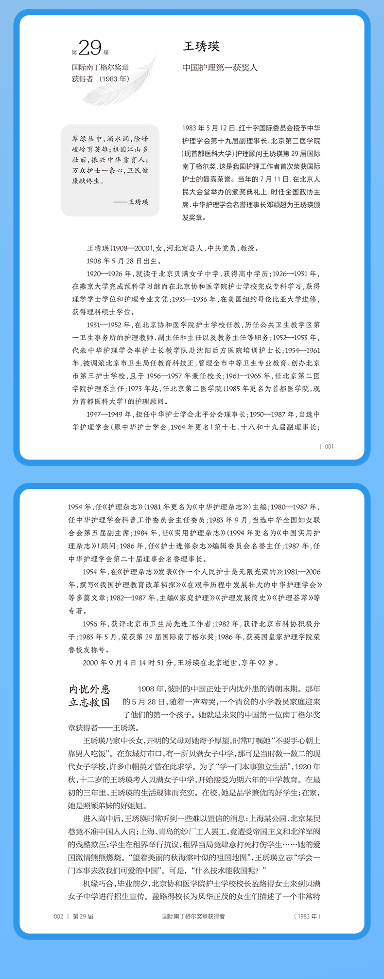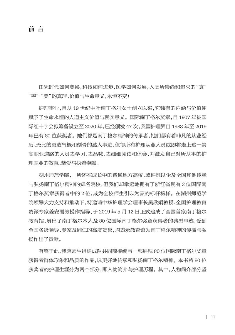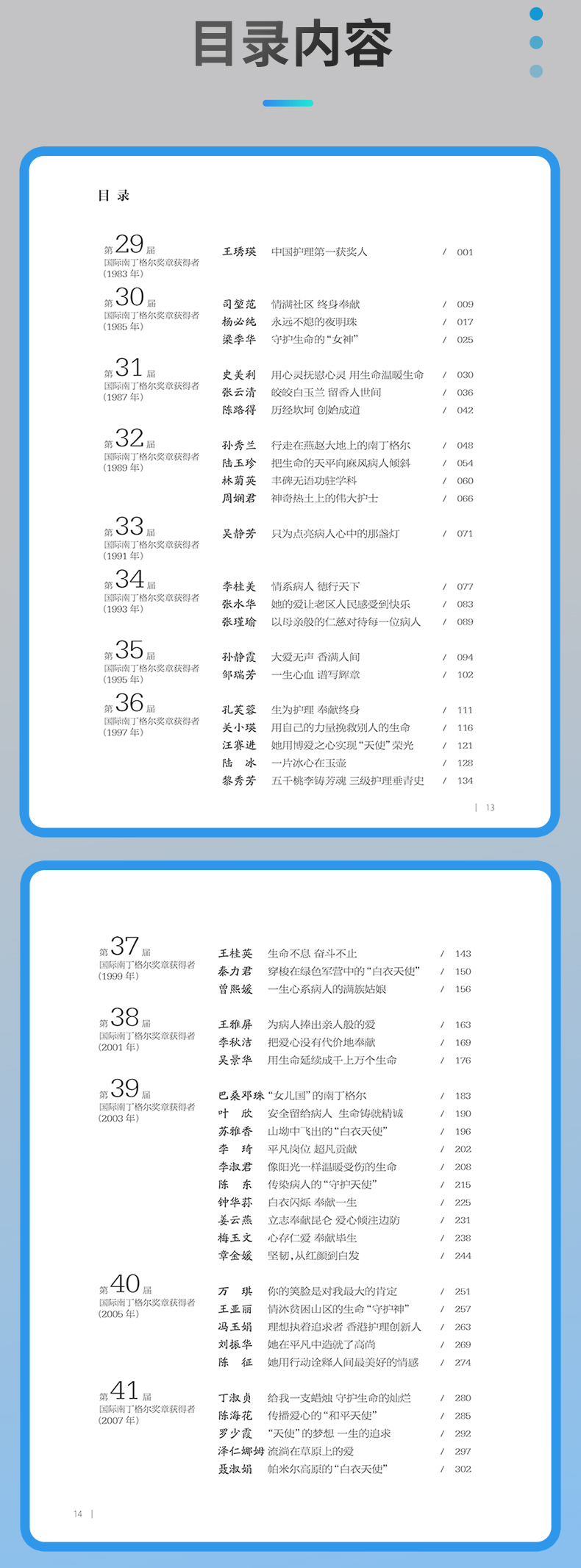 第29届国际南丁格尔奖章获得者(1983 年) 王琇瑛 中国护理第一获奖人 / 001 第30届国际南丁格尔奖章获得者(1985 年) 司堃范 情满社区 终身奉献 / 009 杨必纯 永远不熄的夜明珠 / 017 梁季华 守护生命的“女神” / 025 第31届国际南丁格尔奖章获得者(1987 年) 史美利 用心灵抚慰心灵 用生命温暖生命 / 030 张云清 皎皎白玉兰 留香人世间 / 036 陈路得 历经坎坷 创始成道 / 042 第32届国际南丁格尔奖章获得者(1989 年) 孙秀兰 行走在燕赵大地上的南丁格尔 / 048 陆玉珍 把生命的天平向麻风病人倾斜 / 054 林菊英 丰碑无语功驻学科 / 060 周娴君 神奇热土上的伟大护士 / 066 第33届国际南丁格尔奖章获得者(1991 年) 吴静芳 只为点亮病人心中的那盏灯 / 071 第34届国际南丁格尔奖章获得者(1993 年) 李桂美 情系病人 德行天下 / 077 张水华 她的爱让老区人民感受到快乐 / 083 张瑾瑜 以母亲般的仁慈对待每一位病人 / 089 第35届国际南丁格尔奖章获得者(1995 年) 孙静霞 大爱无声 香满人间 / 094 邹瑞芳 一生心血 谱写辉章 / 102 第36届国际南丁格尔奖章获得者(1997 年) 孔芙蓉 生为护理 奉献终身 / 111 关小瑛 用自己的力量挽救别人的生命 / 116 汪赛进 她用博爱之心实现“天使”荣光 / 121 陆 冰 一片冰心在玉壶 / 128 黎秀芳 五千桃李铸芳魂 三级护理垂青史 / 134 第37届国际南丁格尔奖章获得者(1999 年) 王桂英 生命不息 奋斗不止 / 143 秦力君 穿梭在绿色军营中的“白衣天使” / 150 曾熙媛 一生心系病人的满族姑娘 / 156 第38届国际南丁格尔奖章获得者(2001 年) 王雅屏 为病人捧出亲人般的爱 / 163 李秋洁 把爱心没有代价地奉献 / 169 吴景华 用生命延续成千上万个生命 / 176 第39届国际南丁格尔奖章获得者(2003 年) 巴桑邓珠 “女儿国”的南丁格尔 / 183 叶 欣 安全留给病人 生命铸就精诚 / 190 苏雅香 山坳中飞出的“白衣天使” / 196 李 琦 平凡岗位 超凡贡献 / 202 李淑君 像阳光一样温暖受伤的生命 / 208 陈 东 传染病人的“守护天使” / 215 钟华荪 白衣闪烁 奉献一生 / 225 姜云燕 立志奉献昆仑 爱心倾注边防 / 231 梅玉文 心存仁爱 奉献毕生 / 238 章金媛 坚韧,从红颜到白发 / 244 第40届国际南丁格尔奖章获得者(2005 年) 万 琪 你的笑脸是对我最大的肯定 / 251 王亚丽 情沐贫困山区的生命“守护神” / 257 冯玉娟 理想执着追求者 香港护理创新人 / 263 刘振华 她在平凡中造就了高尚 / 269 陈 征 她用行动诠释人间最美好的情感 / 274 第41届国际南丁格尔奖章获得者(2007 年) 丁淑贞 给我一支蜡烛 守护生命的灿烂 / 280 陈海花 传播爱心的“和平天使” / 285 罗少霞 “天使”的梦想 一生的追求 / 292 泽仁娜姆 流淌在草原上的爱 / 297 聂淑娟 帕米尔高原的“白衣天使” / 302 第42届国际南丁格尔奖章获得者(2009 年) 王文珍 用爱诠释着和谐的真谛 / 307 刘淑媛 白衣素雅 行无所息 / 312 杨 秋 尽最大努力做好最平凡的事 / 320 张桂英 用特别的爱温暖迷失的心灵 / 326 鲜继淑 无怨无悔尽天职 毕生愿做“提灯人” / 332 潘美儿 山坳人生 照样出彩 / 337 第43届国际南丁格尔奖章获得者(2011 年) 孙玉凤 麻风病病人的贴心“天使” / 343 吴欣娟 给人类以关怀 给病人以力量 / 349 张利岩 倾心灾害护理 书写大爱人生 / 356 陈声容 爱,可以这样深沉与美丽 / 362 陈荣秀 用一生去爱肿瘤病人 / 368 赵生秀 青藏高原的“提灯女神” / 374 姜小鹰 守护百姓健康的“白衣铁人” / 385 索玉梅 踏遍青海山山水水的阳光“天使” / 392 第44届国际南丁格尔奖章获得者(2013 年) 王克荣 为艾滋病病人撑起爱的天空 / 397 王海文 从陆地到海洋 她的爱无疆界 / 402 成翼娟 最自豪的是为群众解除疾苦 / 410 邹德凤 民众的超级义工 / 417 林崇绥 全情投入,塑造护理艺术 / 422 蔡红霞 倾注仁心,大爱拨亮盏盏心灯 / 427 第45届国际南丁格尔奖章获得者(2015 年) 王新华 扎根“传染世界”的美丽“天使” / 434 邢彩霞 用坚守和爱心托举草原生命的太阳 / 441 杜丽群 生命裂隙中的绝地阳光 / 447 宋 静 柘城人民的骄傲 为爱坚守的“天使” / 454 赵庆华 让爱如蒲公英般播散 / 460 第46届国际南丁格尔奖章获得者(2017 年) 李秀华 我愿做护理事业的“提灯人” / 466 杨 丽 初心永驻 玉兰花开 / 473 杨 辉 三十八载护理路 心系行业促发展 / 480 杨惠云 “阳光天使”点亮病人康复之路 / 488 殷艳玲 让护理之光永伴生命 / 494 游建平 为草当作兰 为木当作松 / 500 第47届国际南丁格尔奖章获得者(2019 年) 李 红 用专业知识照顾好每一位病人 / 507 注:获奖者按获奖先后顺序与姓氏笔画排序