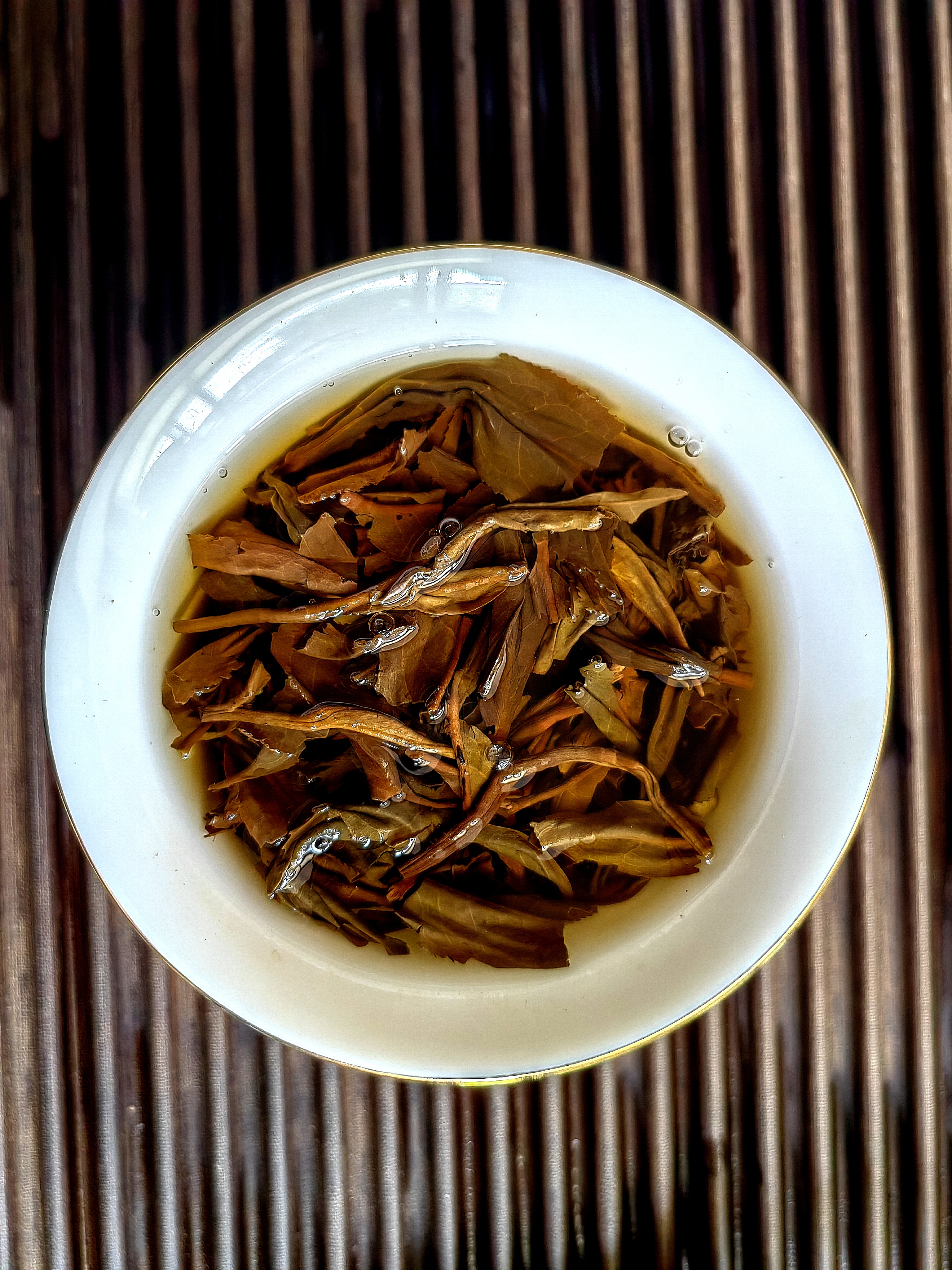 茶汤呈现老茶的琥珀色;沸水注入既能闻到自然陈化得陈香与蜜香,茶汤入口感觉非常的香醇,香气比滋味更快的充满整个口腔,滋味是从舌头中央满满延伸出来,口感已经没有新茶的清冽,但是冲击力很强,茶汤覆盖的地方瞬间就把味蕾激活了,蜜香、陈香、木质香融合在一起;回甘生津让口腔变的更加甜润,喝下去之后整个口腔剩下的全是香醇和甜润感,并且持续时间非常久!整泡喝完谈吐间感觉都是香醇甜蜜,这款可以说是日常最爱喝的茶了!